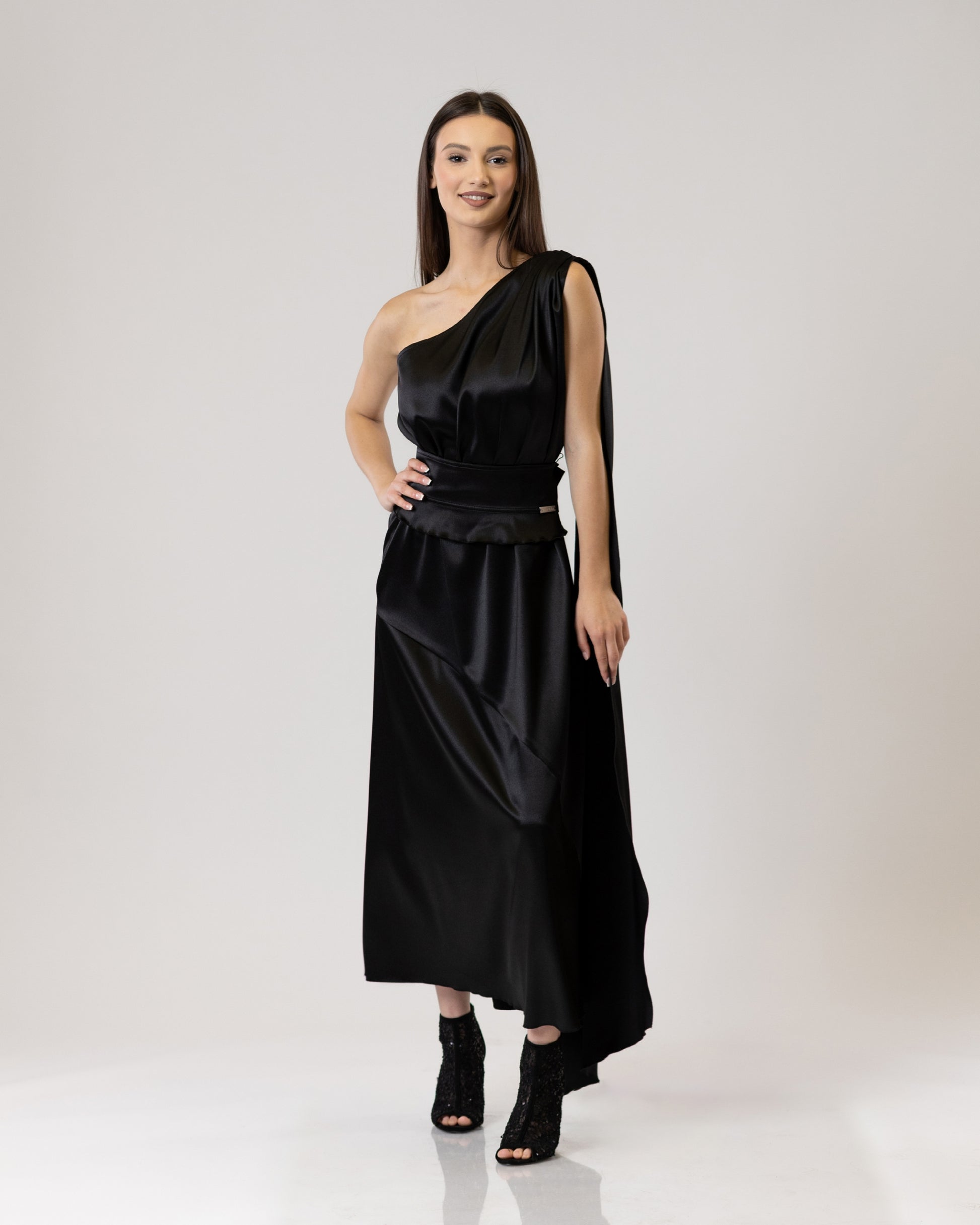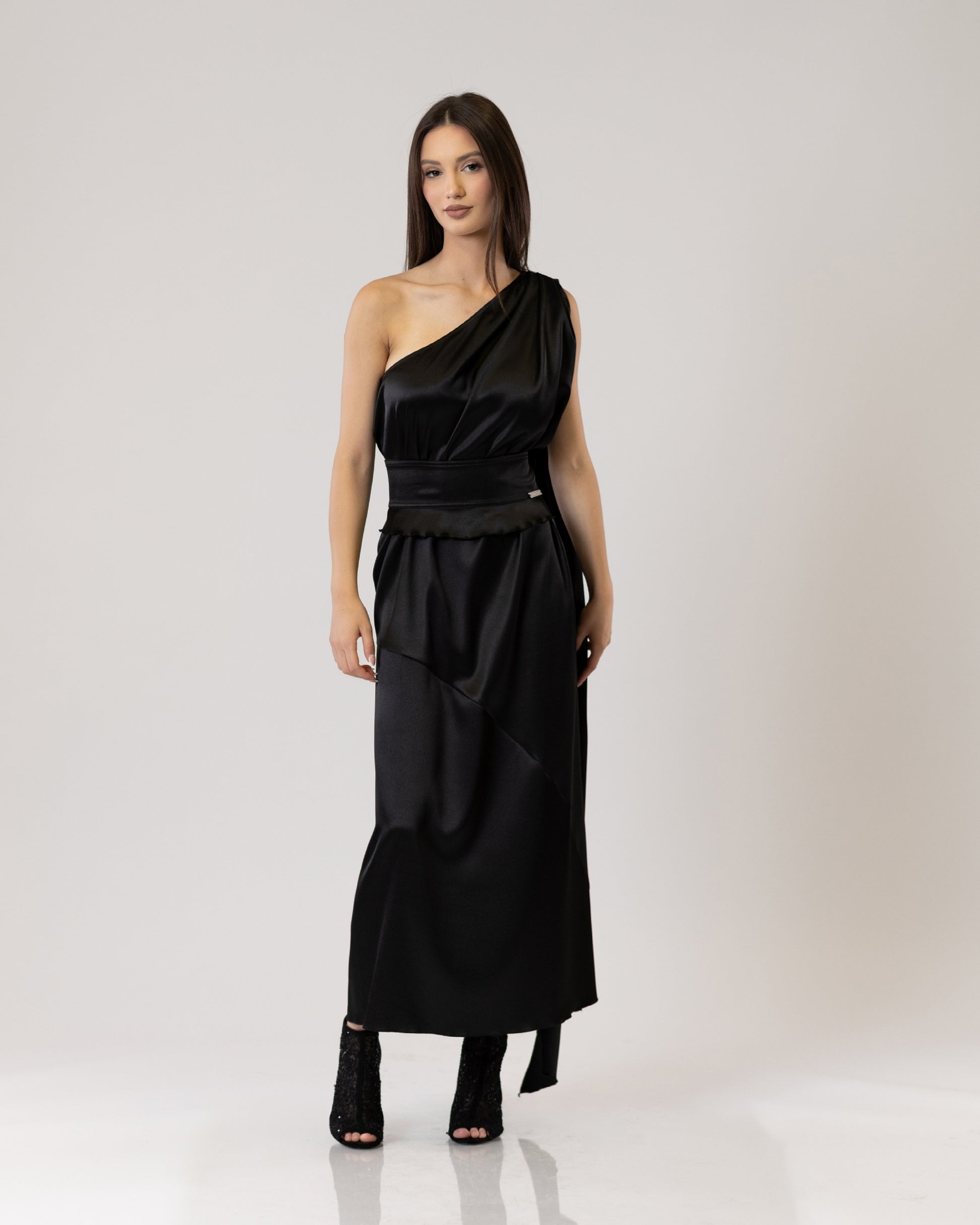 Discover the elegance of refined minimalism with the Allegra dress — a sophisticated creation crafted from premium satin that drapes effortlessly over the silhouette. Featuring an asymmetrical one-shoulder neckline, delicate waist detailing, and a soft side cascade, this midi-length design brings timeless charm with a modern edge.