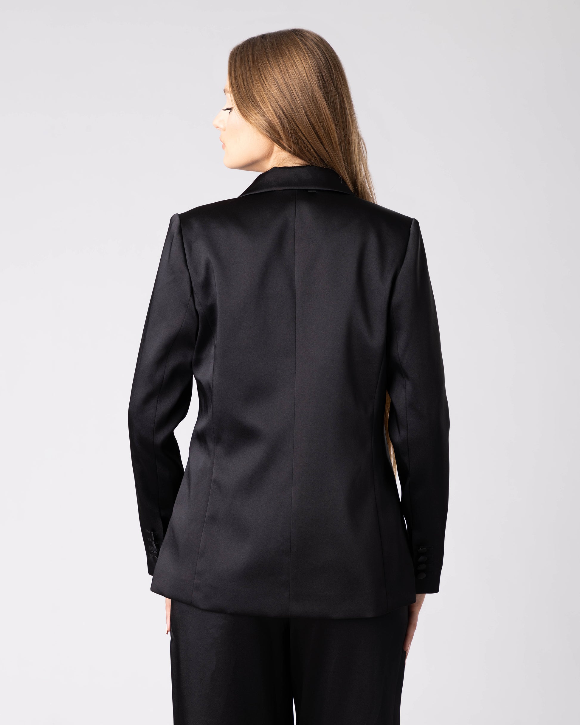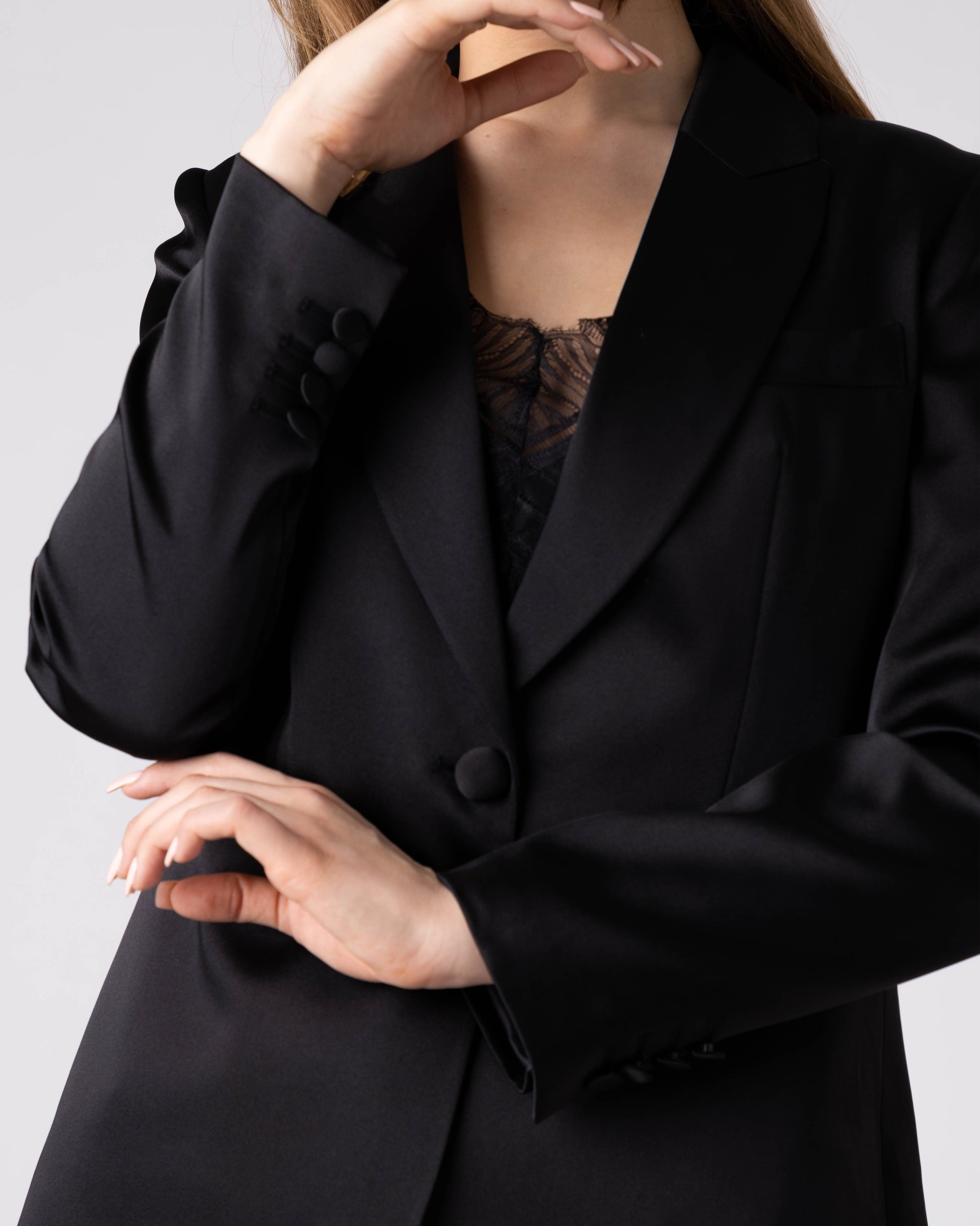 Горниот дел ја следи формата со јасна конструкција и чисти ревери, создавајќи стабилна и смирена силуета. Долниот дел ја продолжува линијата со природен пад и балансирана тежина.