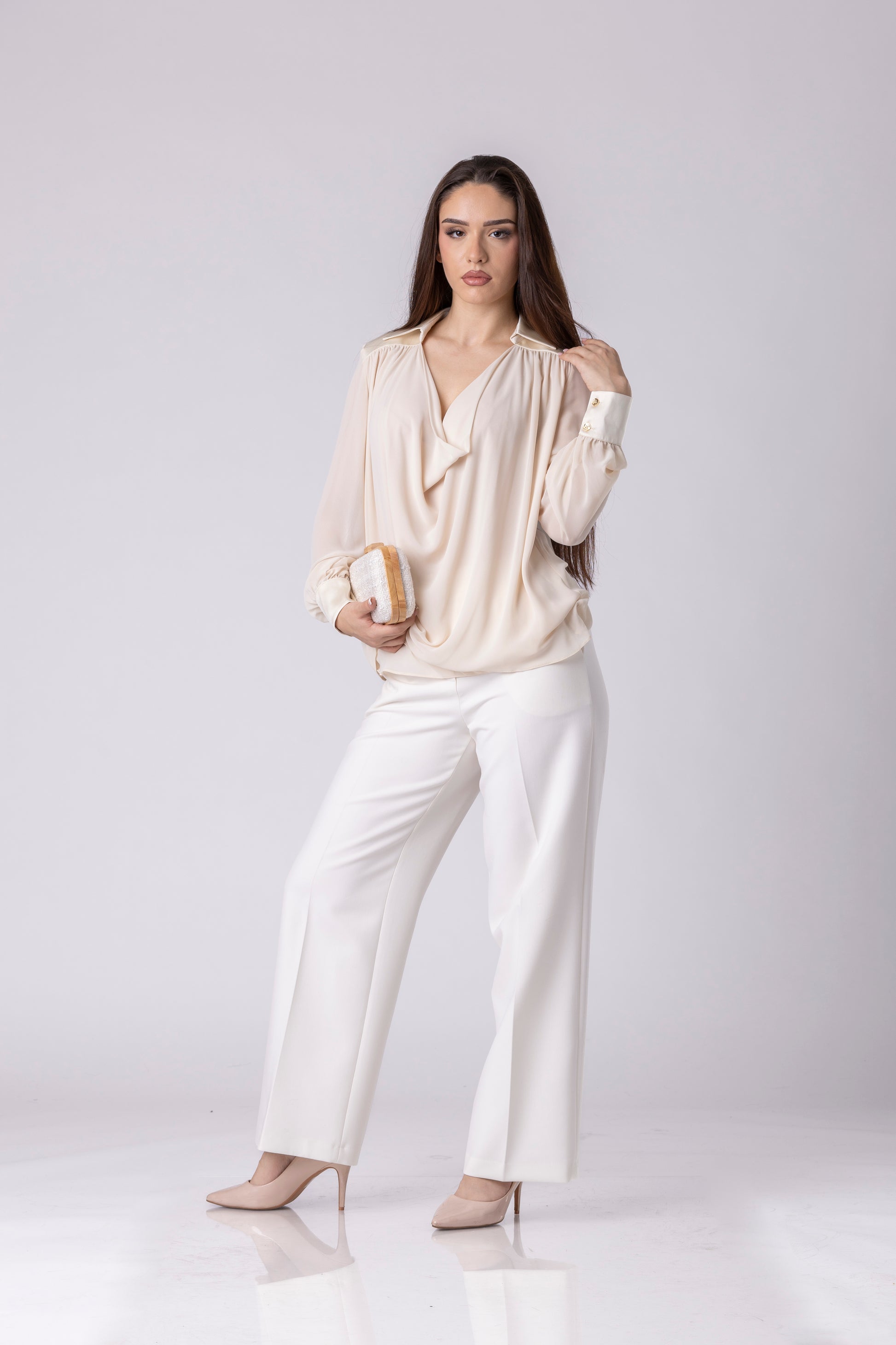 Averin блузата е изработена со чист, флуиден крој што природно паѓа по линијата на телото. Предниот дел е обликуван со мек драпирачки отвор, кој создава контролирана длабочина без нагласување. Рамената се лесно структурирани со суптилни набори што додаваат дефиниција без крутост.