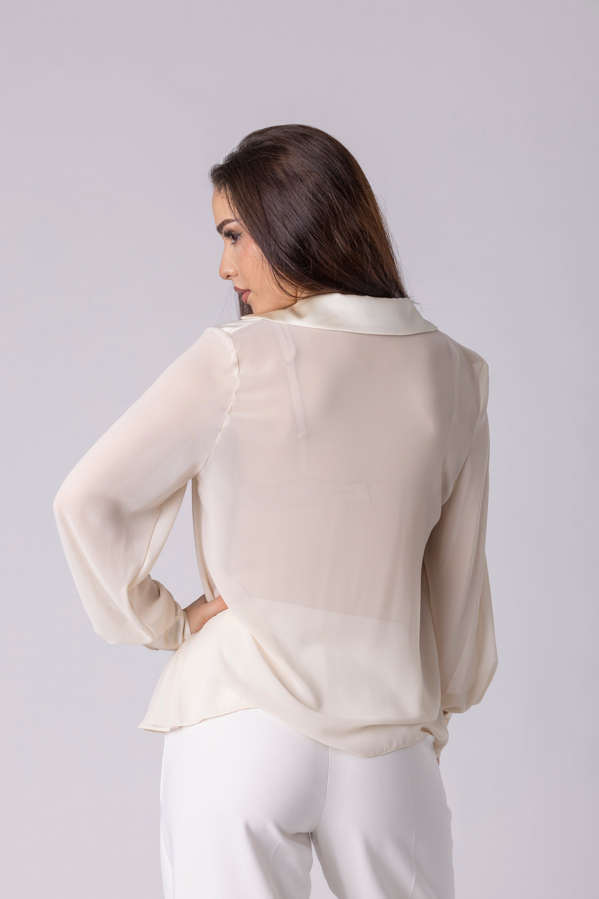 Материјалот е лесен и полутранспарентен, со мазна текстура и стабилен пад. Долгите ракави завршуваат со манжетни и фино закопчување, додека задниот дел е чист, со минимално отворче под јаката што ја задржува линијата мирна и уредна.