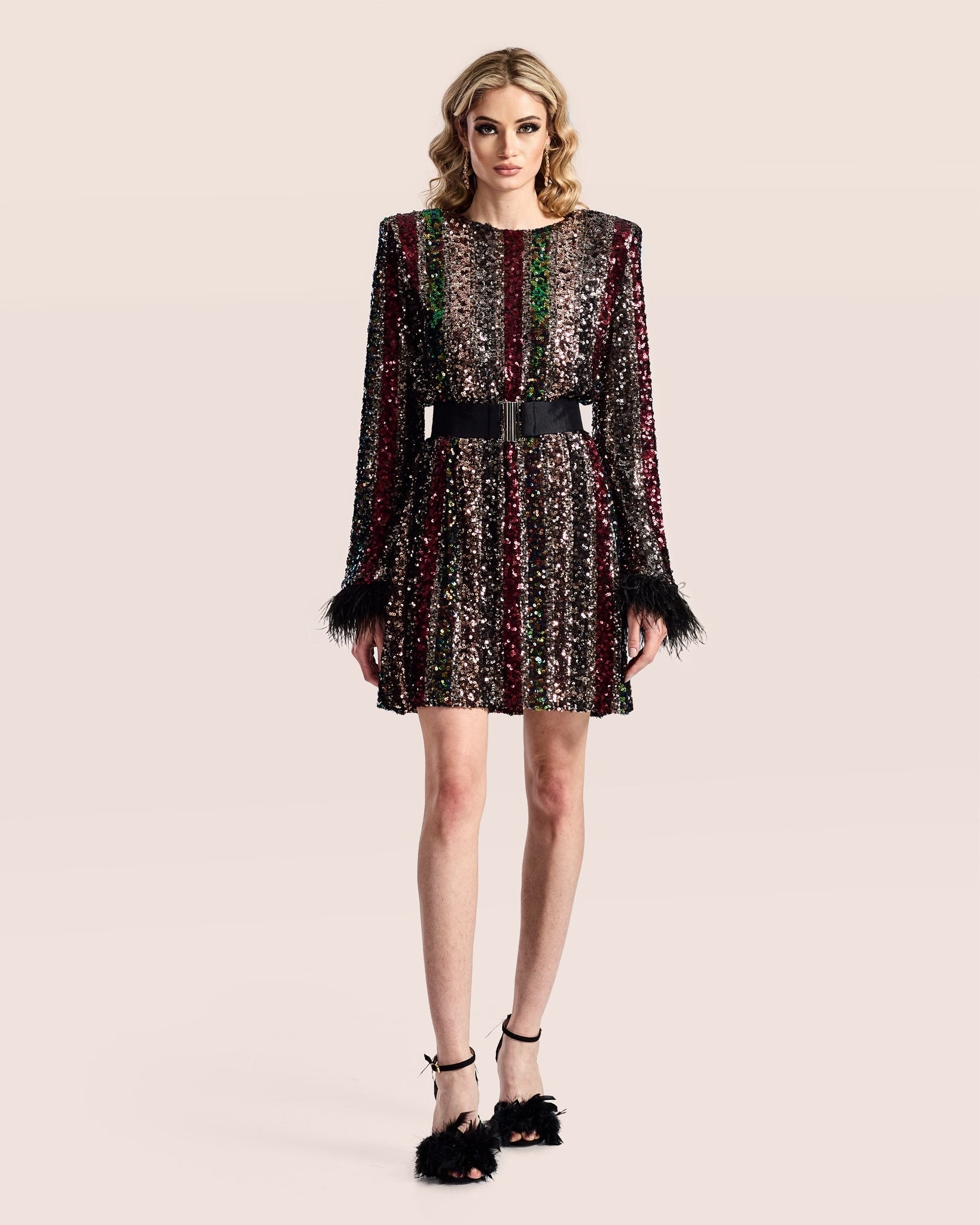 The Feather-Trim Party Dress is a vivacious embodiment of party-ready fashion with a hint of opulent detailing. This dress is a textured tapestry of multicolored sequins, each meticulously sewn to create a sparkling spectacle that mirrors the energy of a festive soiree.