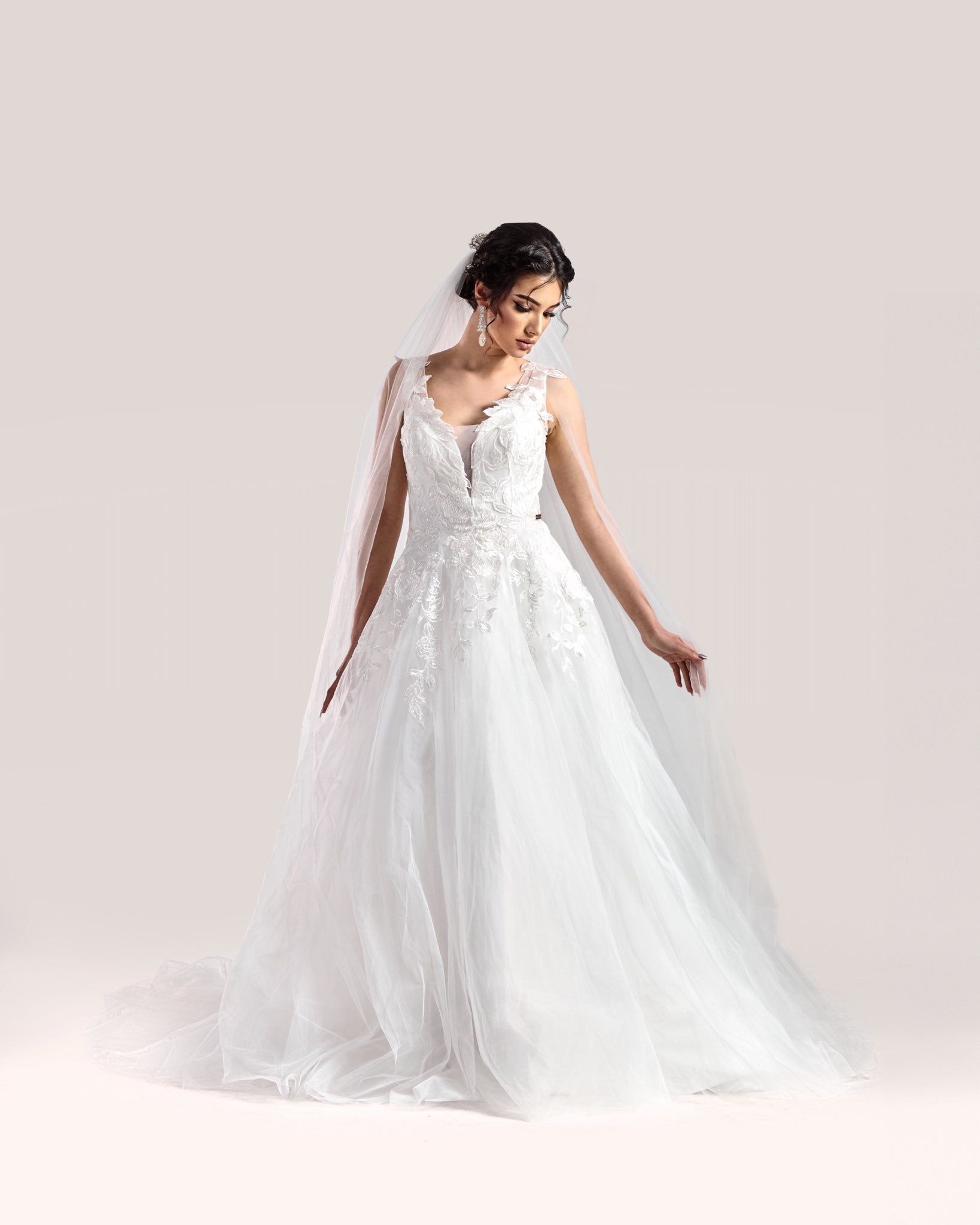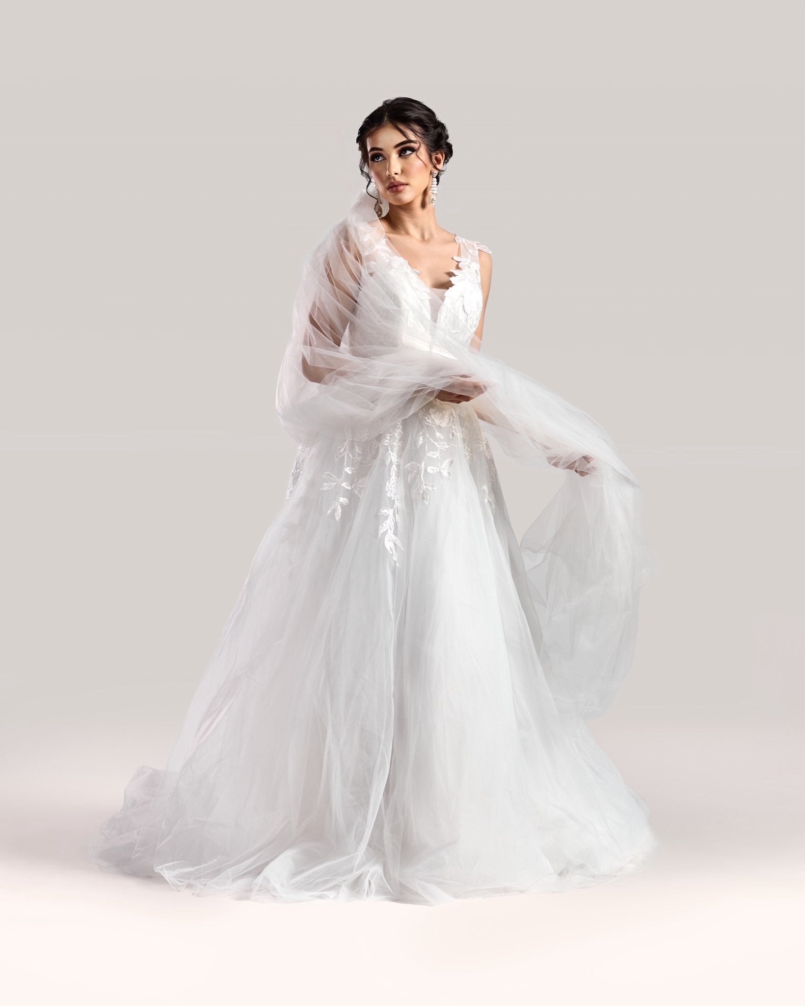 The gown's cascading skirt is a dreamy expanse of layered tulle that seems to float as if caught in a gentle winter breeze. The subtle sparkle within the fabric mimics the glint of sunlight on snow, ensuring the bride shimmers with every step she takes.