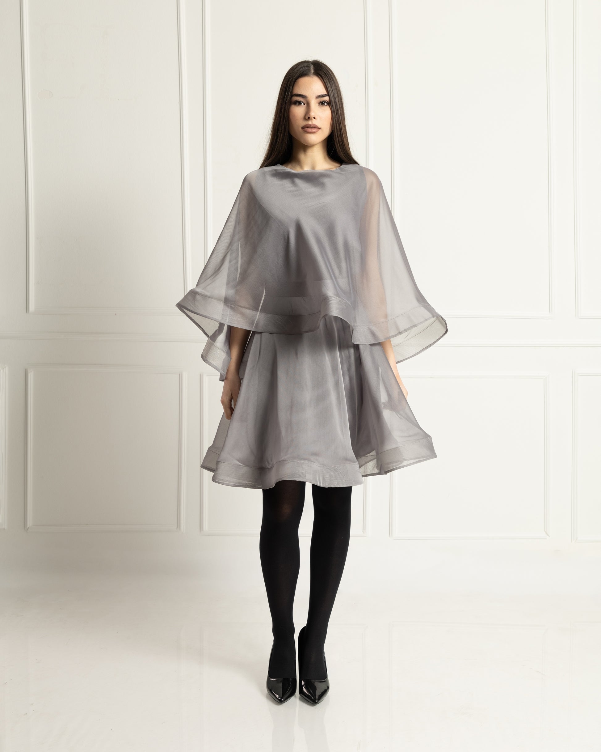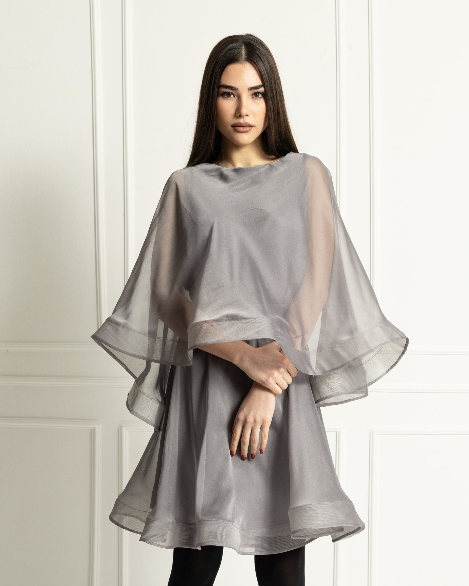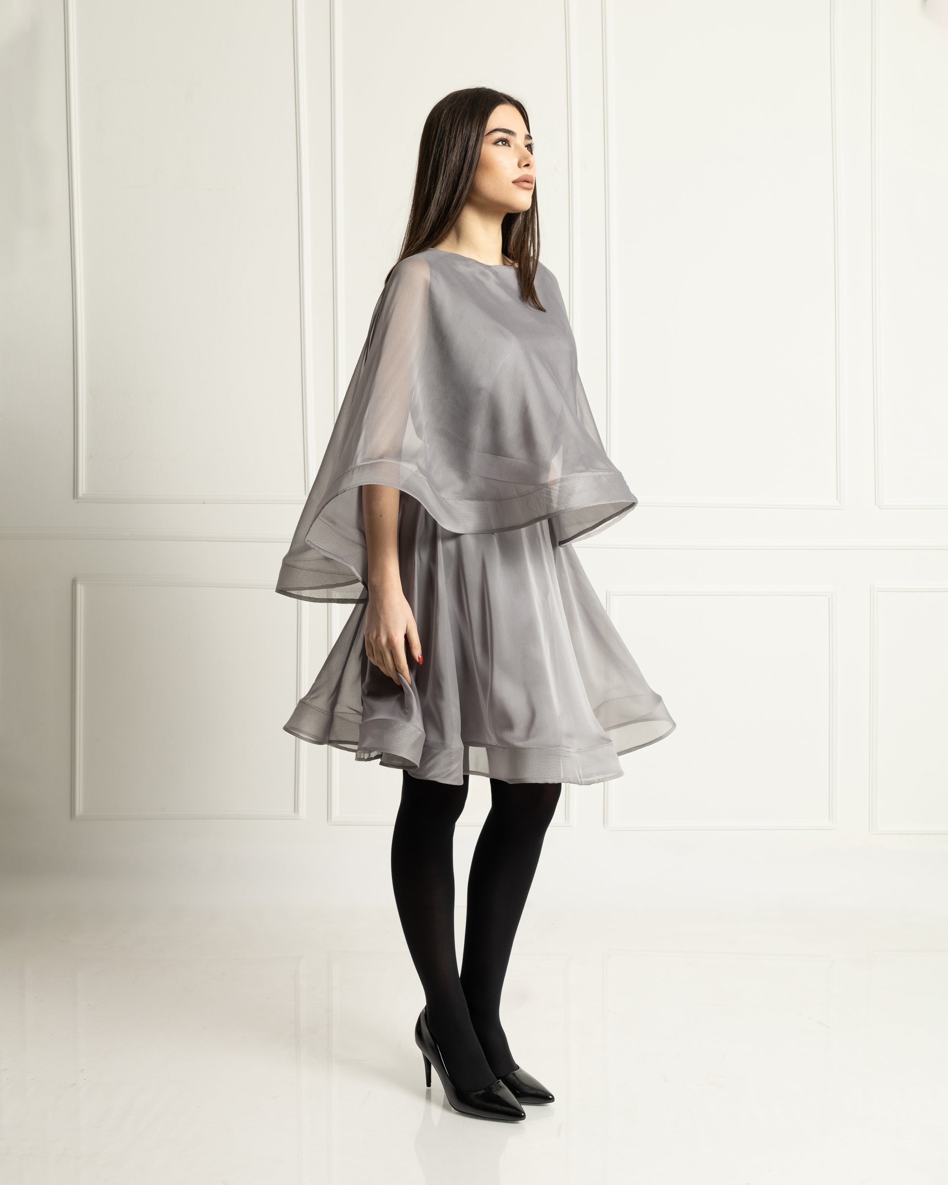 The cape-like sleeves add a touch of whimsy and movement, while the above-the-knee length ensures a modern, versatile look. Paired effortlessly with tights or worn alone, this piece is ideal for sophisticated occasions or when you want to channel timeless charm with a contemporary twist.