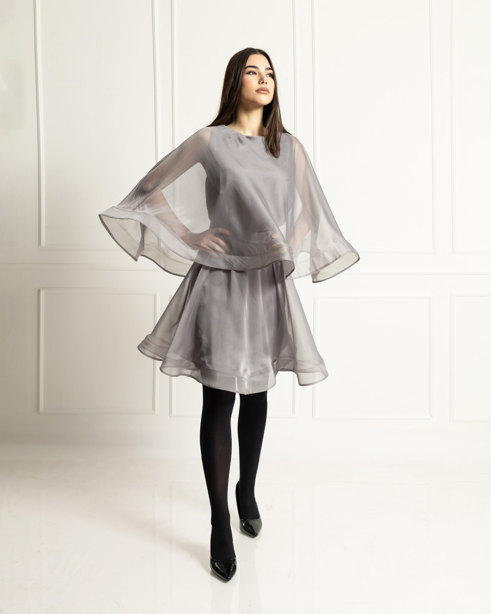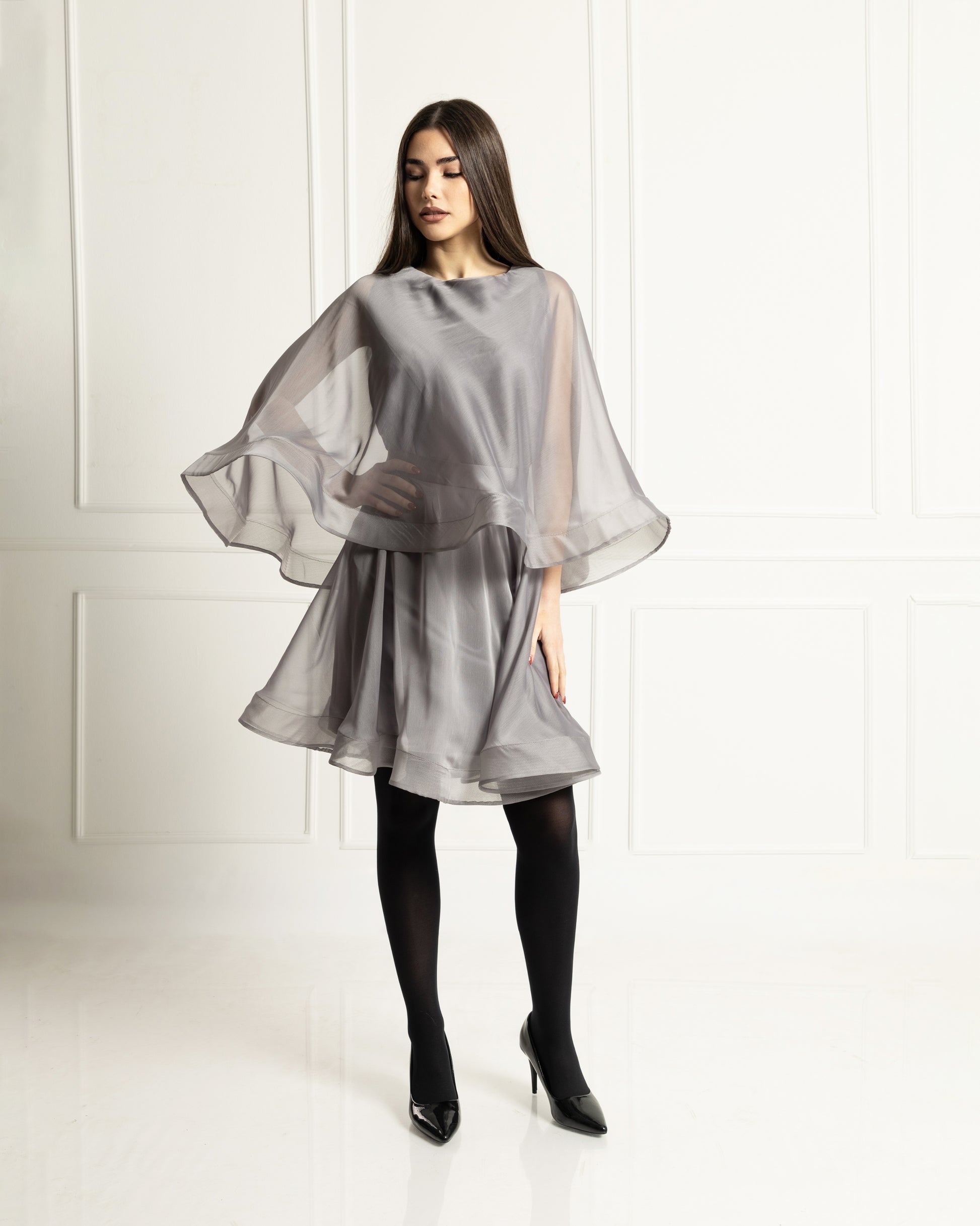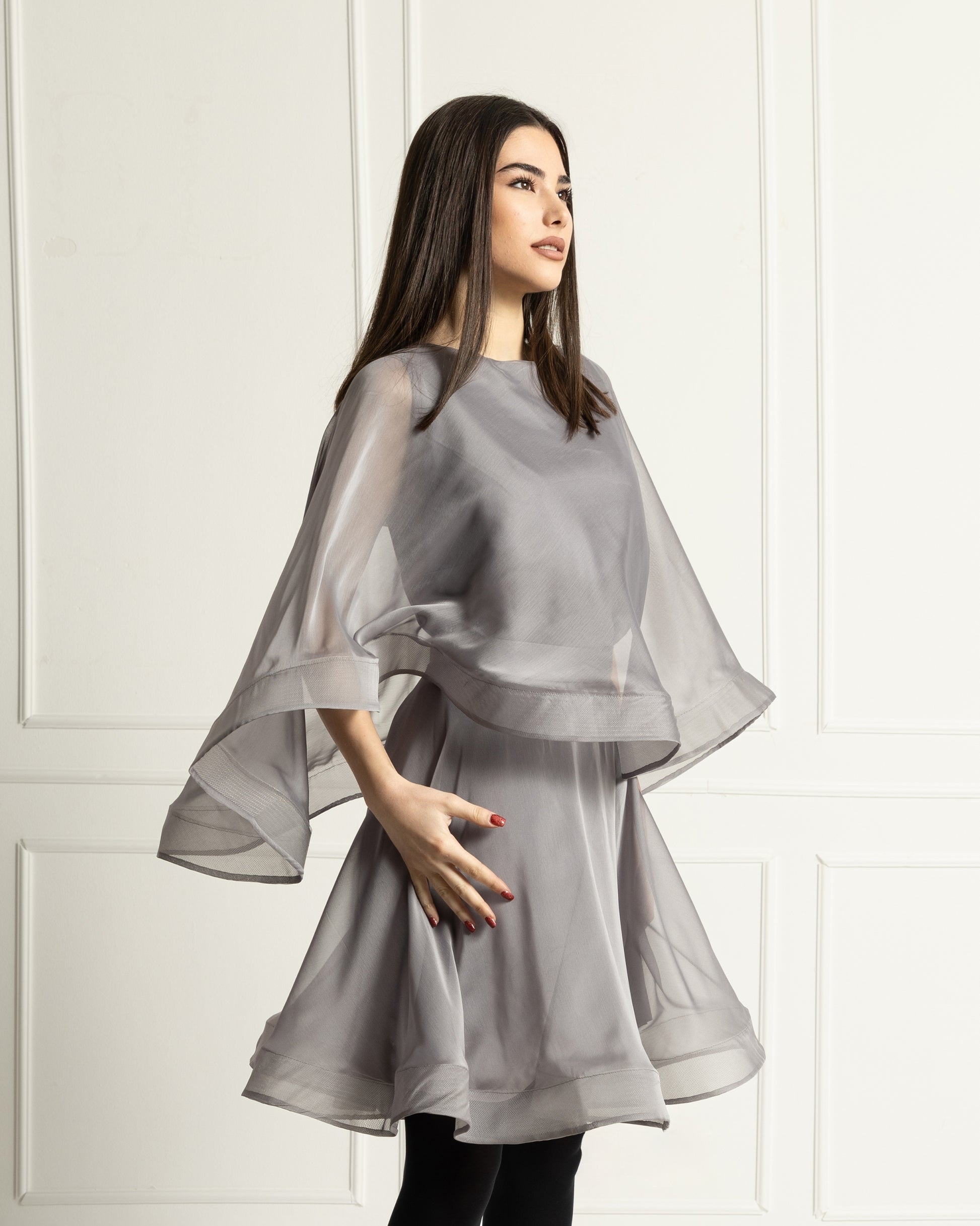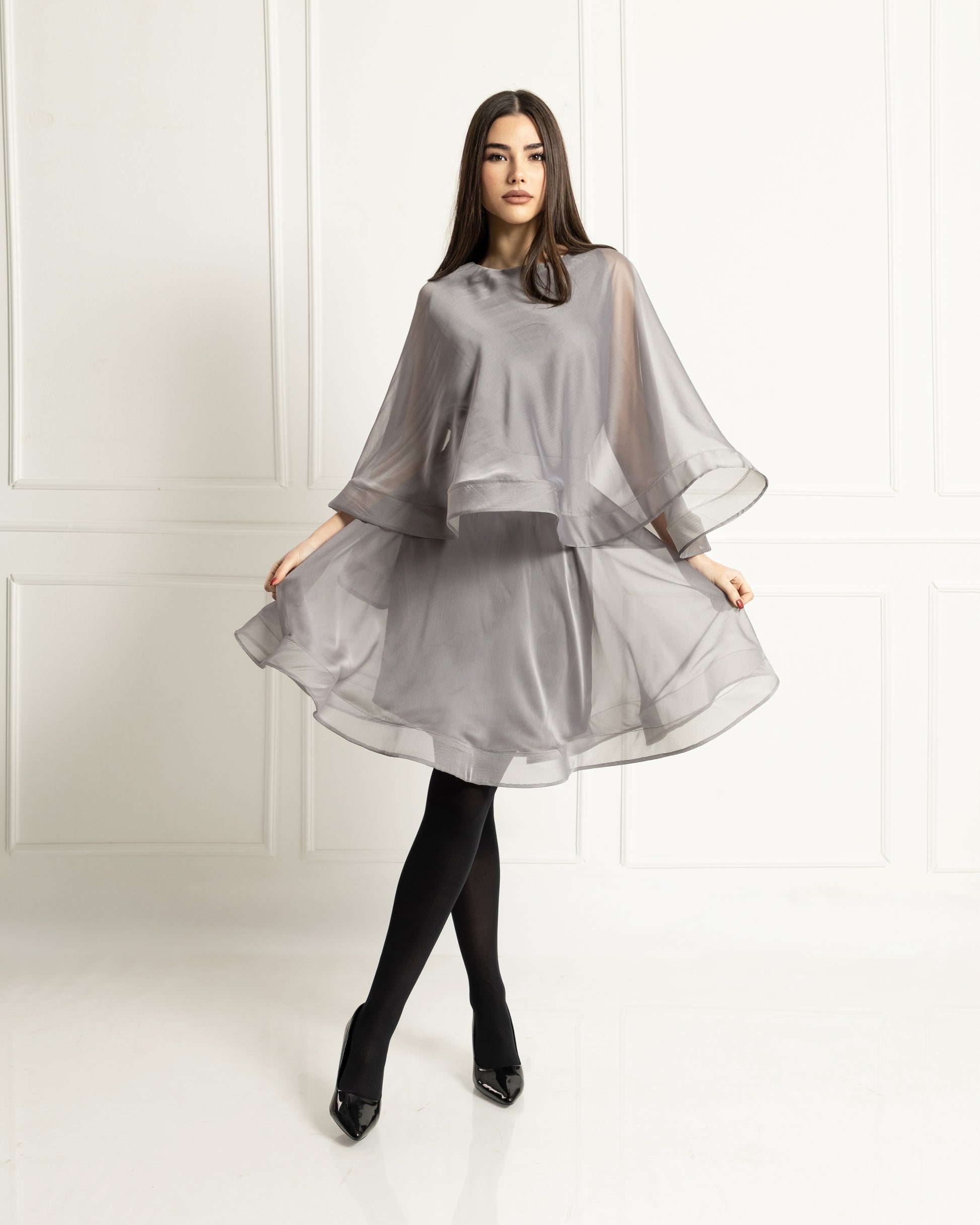 The cape-like sleeves add a touch of whimsy and movement, while the above-the-knee length ensures a modern, versatile look. Paired effortlessly with tights or worn alone, this piece is ideal for sophisticated occasions or when you want to channel timeless charm with a contemporary twist.