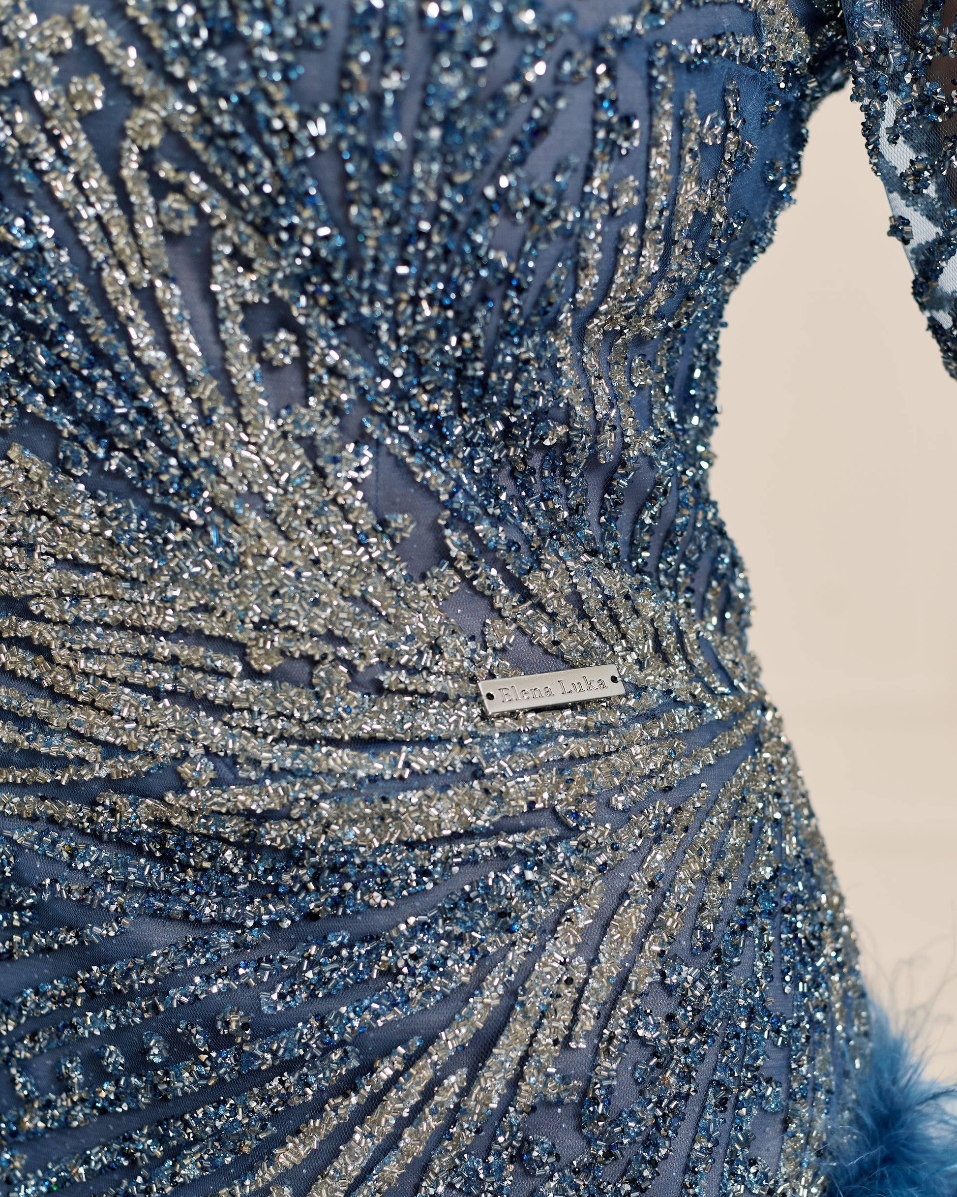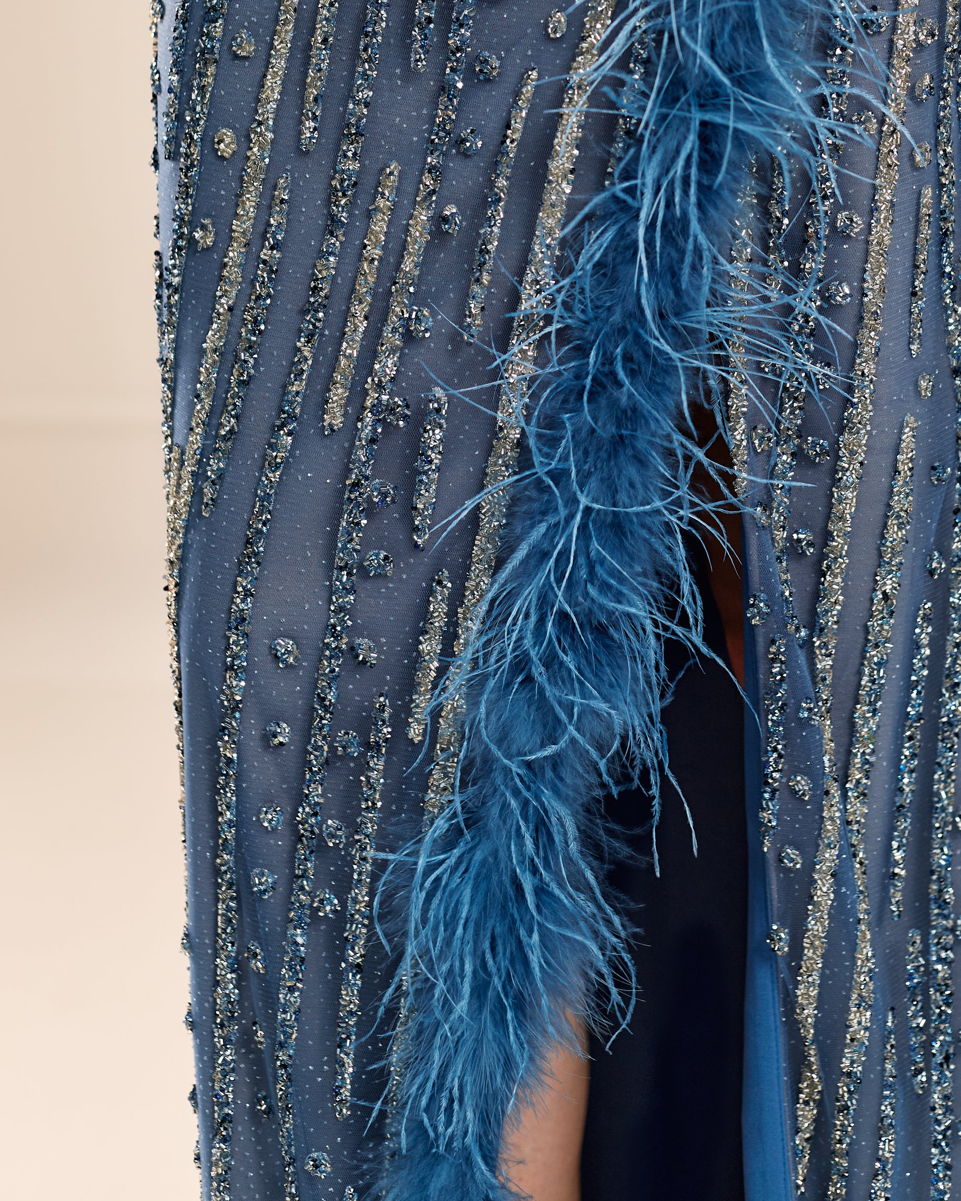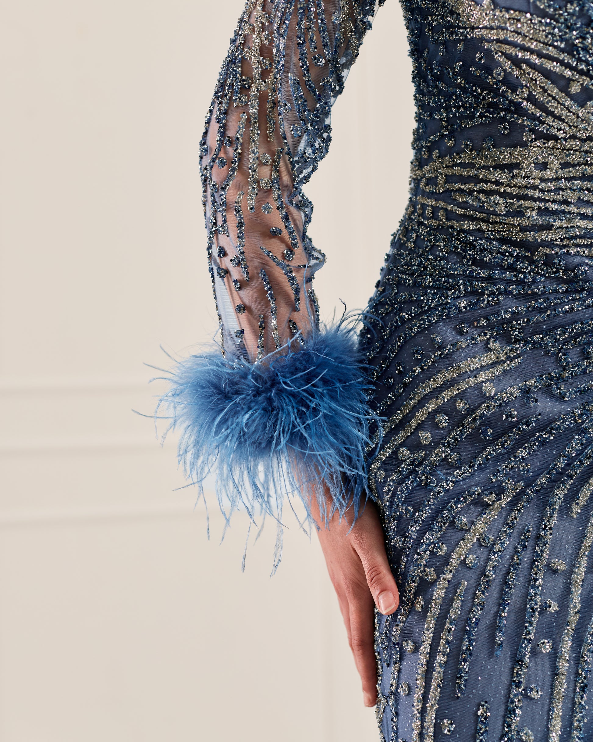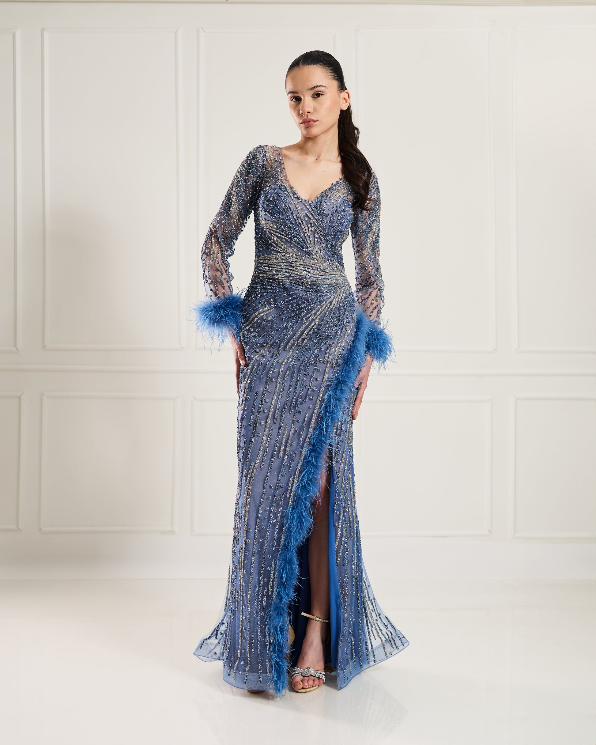 The Blue Symphony Gown is a masterful blend of vintage glamour and modern allure. Crafted from luxurious blue tulle and adorned with intricate beadwork and shimmering sequins, this gown captivates with its movement and detail. The elegant V-neckline and fitted long sleeves are accented by playful feather embellishments at the cuffs and along the daring front slit, adding a touch of dramatic flair. Perfect for grand soirées, gala evenings, or red carpet moments, this gown embodies confidence, sophistication, and a touch of old Hollywood charm.