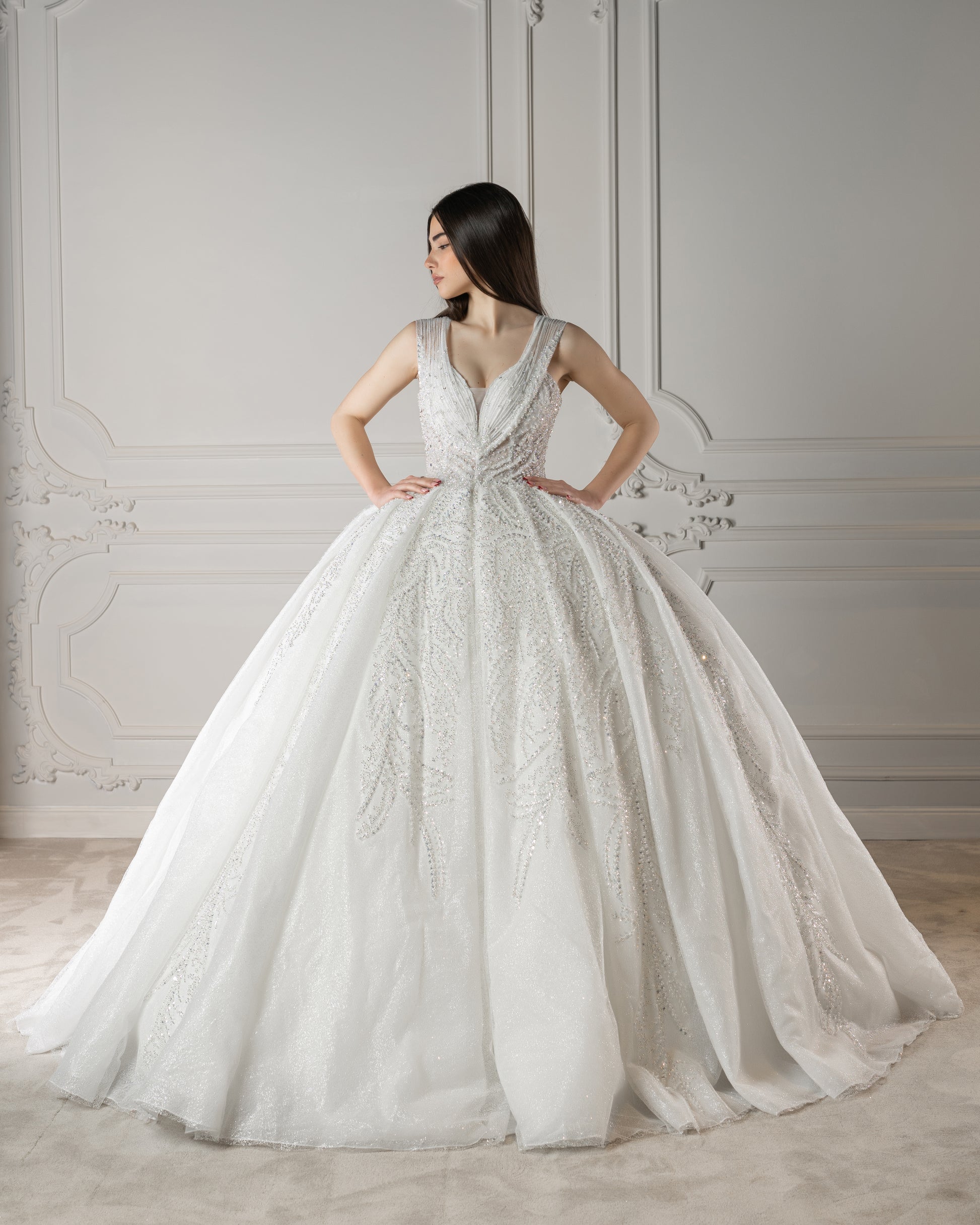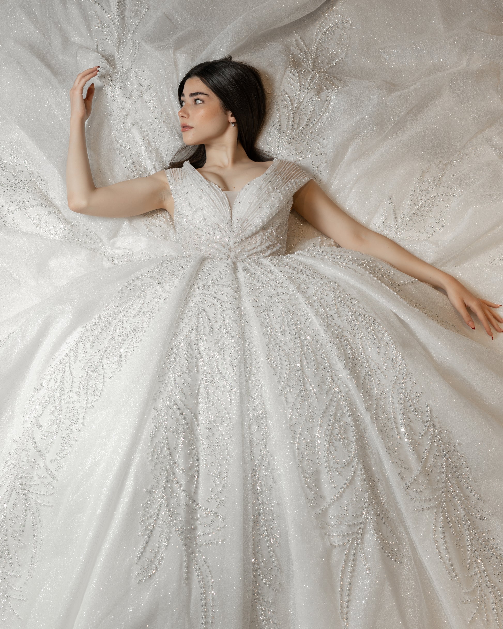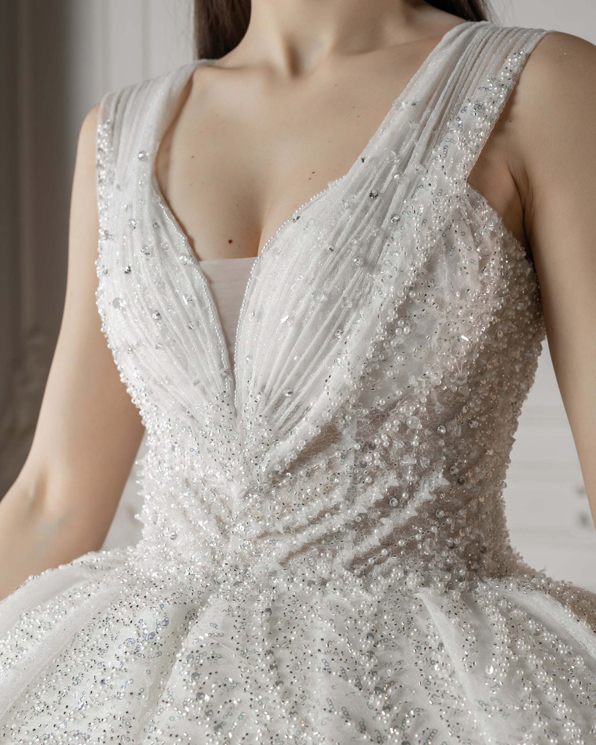 Lunaria is a radiant masterpiece, born from light and movement. The plunging illusion neckline meets delicate pleated tulle straps, creating soft architectural lines that draw the eye inward. The bodice is richly adorned with silver crystals and beads, arranged in intricate organic patterns that continue seamlessly into the voluminous skirt. Layers of shimmering tulle cascade into a glowing, sweeping train, capturing moonlight with every step. A lace-up back ensures perfect structure while preserving the gown’s ethereal essence. This is a gown for the bride who wishes to shine with grace and power.