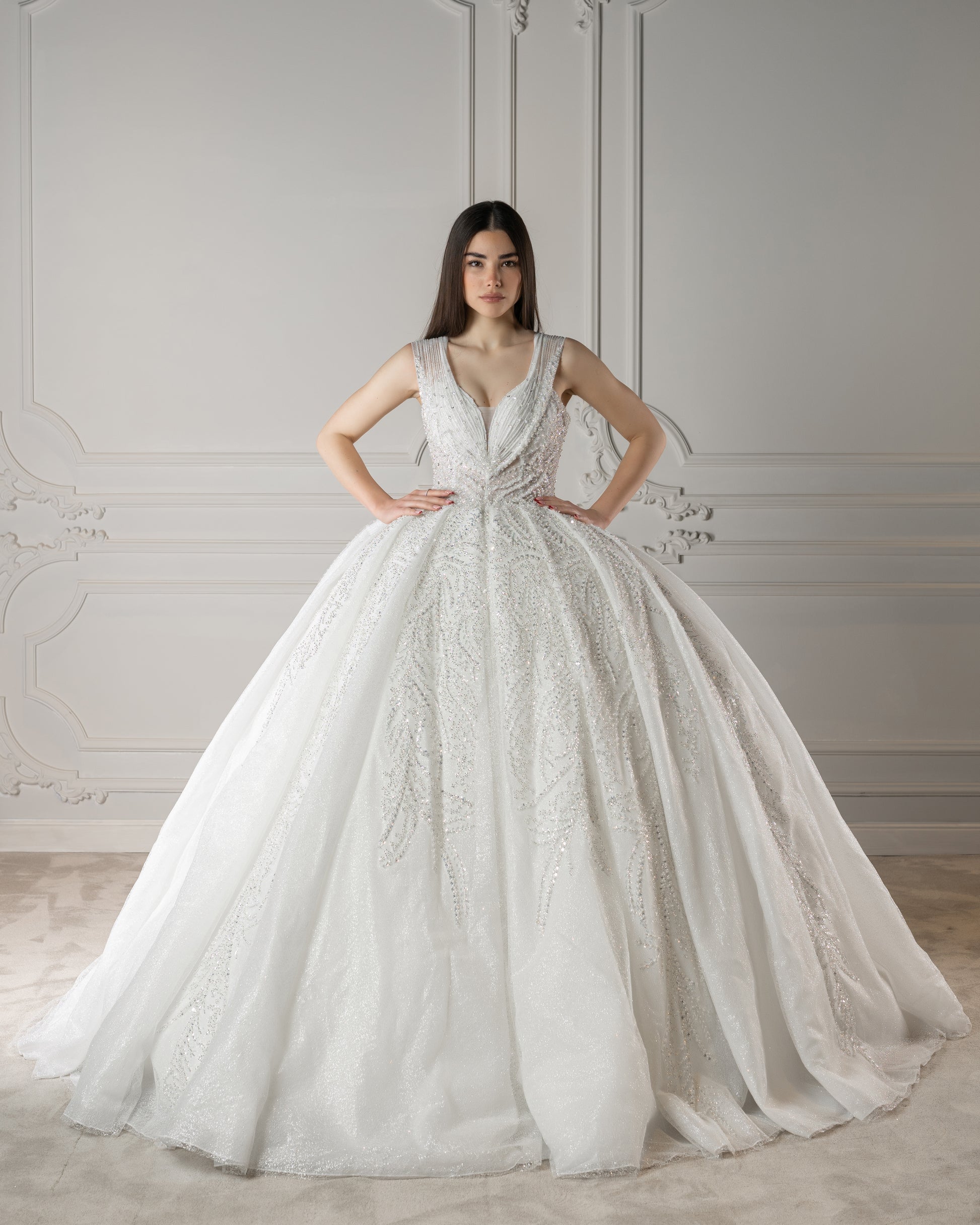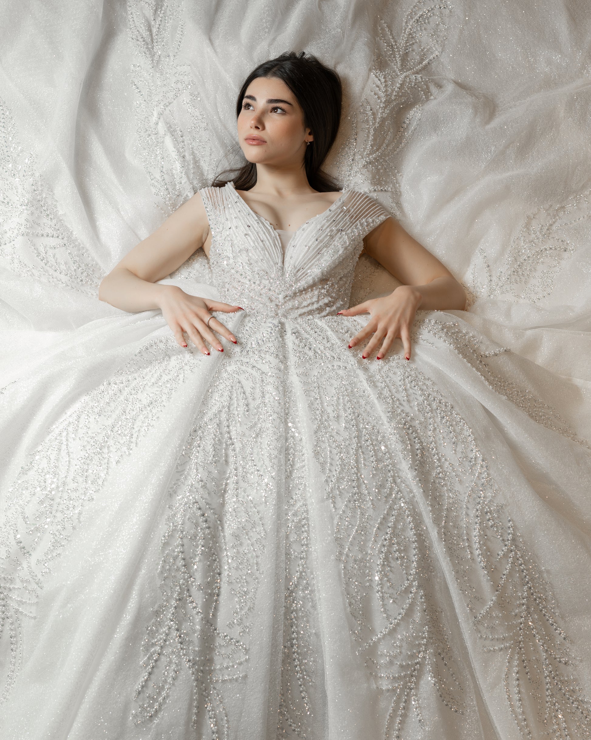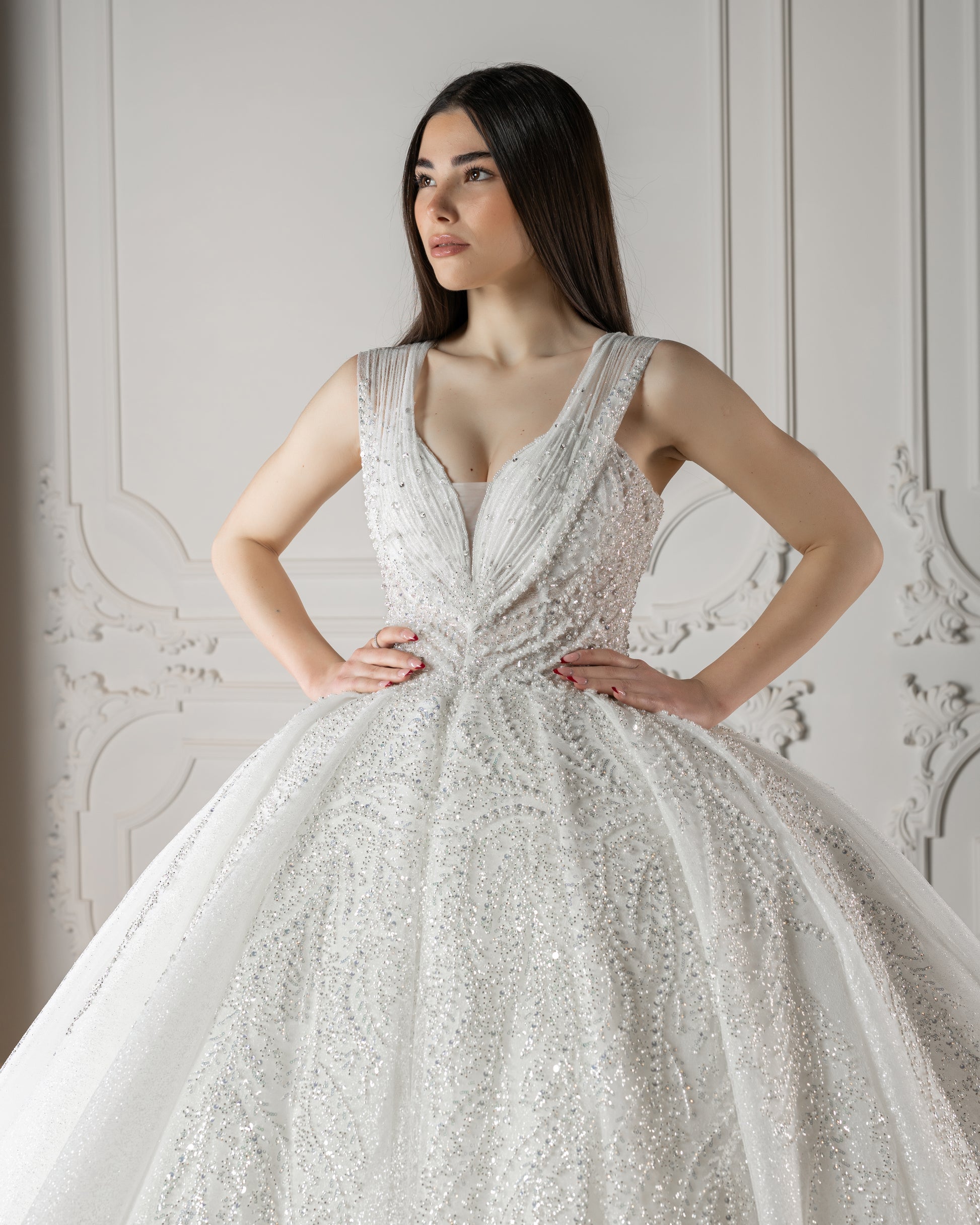 Lunaria is a radiant masterpiece, born from light and movement. The plunging illusion neckline meets delicate pleated tulle straps, creating soft architectural lines that draw the eye inward. The bodice is richly adorned with silver crystals and beads, arranged in intricate organic patterns that continue seamlessly into the voluminous skirt. Layers of shimmering tulle cascade into a glowing, sweeping train, capturing moonlight with every step. A lace-up back ensures perfect structure while preserving the gown’s ethereal essence. This is a gown for the bride who wishes to shine with grace and power.