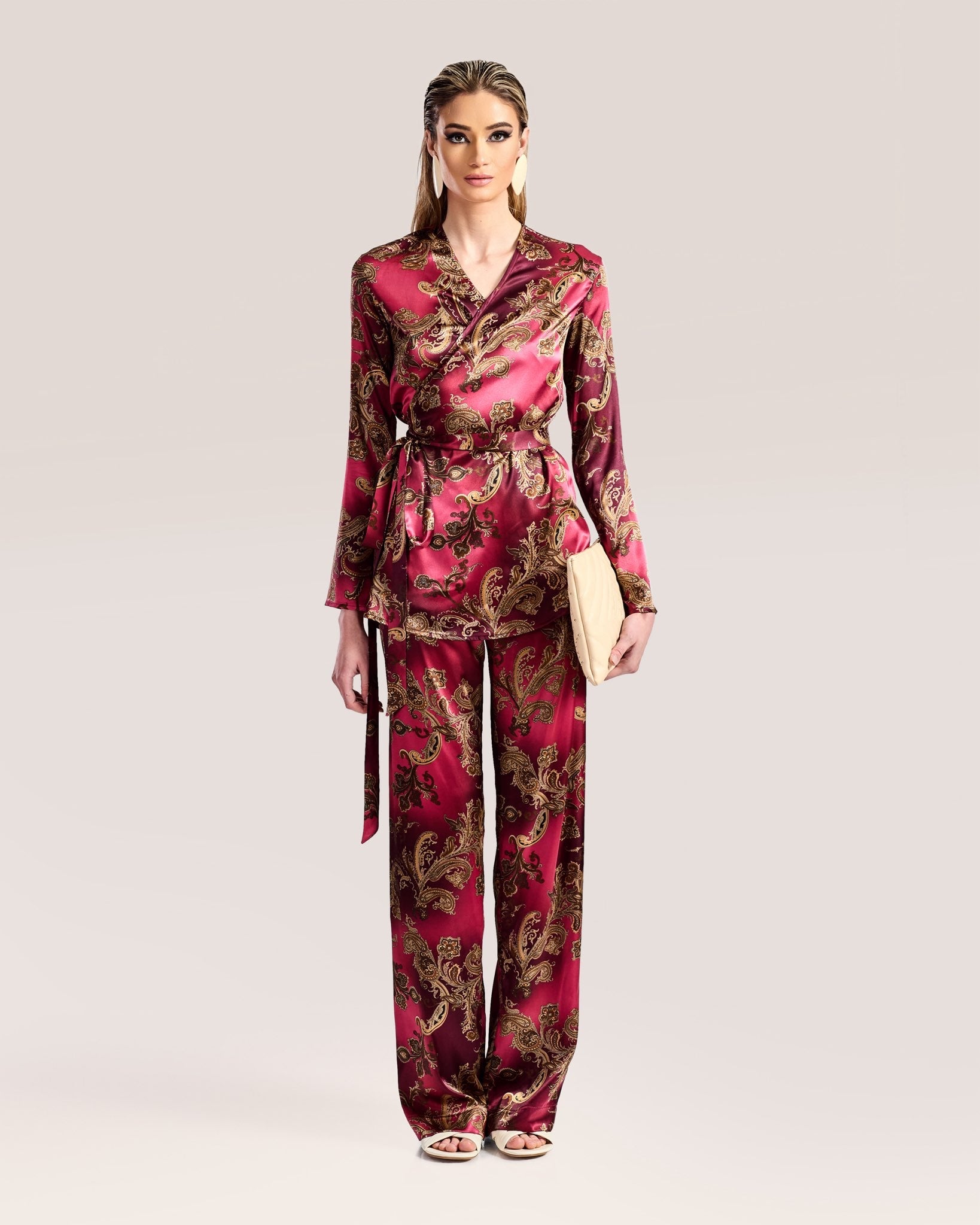 Feel like royalty in this exquisite flowing jacket and trouser two-piece set, a couture masterpiece that celebrates the splendor of the past with a fresh, contemporary twist.