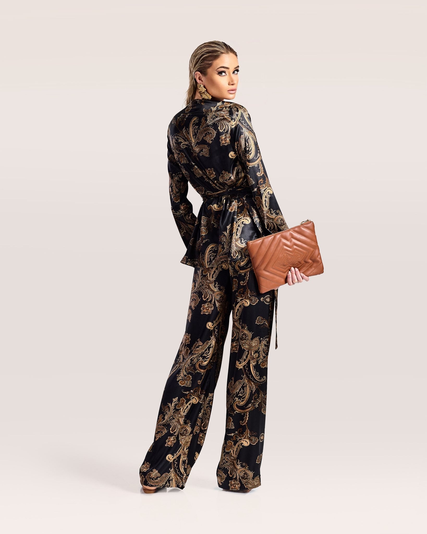 Tailored to accentuate your figure with comfort, the décolleté elegantly cinches at the waist and the belt allows you to adjust the neckline, while the free-fall trousers promise the perfect silhouette.
