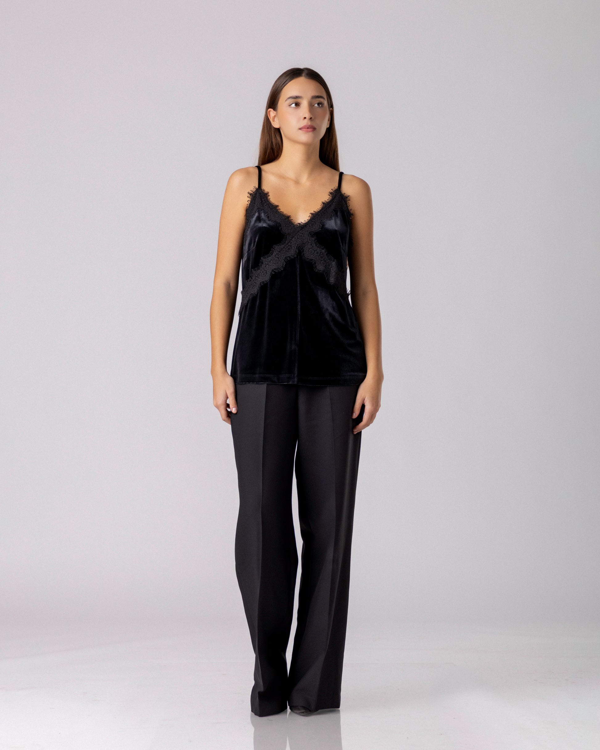 A refined camisole crafted with delicate lace detailing and a fluid, soft drape. Designed to elevate both tailored looks and evening styling, this piece brings understated sensuality and effortless elegance to the modern wardrobe.