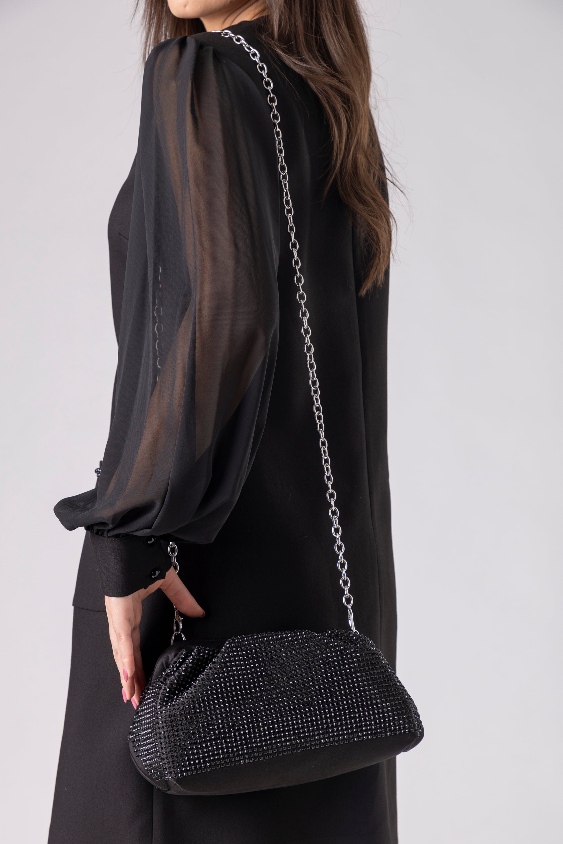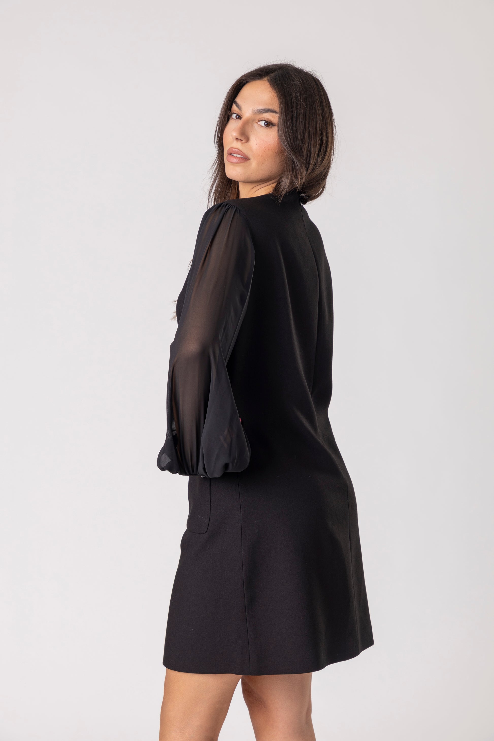 The main fabric is compact and matte, while the sleeves are crafted from a lightweight, sheer material with subtle volume. The contrast between solidity and transparency introduces visual depth without decorative excess.