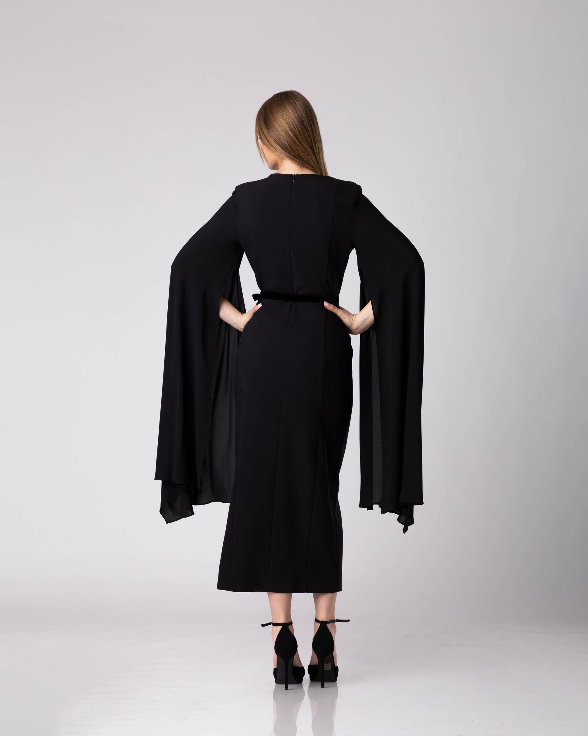 ZORYN is a refined midi dress defined by clarity of form and controlled movement. The silhouette is clean and precise, while the flowing cape-style sleeves introduce a sense of motion and quiet drama without overpowering the design.