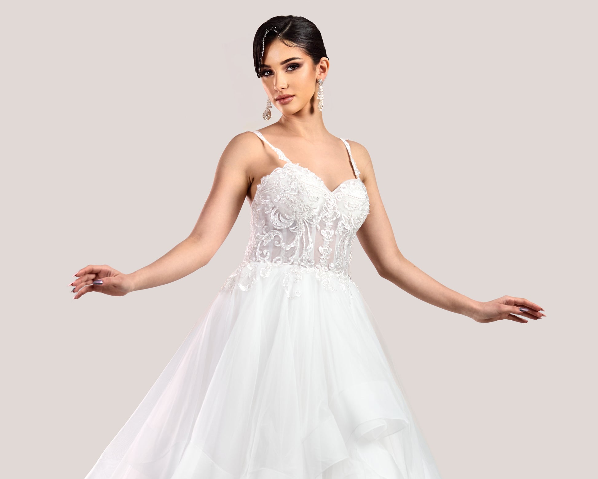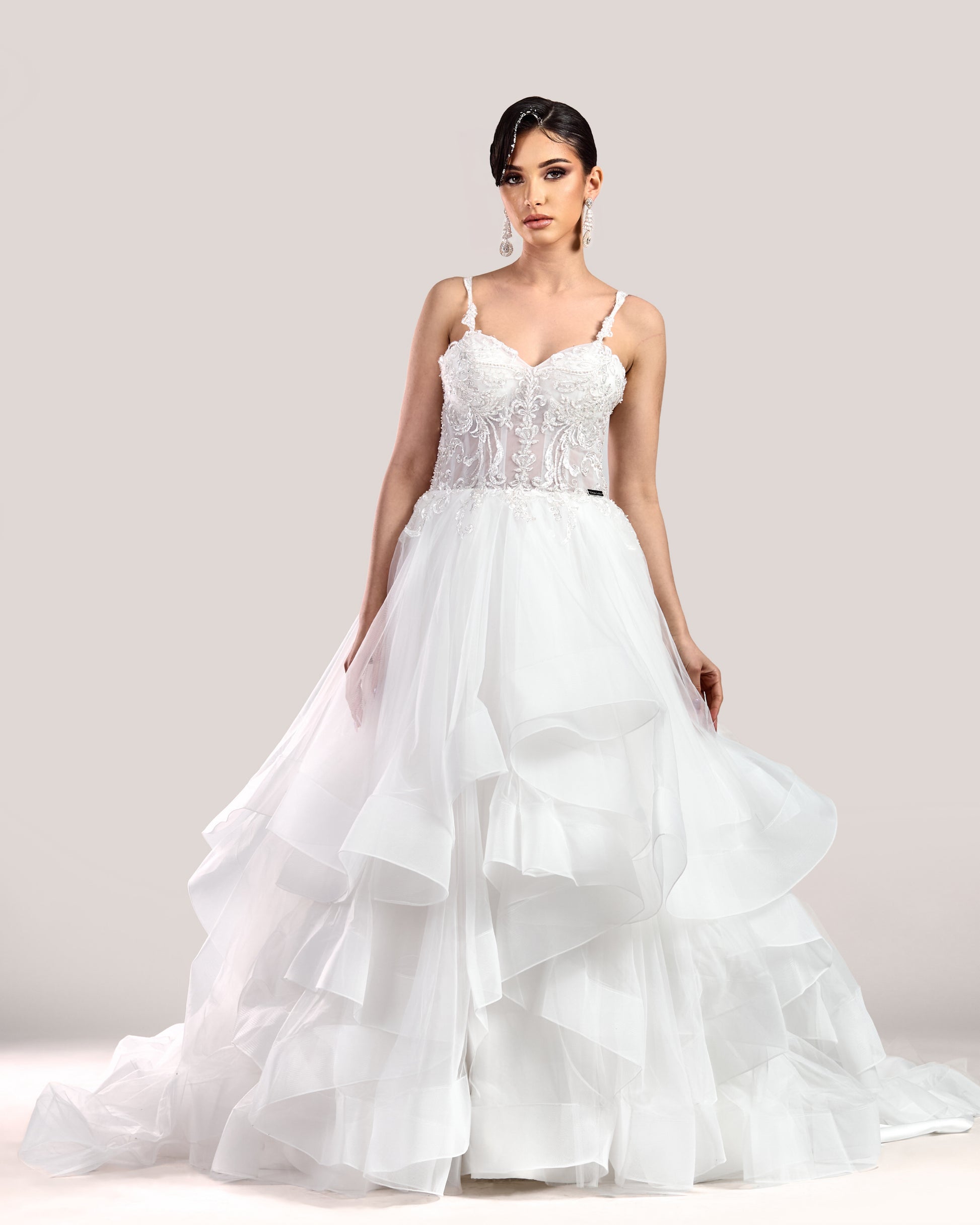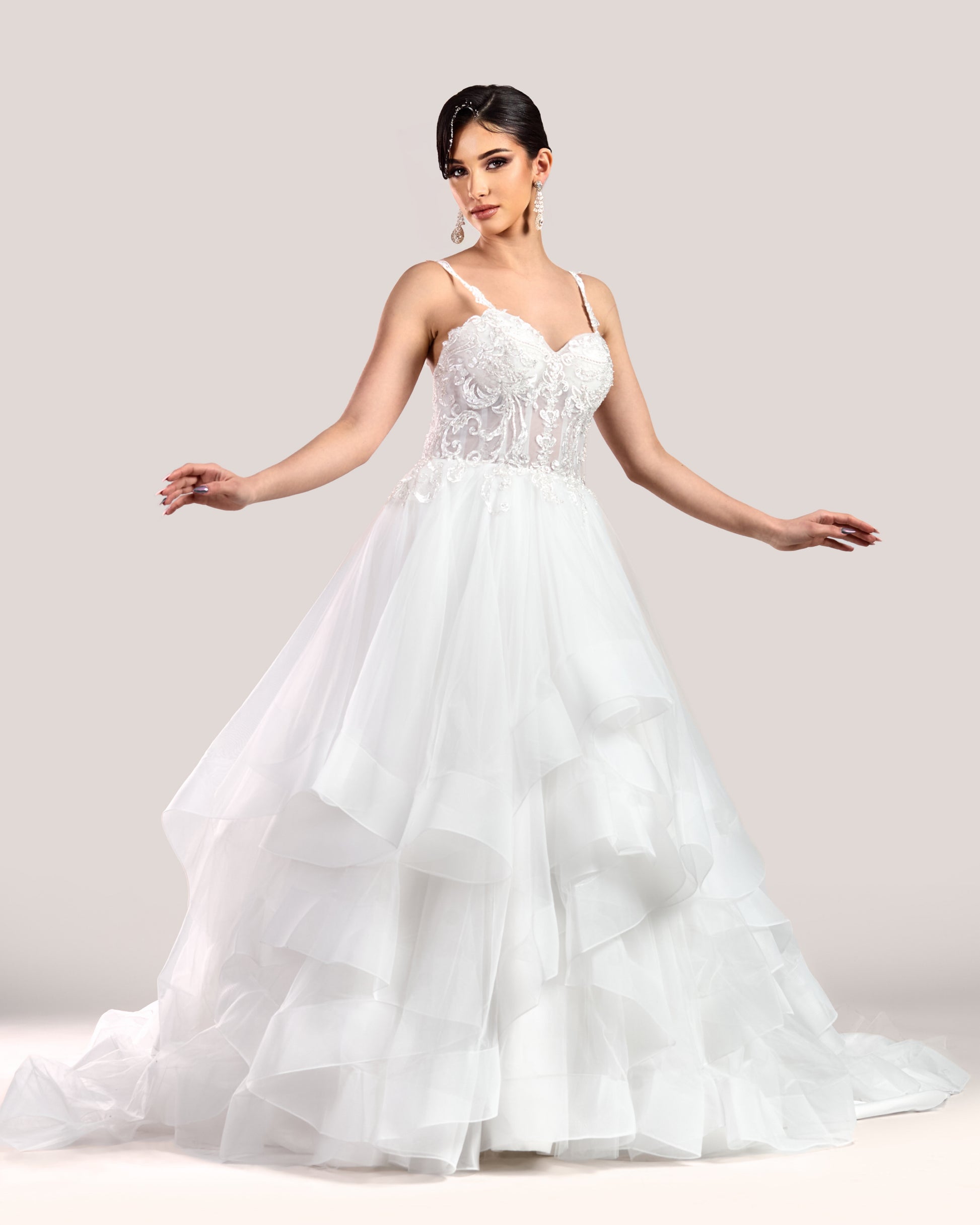 "Cascade Bliss" is a celebration of love's playful and joyous moments, ideal for the bride who glows with happiness and wants to twirl through her special day with a blend of splendor and lighthearted grace.