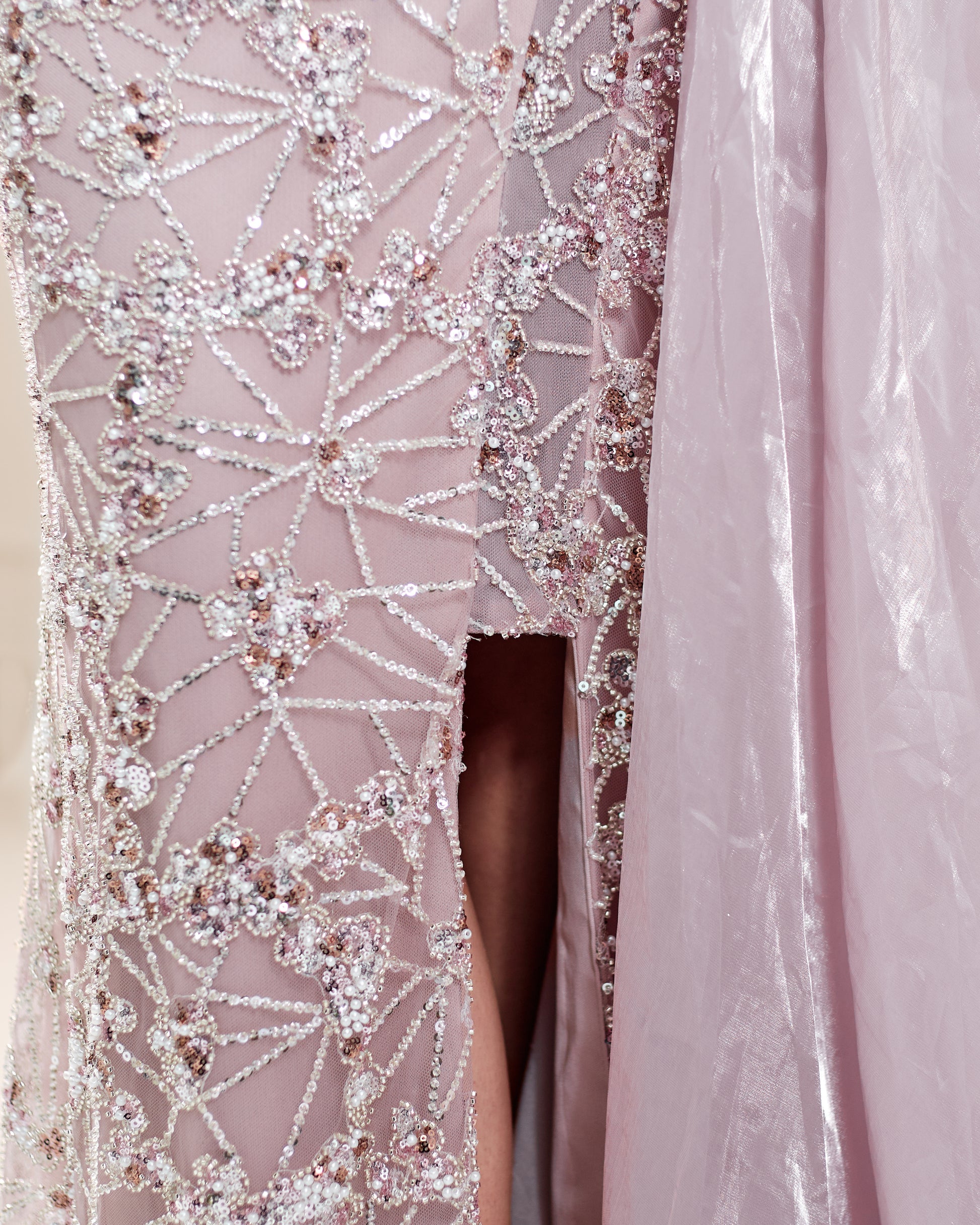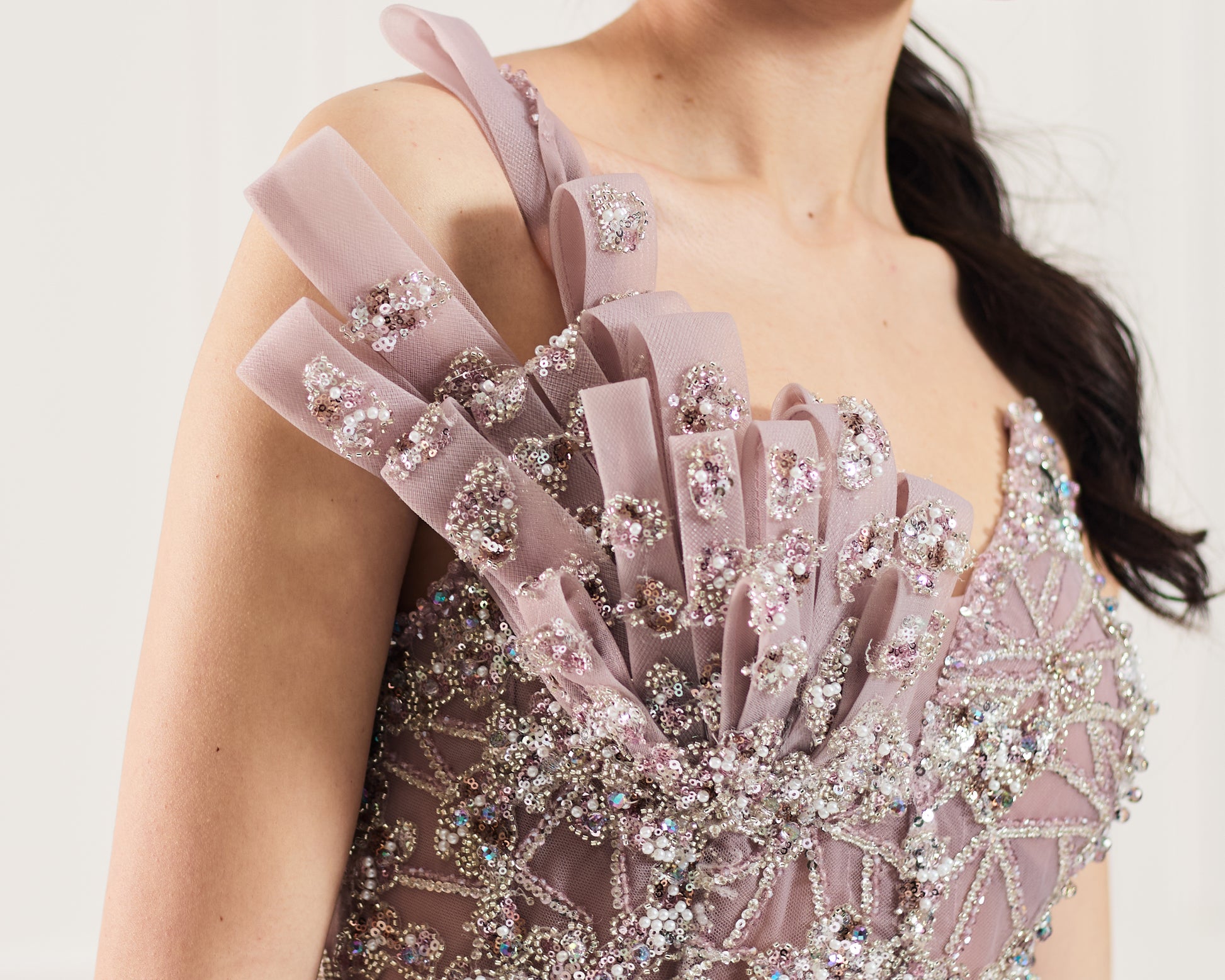 Radiate timeless elegance in the Celestia Embellished Gown, a statement piece crafted for the most glamorous occasions. This floor-length silhouette stuns with its intricate hand-beaded embellishments, embroidery, and delicate crystal detailing that catch the light with every movement. Featuring a flattering V-neckline, sculpted waist, and dramatic one-shoulder flourish, this gown blends femininity with haute couture artistry. A flowing silk overlay adds depth and fluidity to your every step.