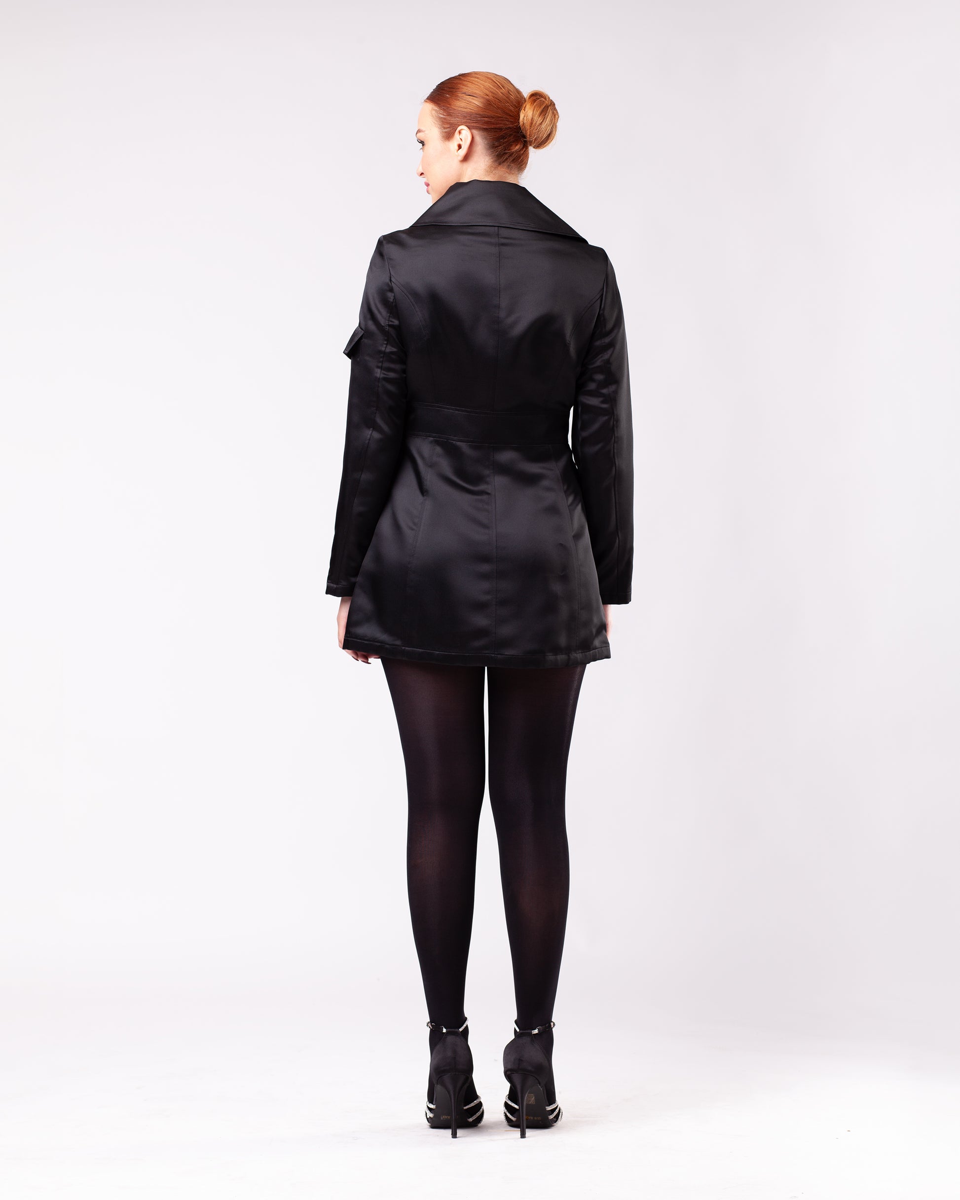Introducing the 'Midnight Silhouette Trench' – the epitome of sleek sophistication. This coat is the perfect fusion of classic style and modern edge. Crafted from luxurious fabric with a satin finish, it features a tailored silhouette that flatters with every move. Details such as the bold collar, structured shoulders, and strategic pocket placement make it a statement piece. Whether dressed up or down, this coat adds an air of mystery and chic to any outfit.