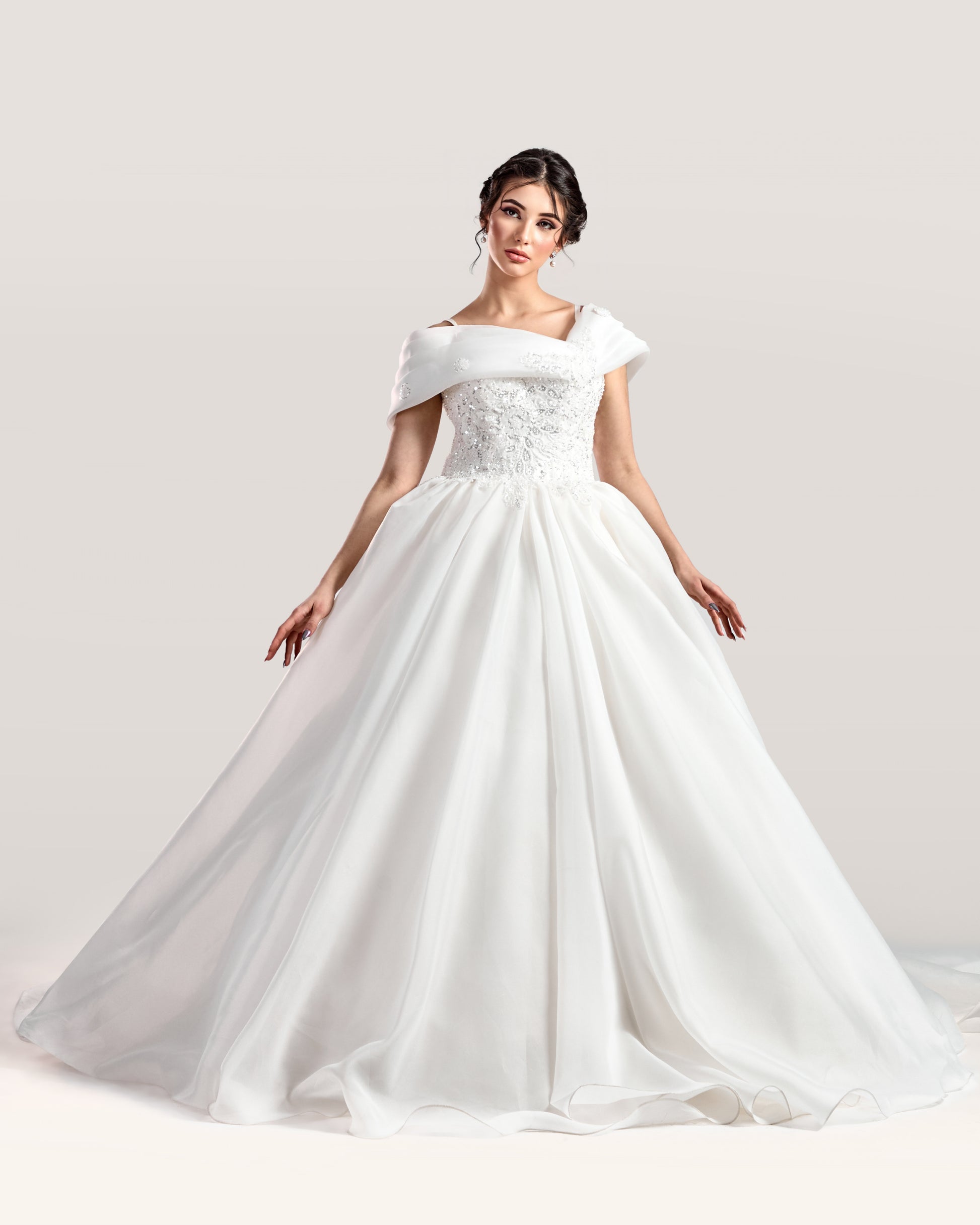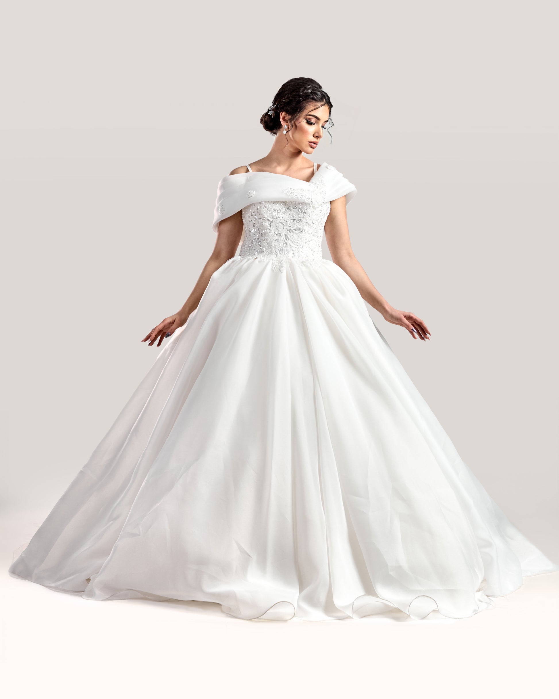 At the heart of this bridal creation is a bodice adorned with ornate beading and sequin work, offering a celestial sparkle that captures the light and the eye. This detailed bodice contrasts beautifully with the off-shoulder cut, adding a hint of allure and modernity.