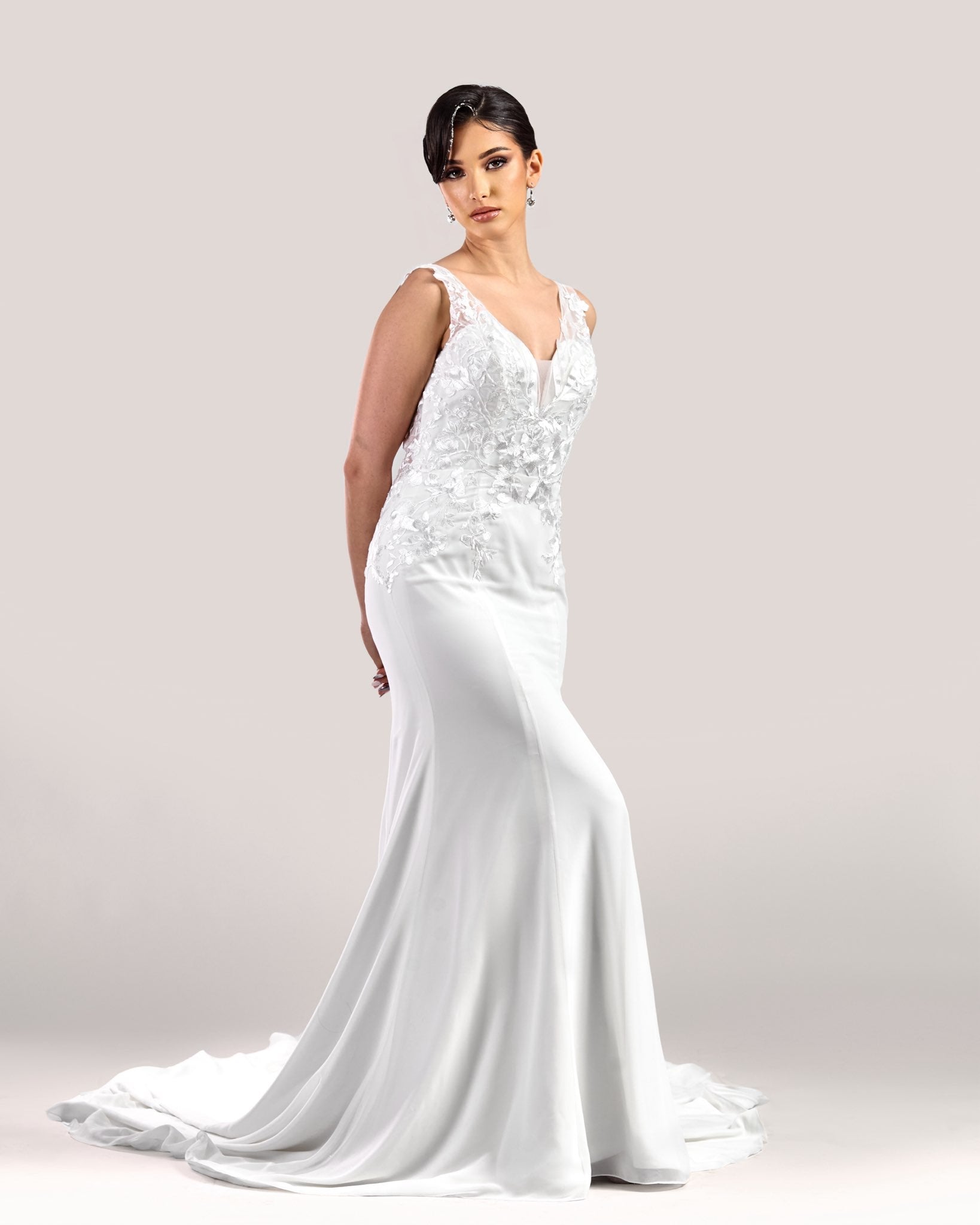 Crafted from the smoothest silk, the dress graces the bride's silhouette with a fluidity that speaks of classic romance. The sleek, form-fitting design is complemented by a bodice richly adorned with delicate lace appliqués, which add a layer of timeless bridal beauty. The plunging V-neckline, edged with soft lace, offers a modern yet modest allure, ensuring the bride feels both confident and exquisite.