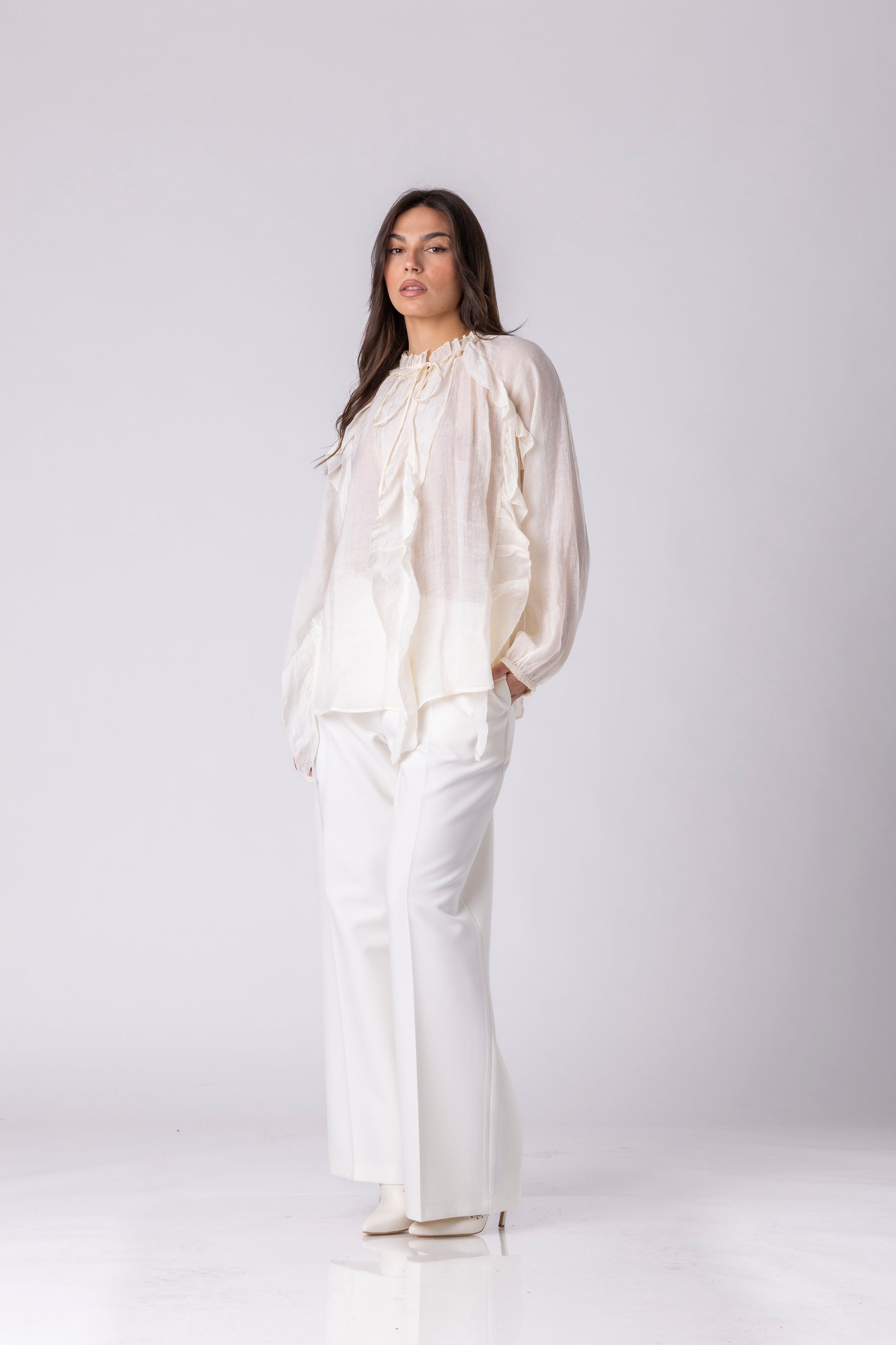 Althea е лесна блуза со опуштена, праволиниска силуета и издолжена должина. Кројот е ненагласен во половината, овозможувајќи материјалот слободно да паѓа и да ја задржи природната форма. Горниот дел е завршен со висока, благо собрана јака и тенка врвка за врзување.