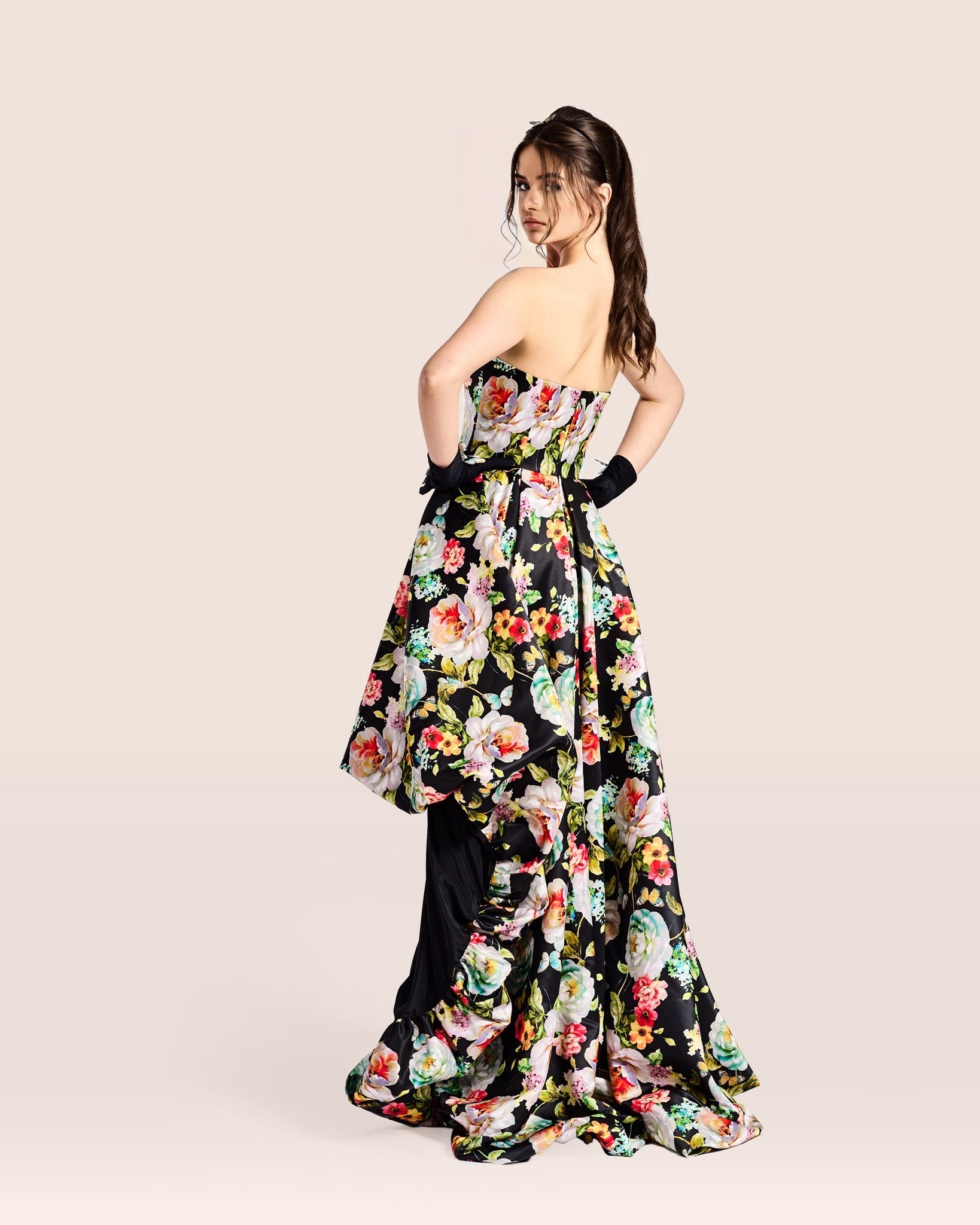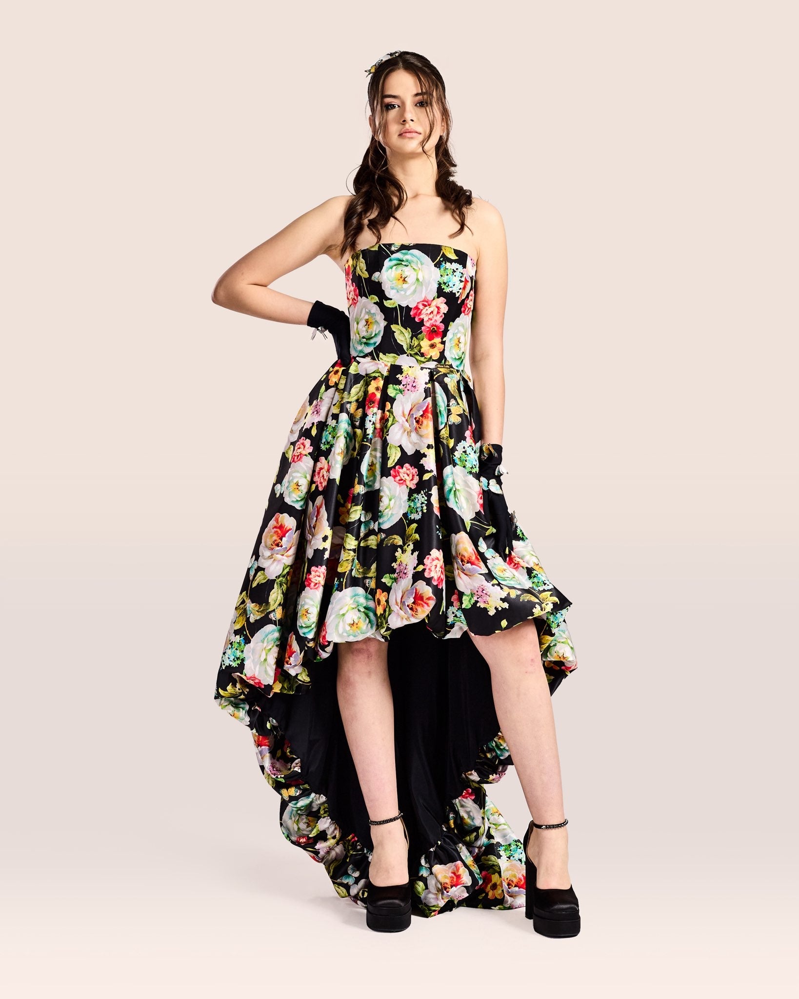 The strapless bodice exudes elegance, while the sweeping high-low skirt creates an air of romance with every step. Its meticulously crafted fabric falls fluidly, promising a silhouette that's both flattering and comfortable.