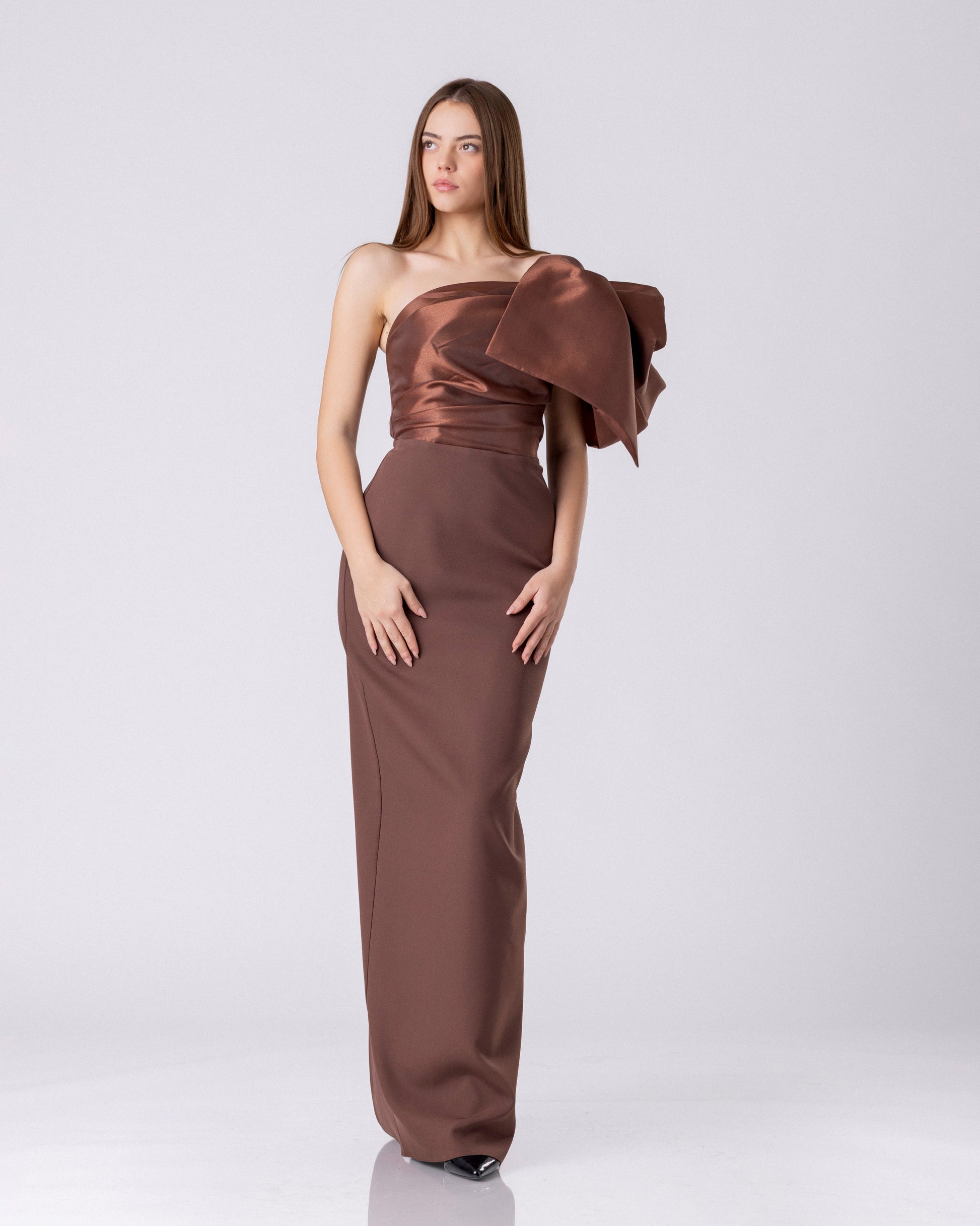 Фустанот се истакнува со драматична силуета на едно рамо, крунисана со голема, совршено обликувана скулптурална машна за максимален визуелен ефект. Корсетот е изработен од луксузен бронзен сатен што прекрасно ја фаќа светлината, додека долгата сукња ја издолжува фигурата и создава статуарно присуство.