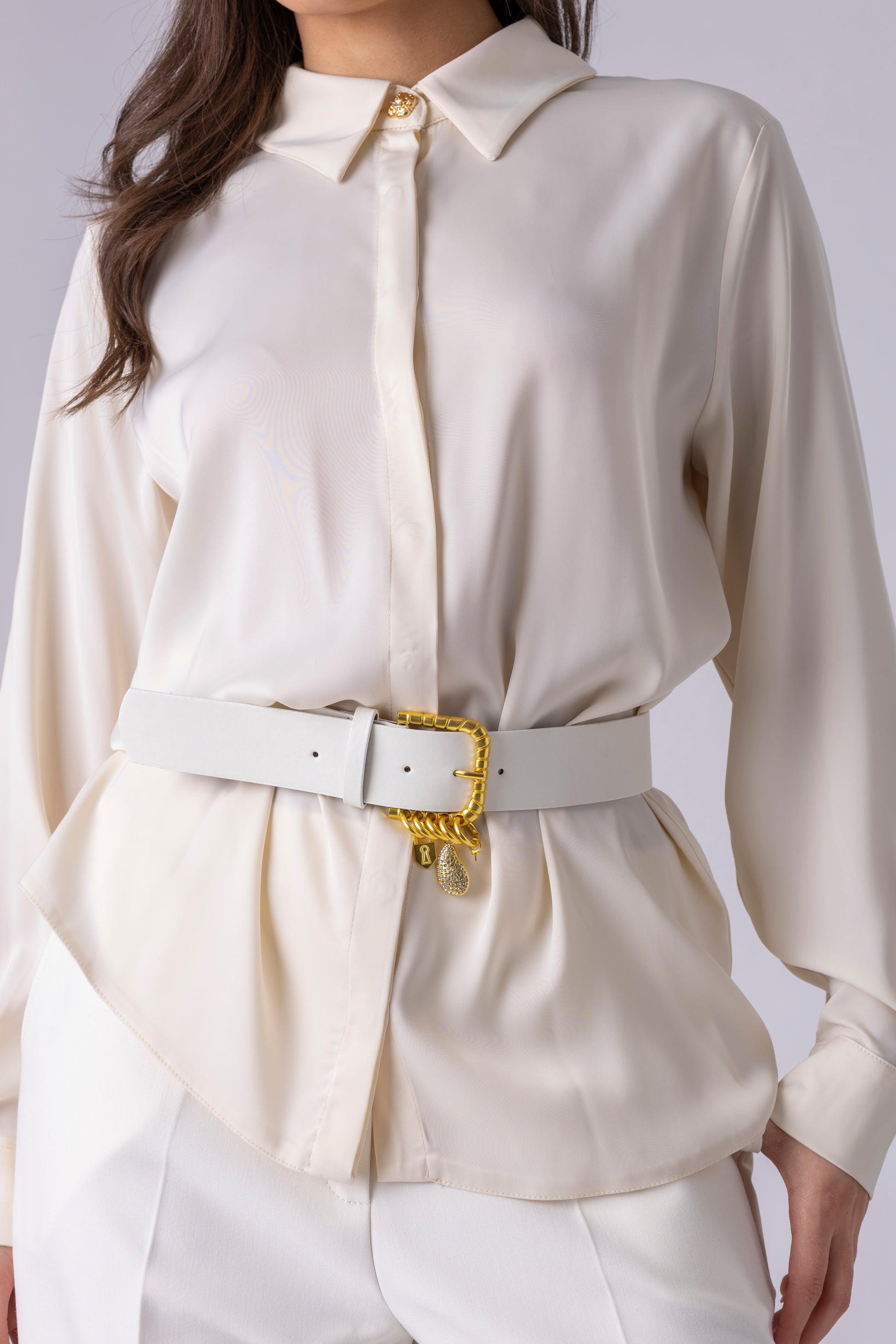 Материјалот е мазен и лесен, со флуидна структура што меко се движи без да ја губи формата. Долгите ракави завршуваат со манжетни украсени со суптилни златни копчиња, кои се повторуваат и на јаката како дискретен дизајнерски акцент. Кошулата може да се носи слободно или нагласена со ремен, без да ја наруши линијата.