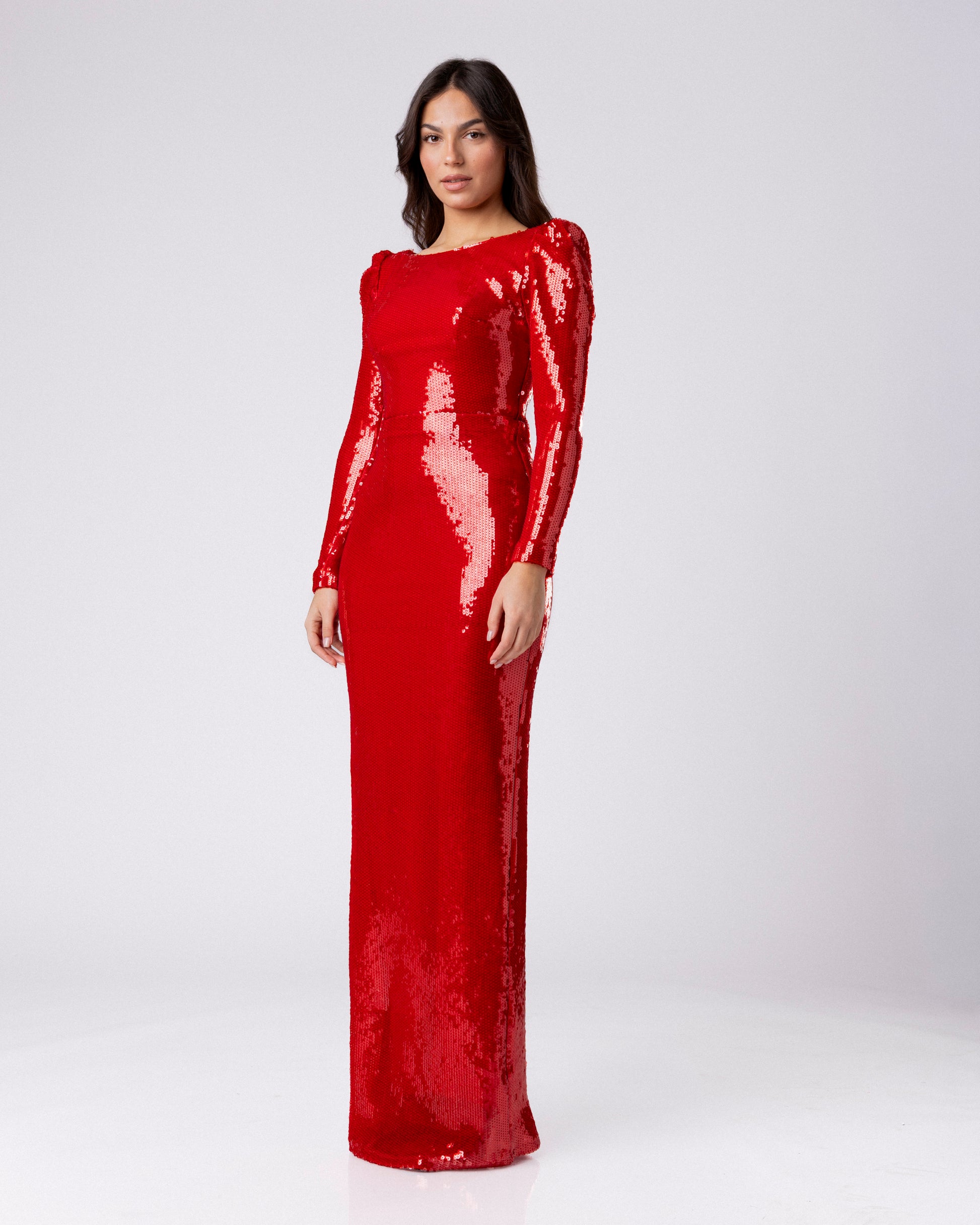 Фустанот е целосно изработен од фина ткаенина со ситни пайети, кои создаваат контролиран сјај и рамномерна површина. Долгите ракави се тесно моделирани, а суптилно нагласените рамени линии додаваат стабилност на силуетата. Материјалот има цврст пад и задржува јасна форма при движење.