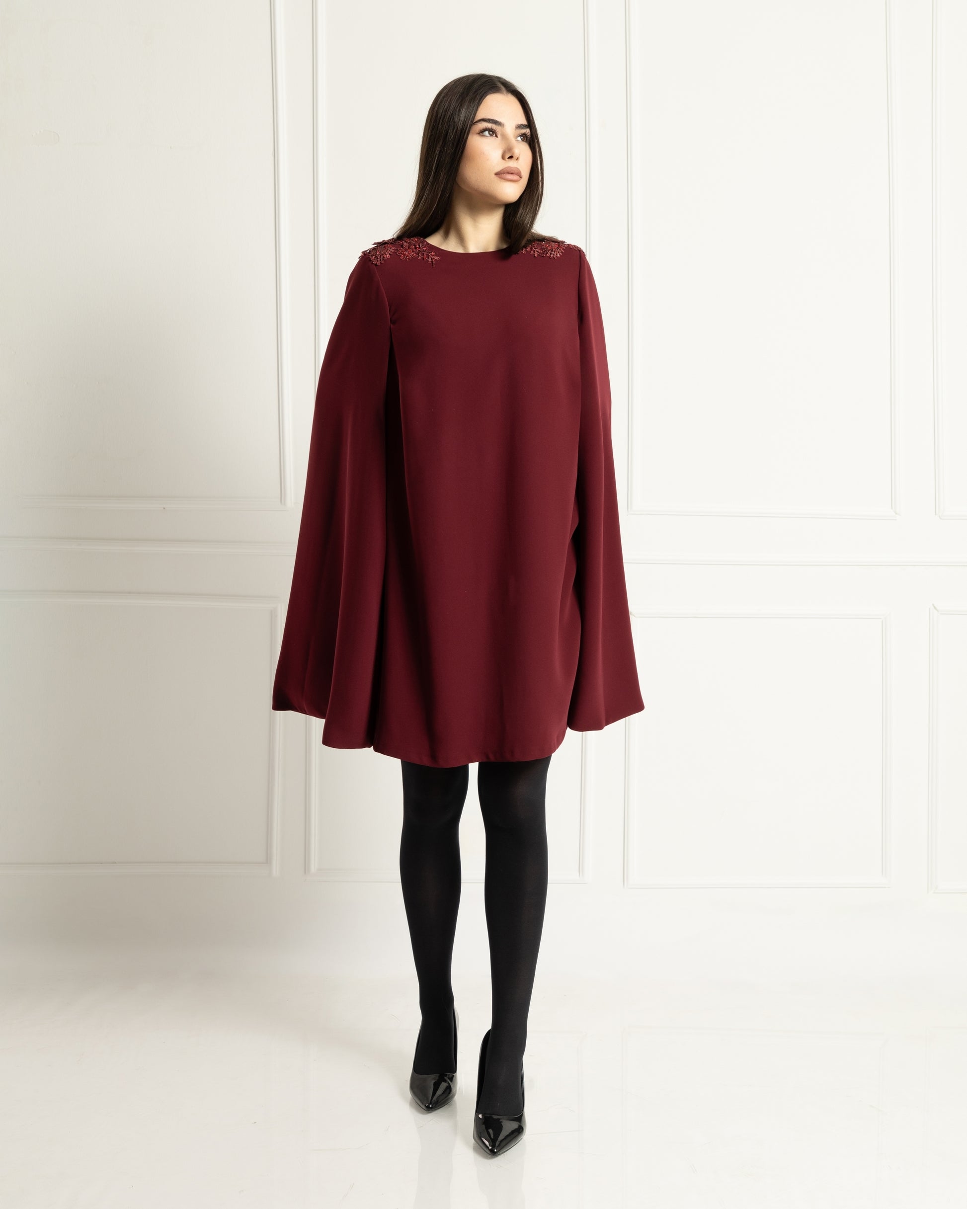 The Graceful Cape Dress is a refined and timeless piece that radiates effortless sophistication. Designed in a luxurious wine red hue, this dress showcases an elegant A-line silhouette complemented by a flowing cape overlay for added drama and charm.