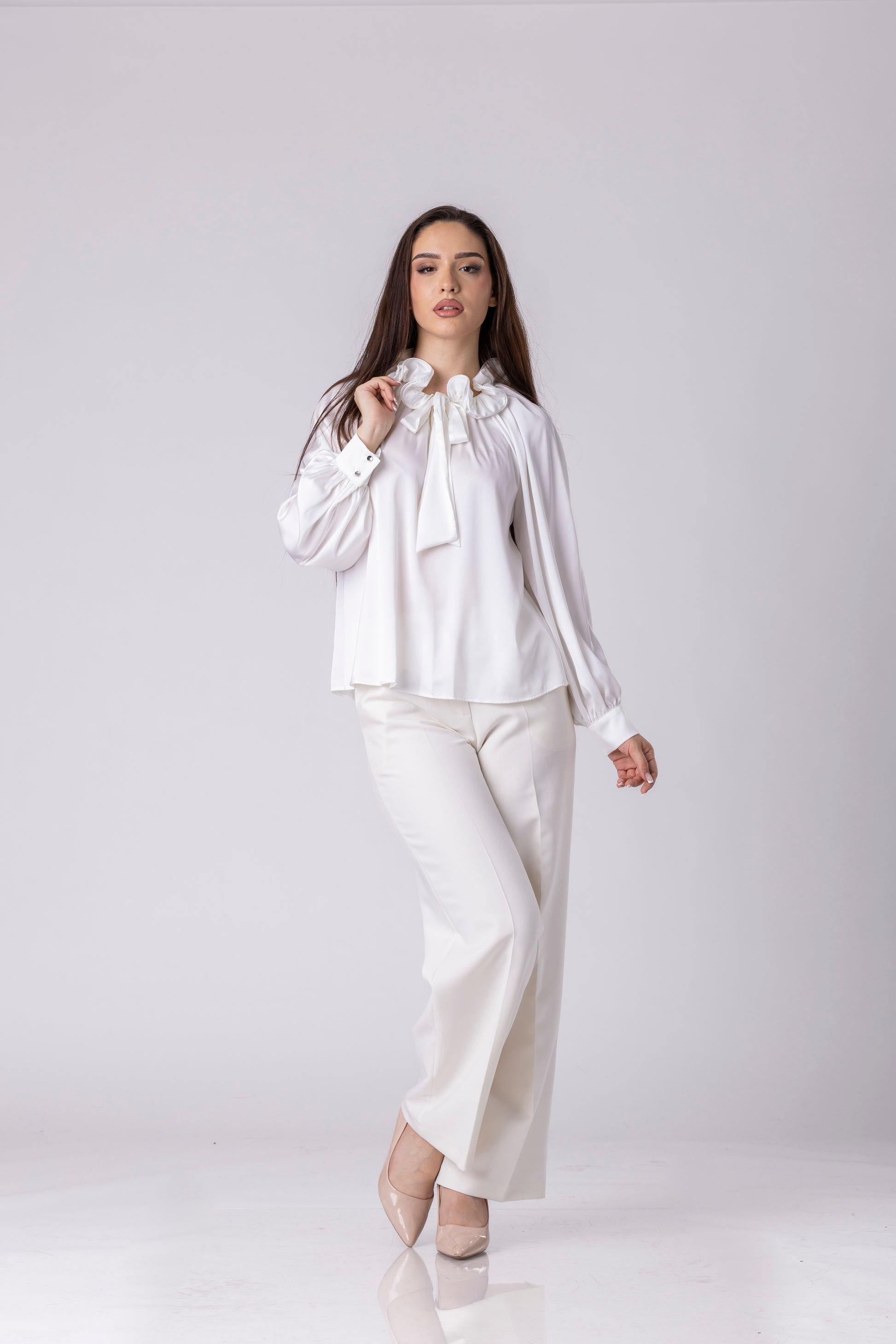 EVELYN е префинета блуза создадена да изрази лесна елеганција и женственост. Изработена од лесна, течна ткаенина, таа има нежни набори околу вратот и мек детаљ со врвка што додава романтичен и грациозен допир.