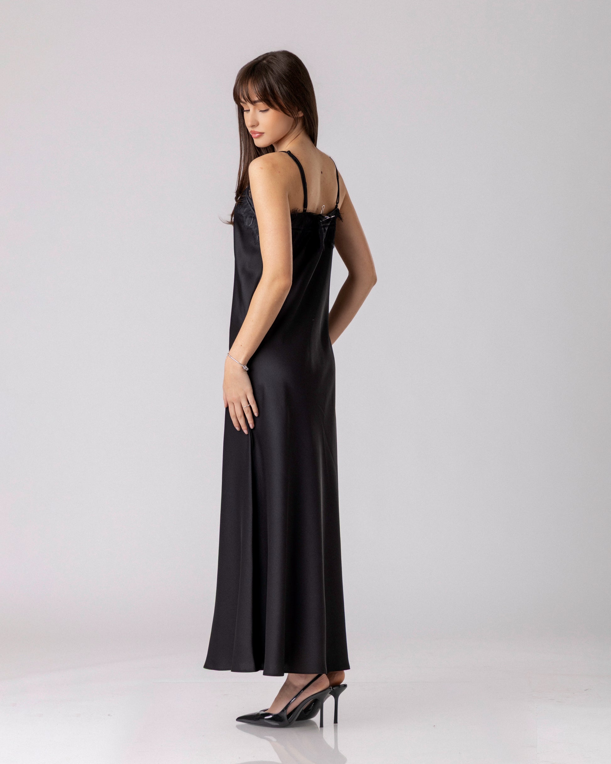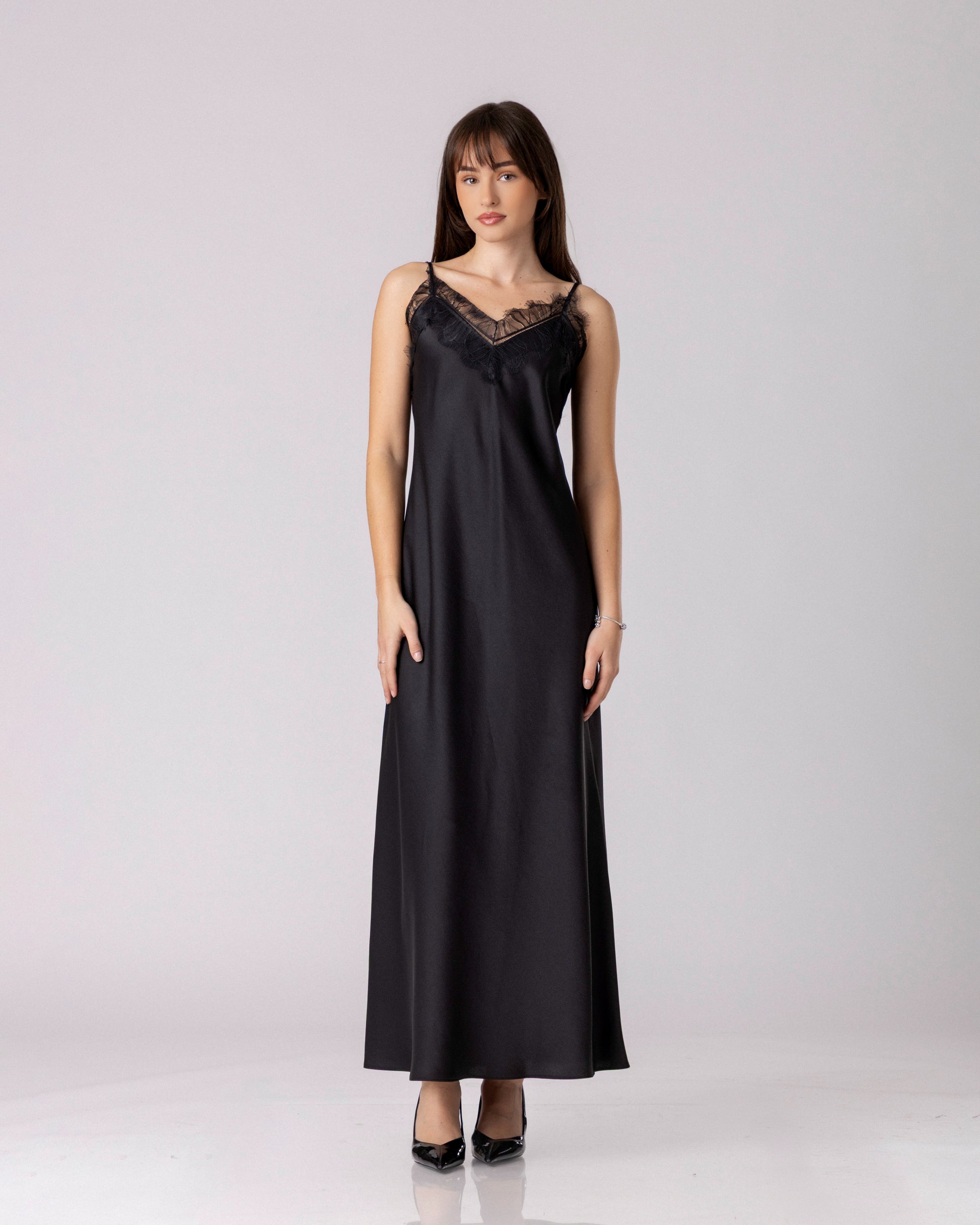 Правиот крој нежно паѓа по телото и создава издолжена, чиста силуета без вишок волумен. Деколтето е обликувано со суптилна чипка која додава длабочина и женствен контраст, задржувајќи ја префинетата естетика.