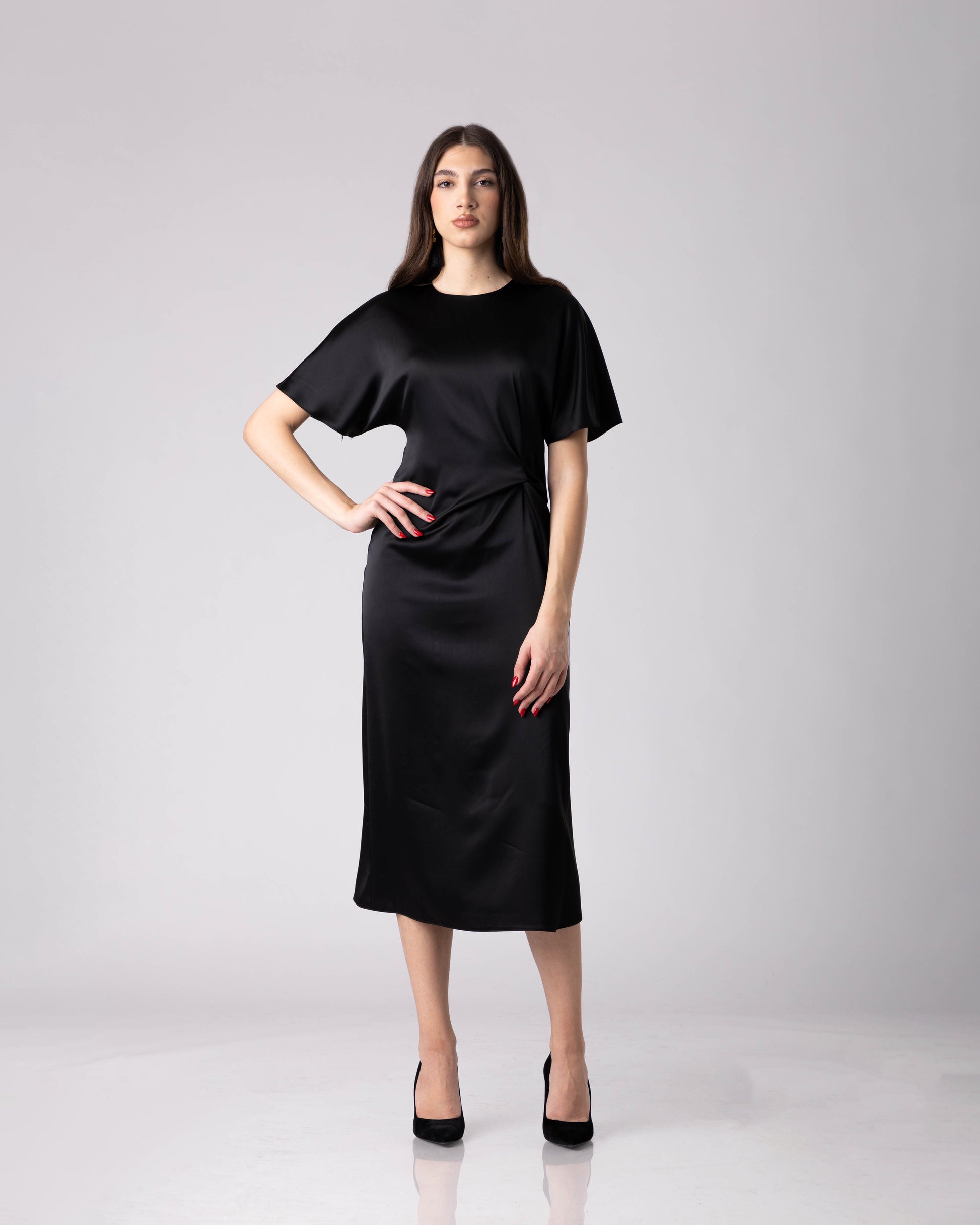 Миди фустан со прав крој од рамената до колковите. Ова парче го истакнува наборот во пределот на половината, додека здолништето паѓа право надолу.