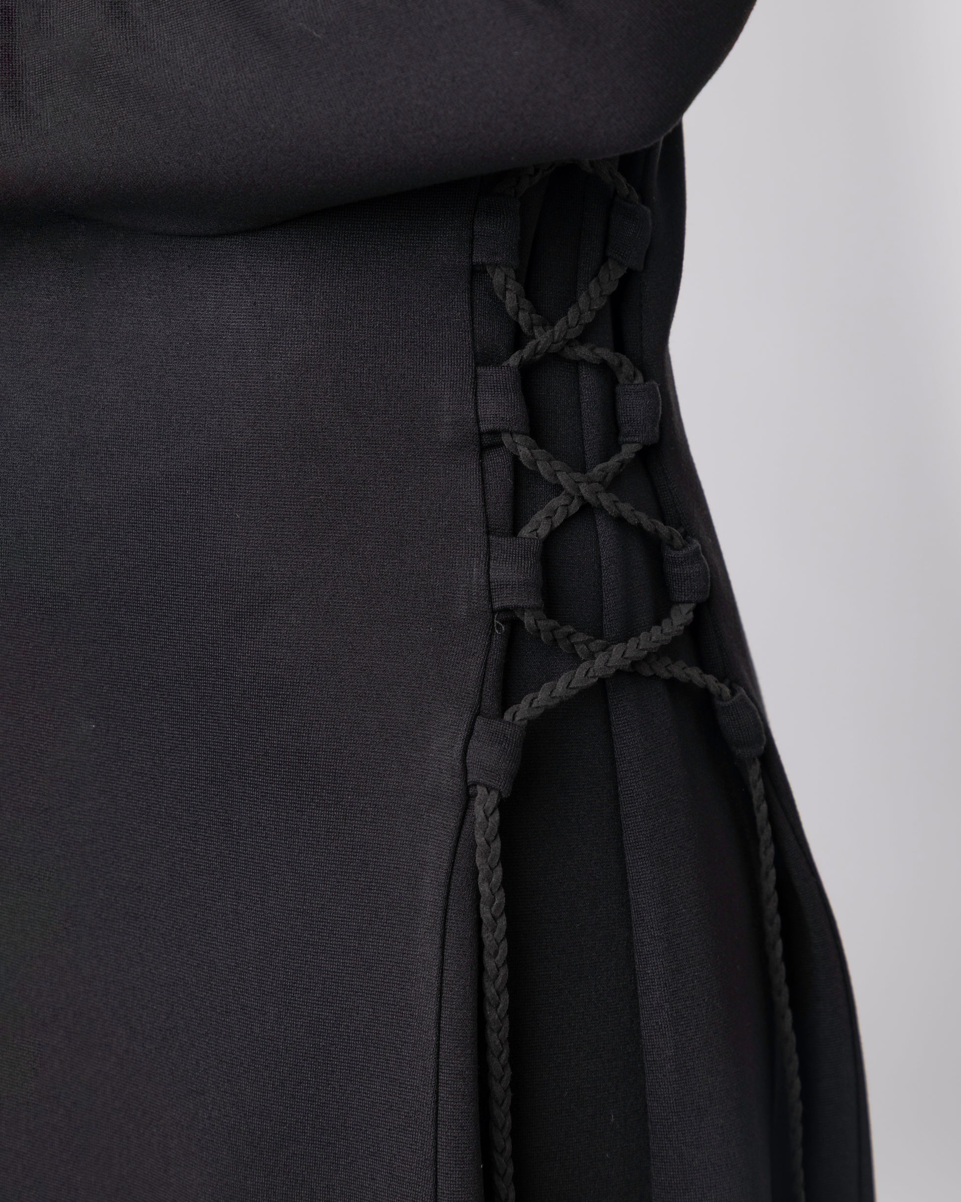 Страничниот дел е дефиниран со декоративно врзување, кое ја моделира силуетата и внесува визуелна длабочина без да го наруши балансот на целината. Материјалот паѓа рамномерно и создава стабилна форма што се движи со телото.