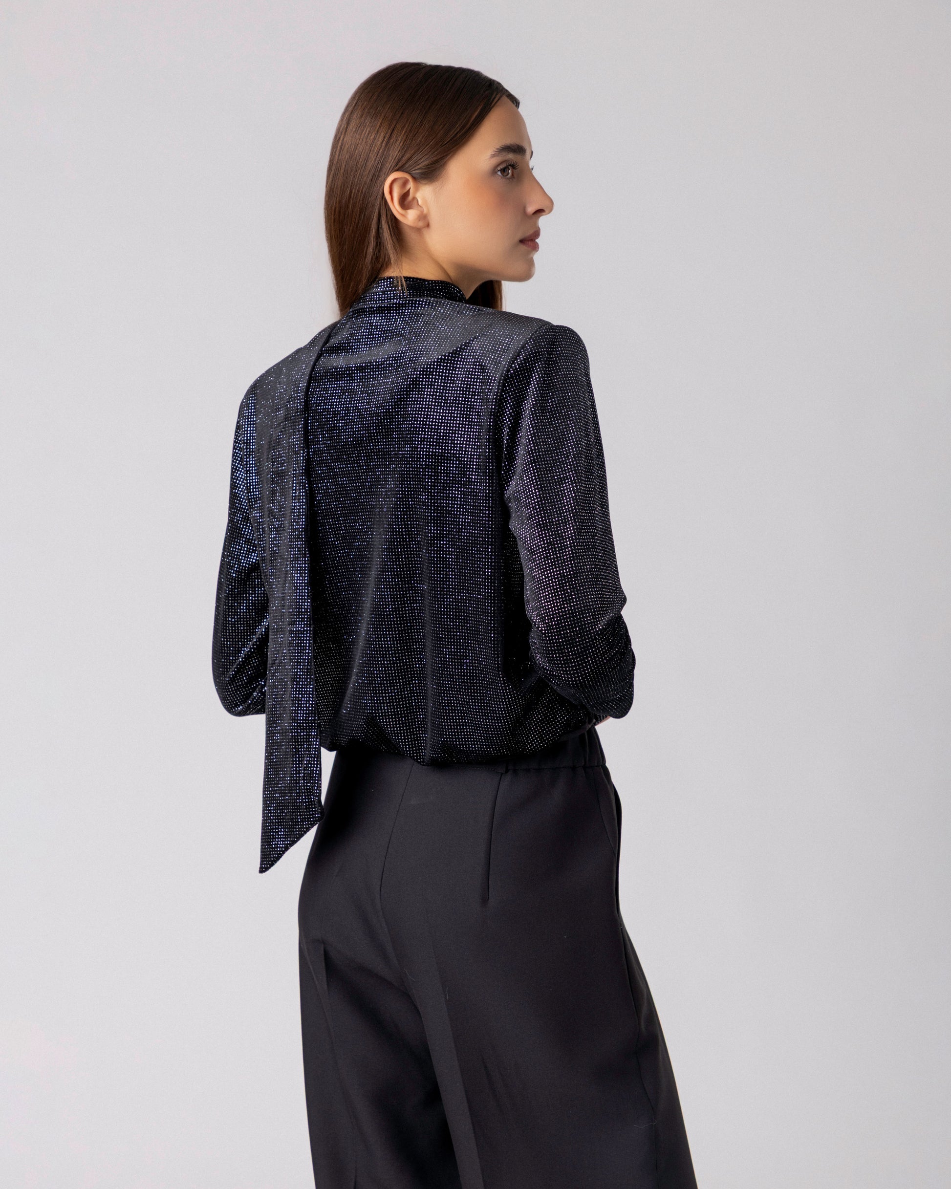 A refined blouse with a subtle luminous finish and a softly structured silhouette. The elegant neck tie detail adds character and depth, balancing femininity with modern confidence. Designed to transition seamlessly from tailored daywear to elevated evening styling.