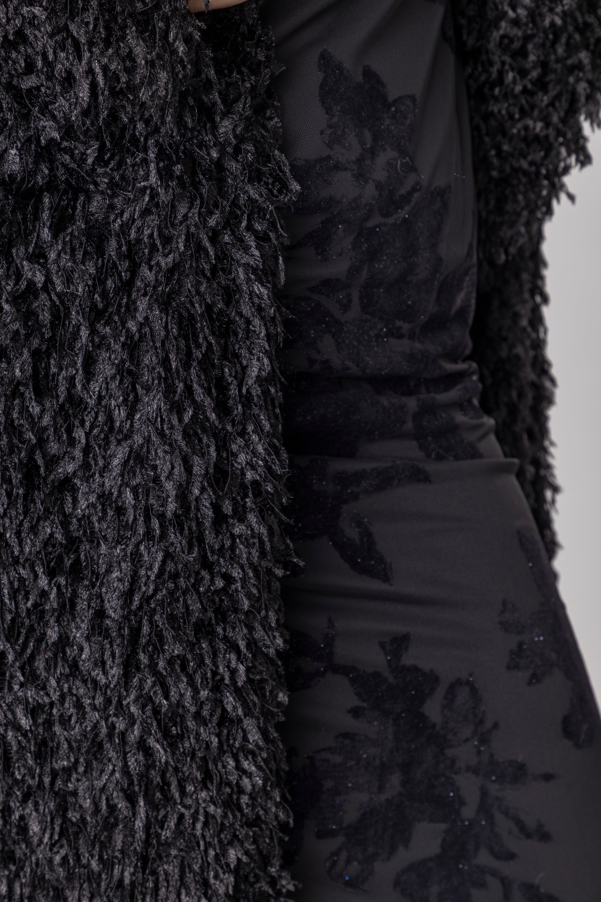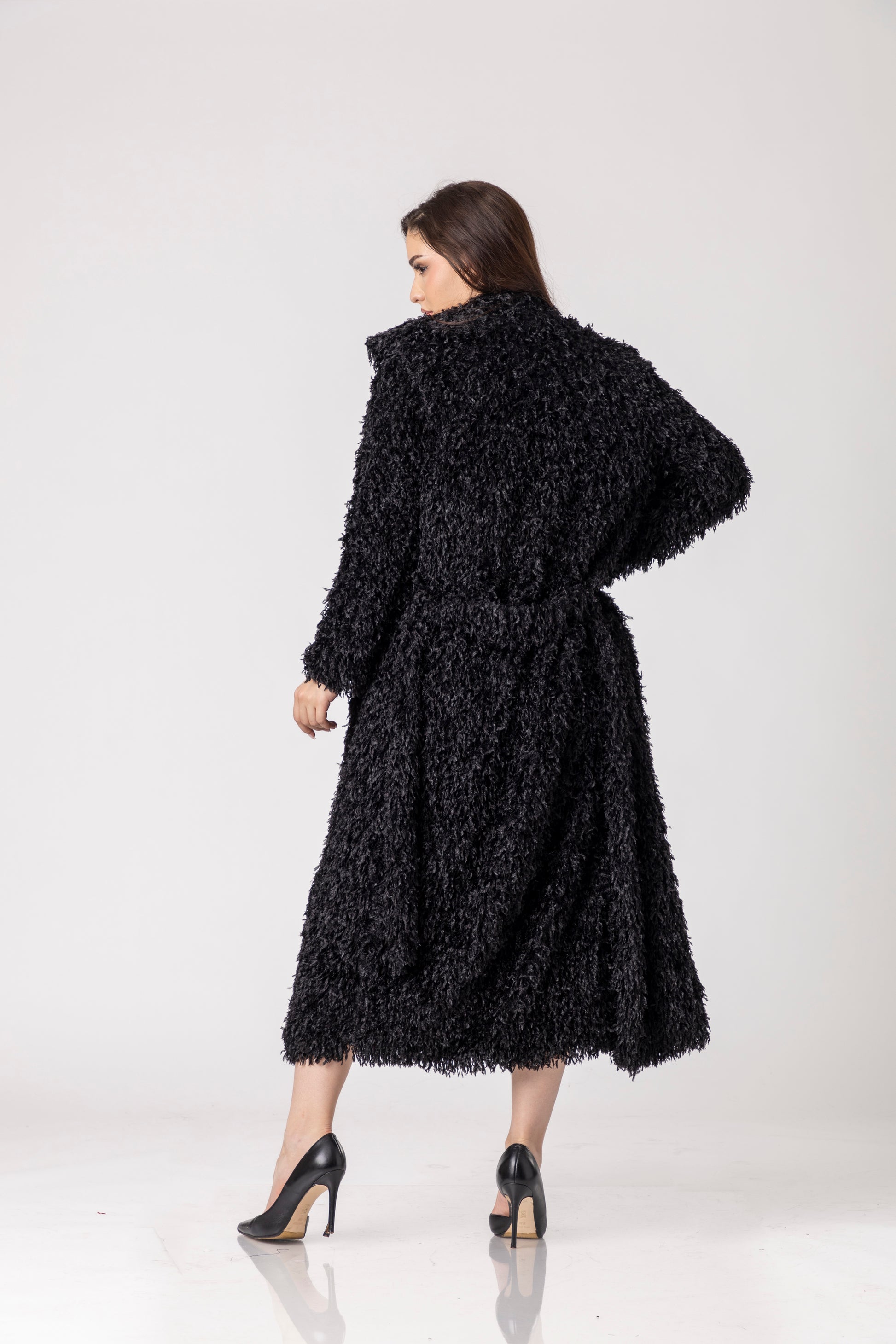 Изработен од меко вештачко крзно, со богата површина што создава длабочина и визуелен ритам. Силуетата е права и стабилна, без предно отворање, што му дава модерен, скулпторски карактер. Должината под колена ја заокружува формата и овозможува лесно комбинирање со елегантни и вечерни стајлинзи.