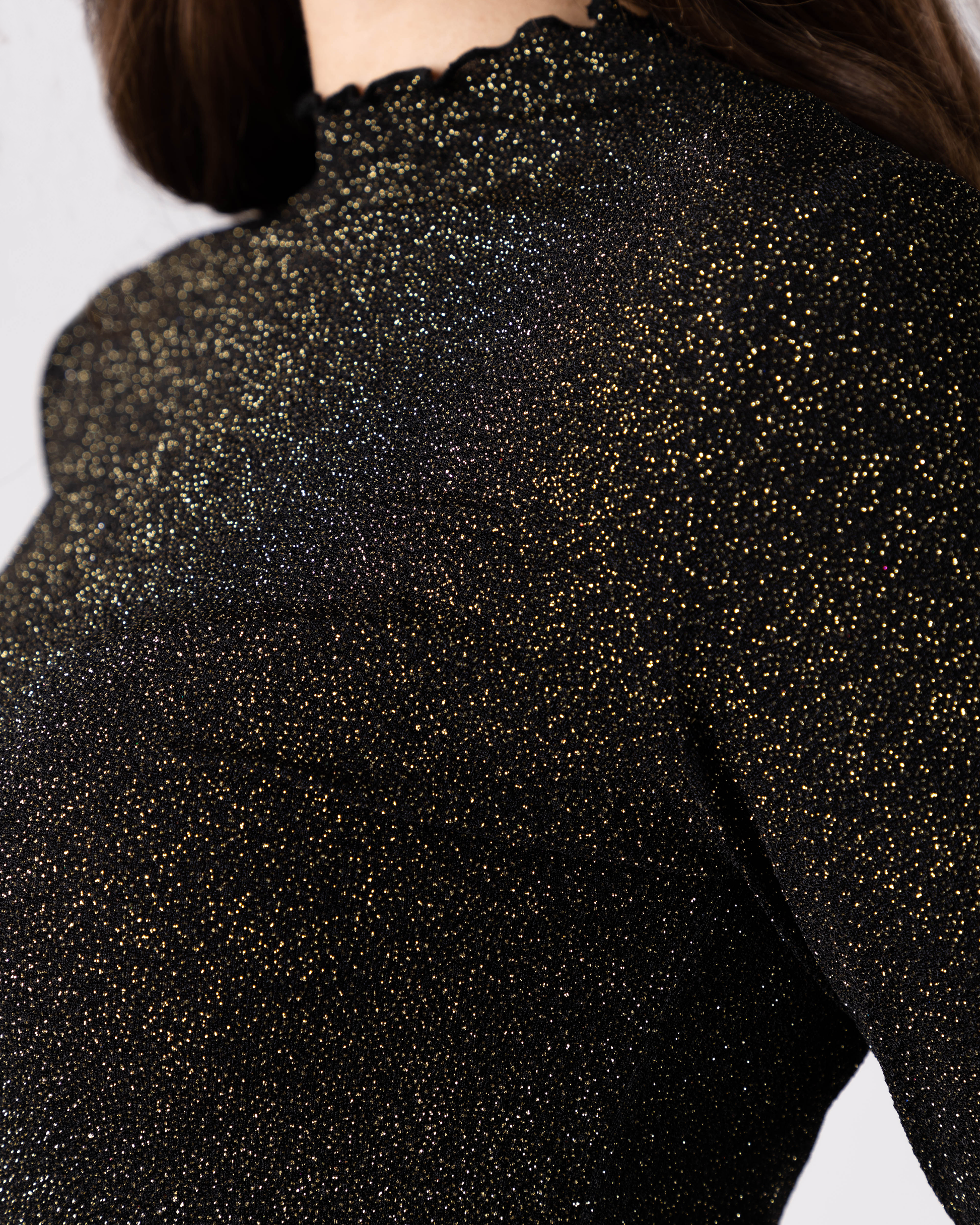 Високиот изрез и долгите ракави ја заокружуваат формата со јасна, минималистичка завршница, правејќи ја блузата лесна за комбинирање и доволно силна како самостојно парче.