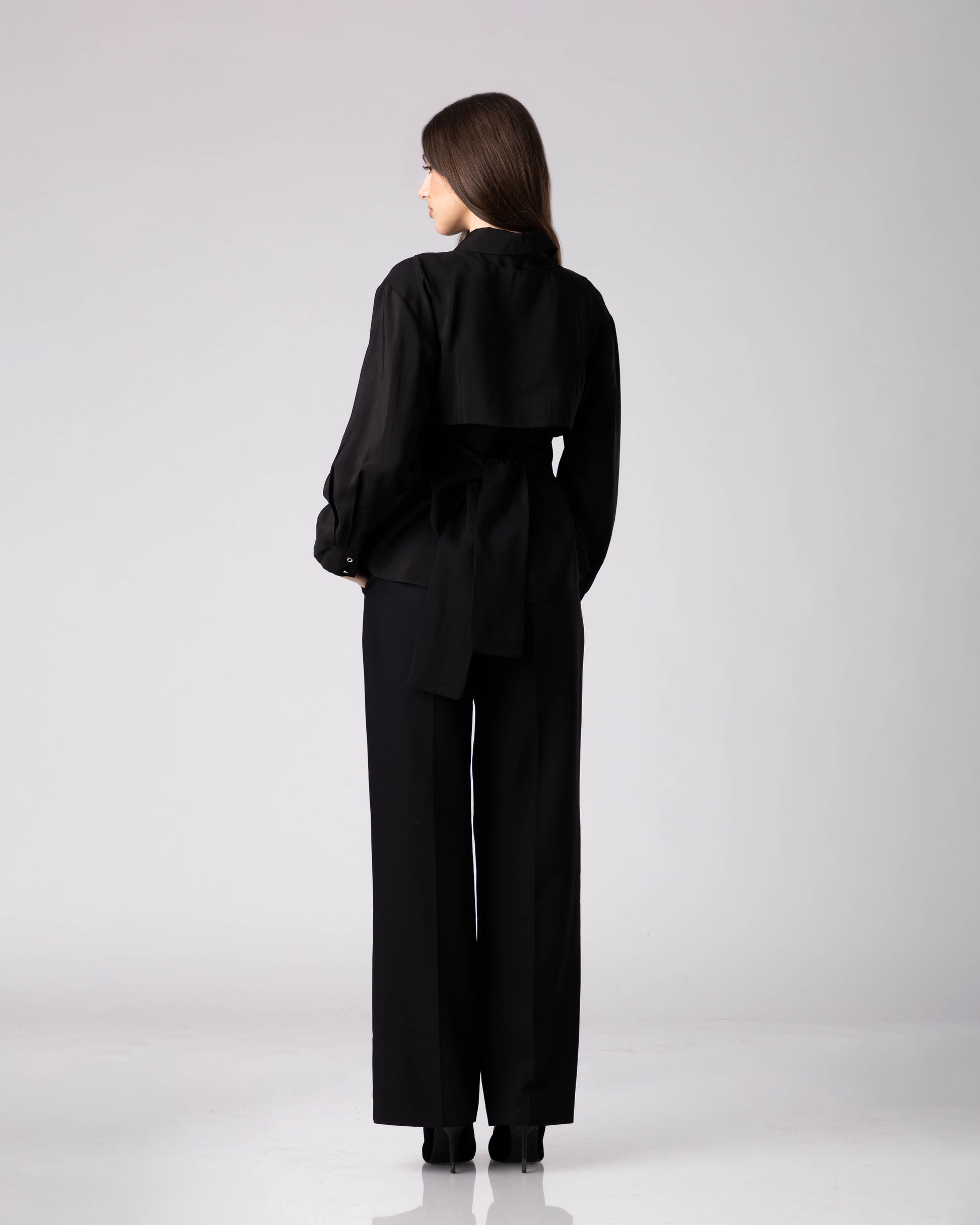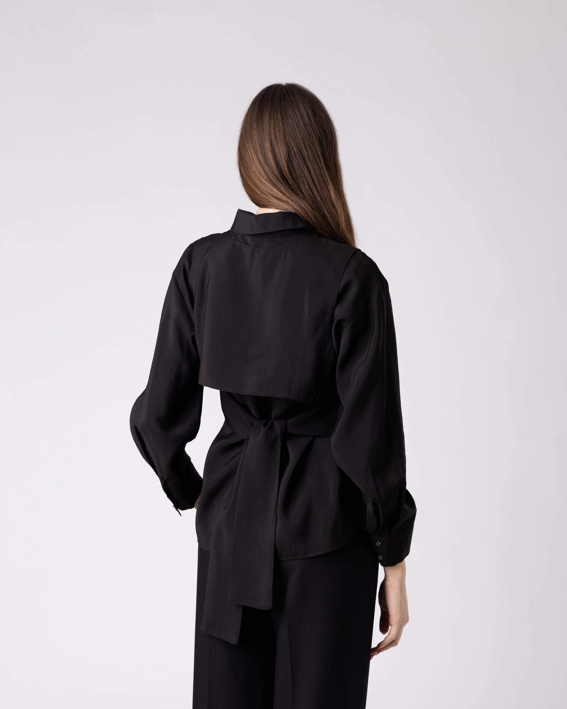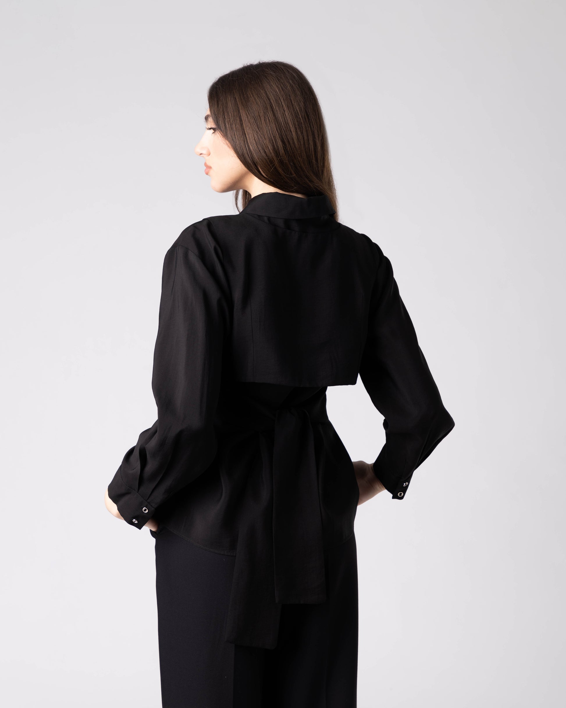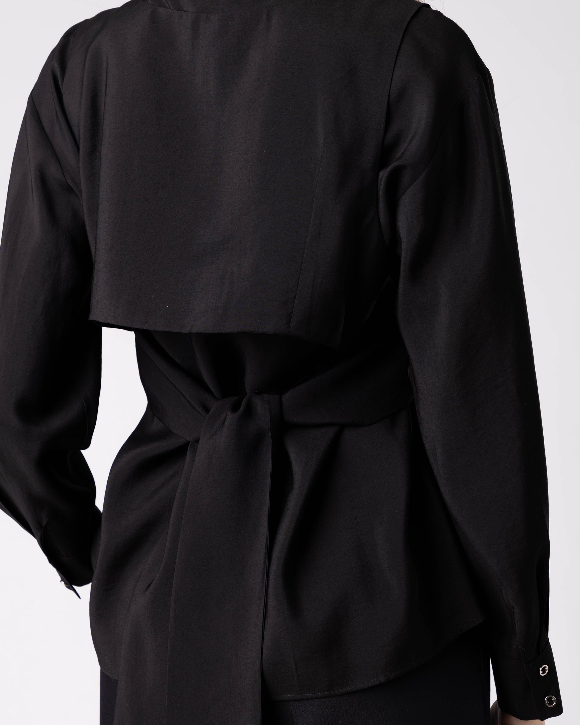 Дизајнот се издвојува со структурирана горна форма и дискретен преклоп напред, додека врзувањето на грбот овозможува прилагодување и суптилно нагласување на половината. Класичната јака и долгите ракави и даваат префинет, безвременски карактер.