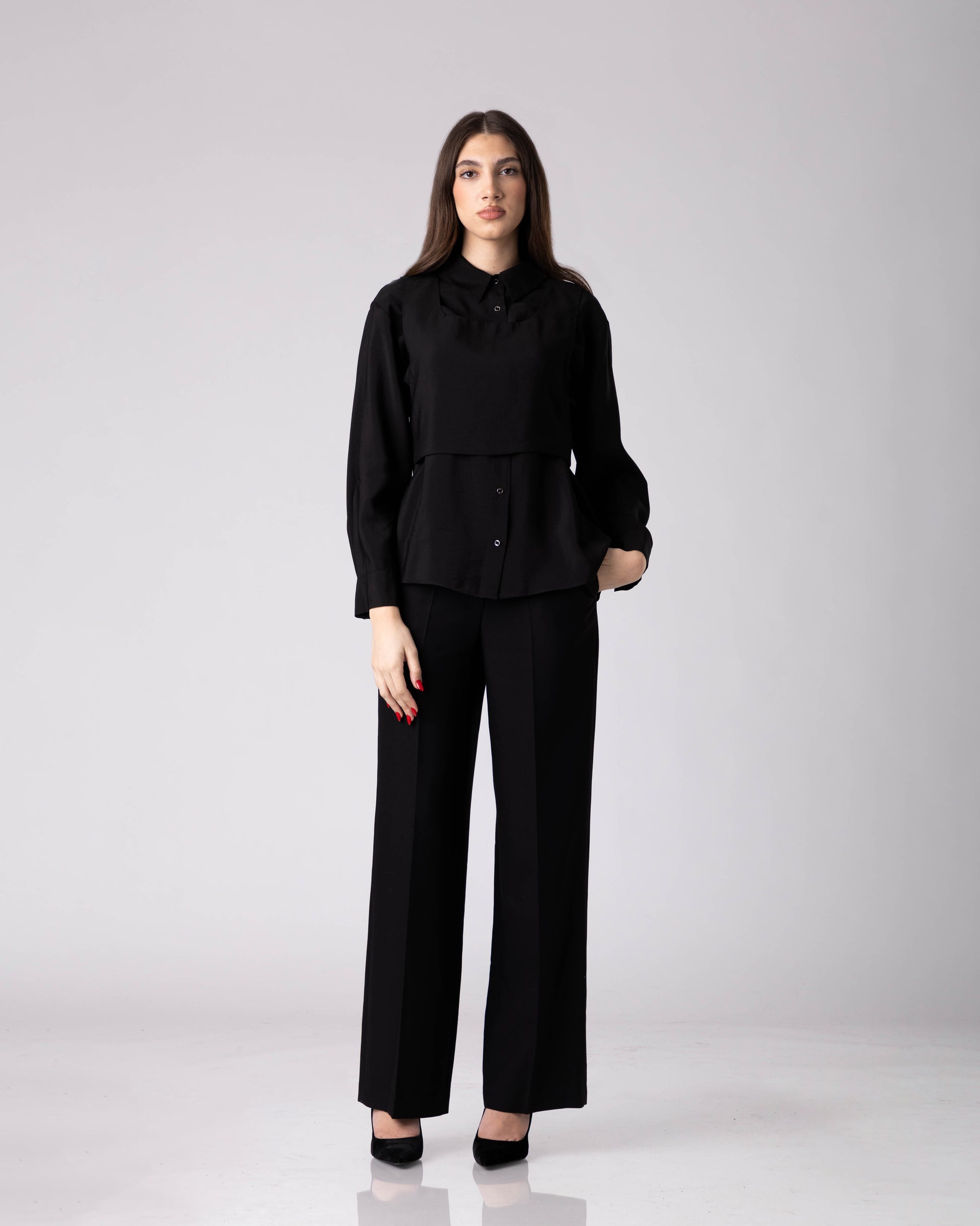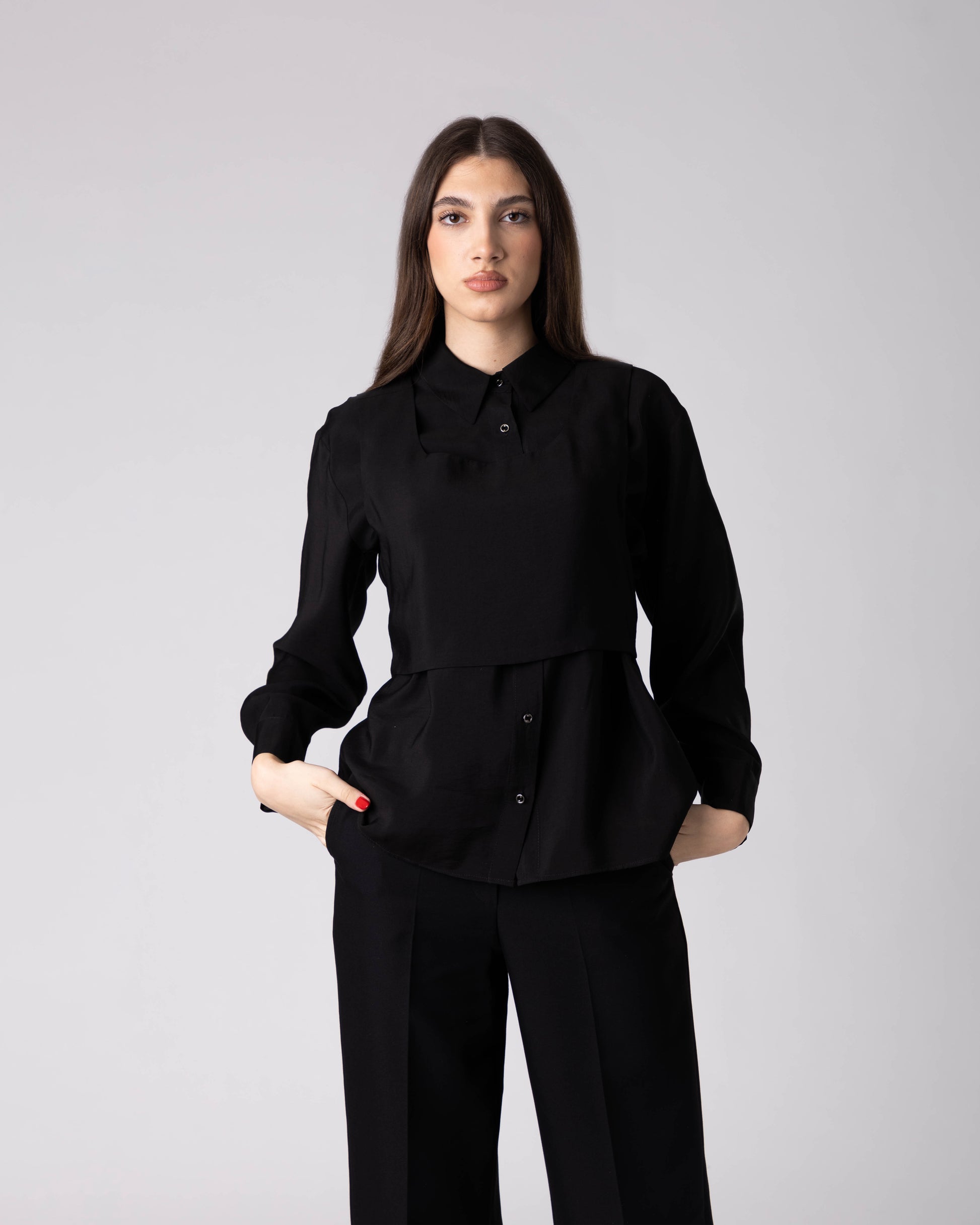 NOXIA е црна кошула со чиста линија и современ крој, создадена за елегантен и самоуверен изглед.