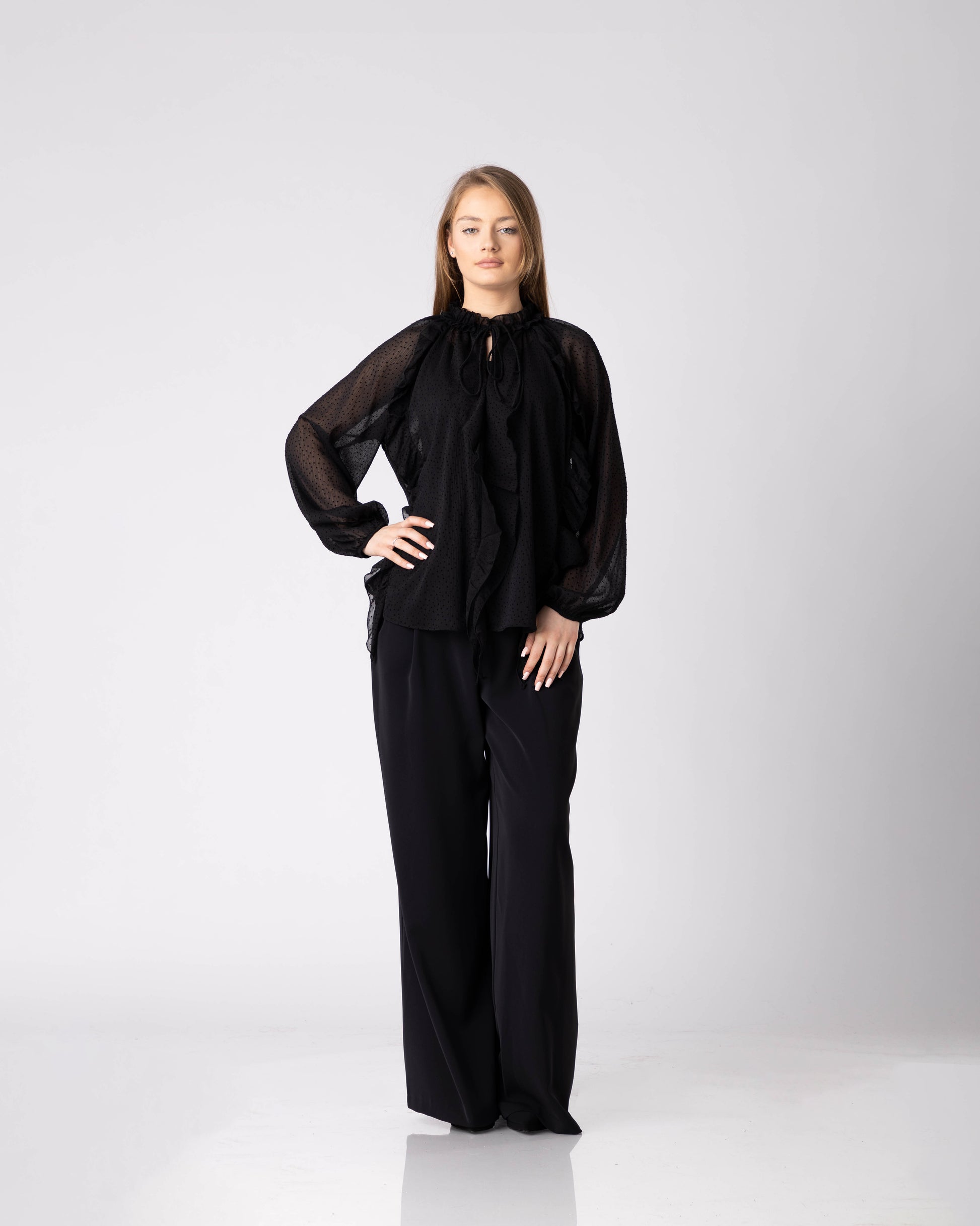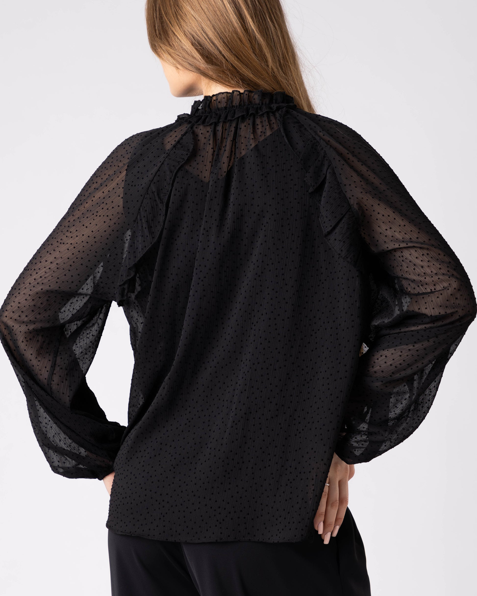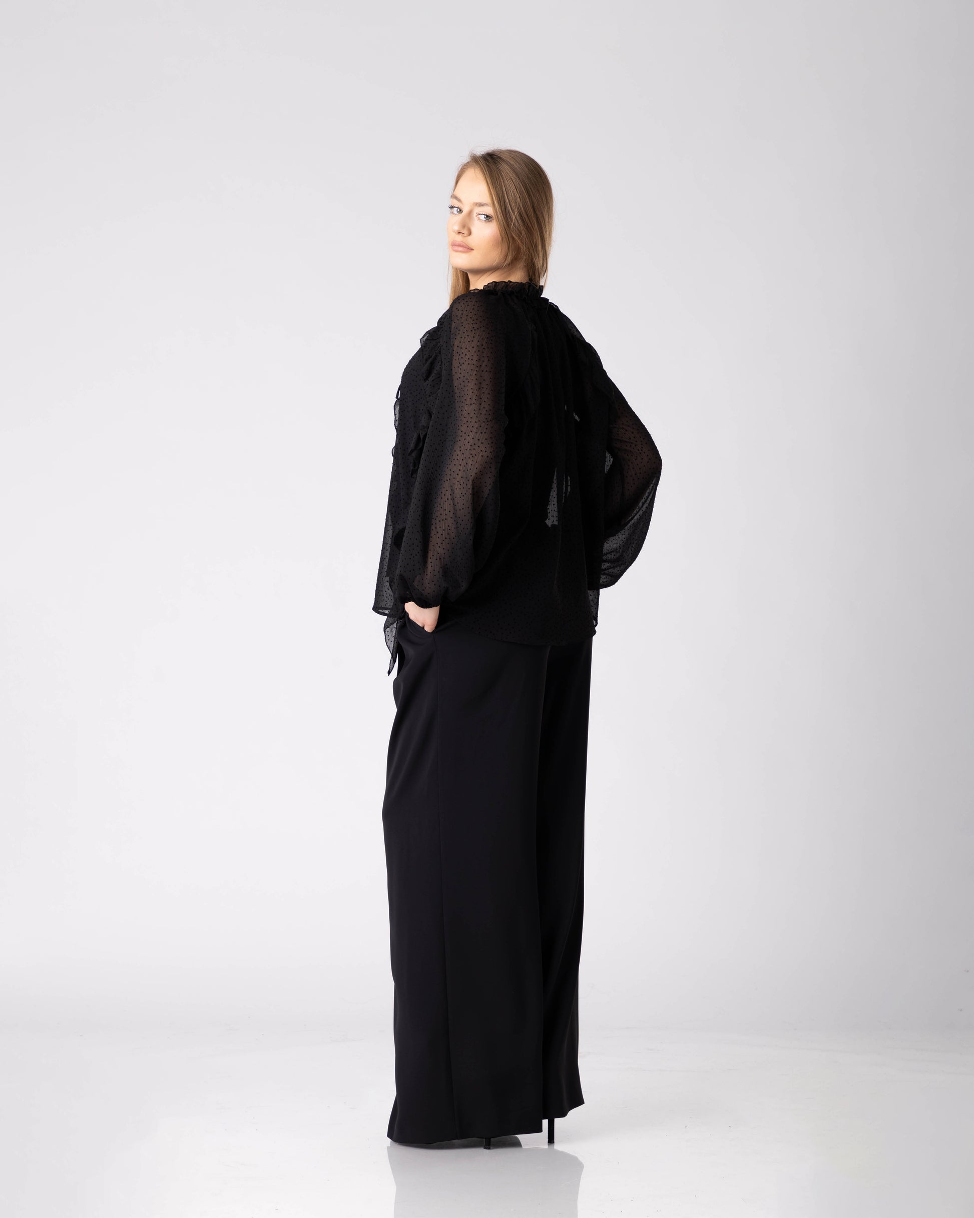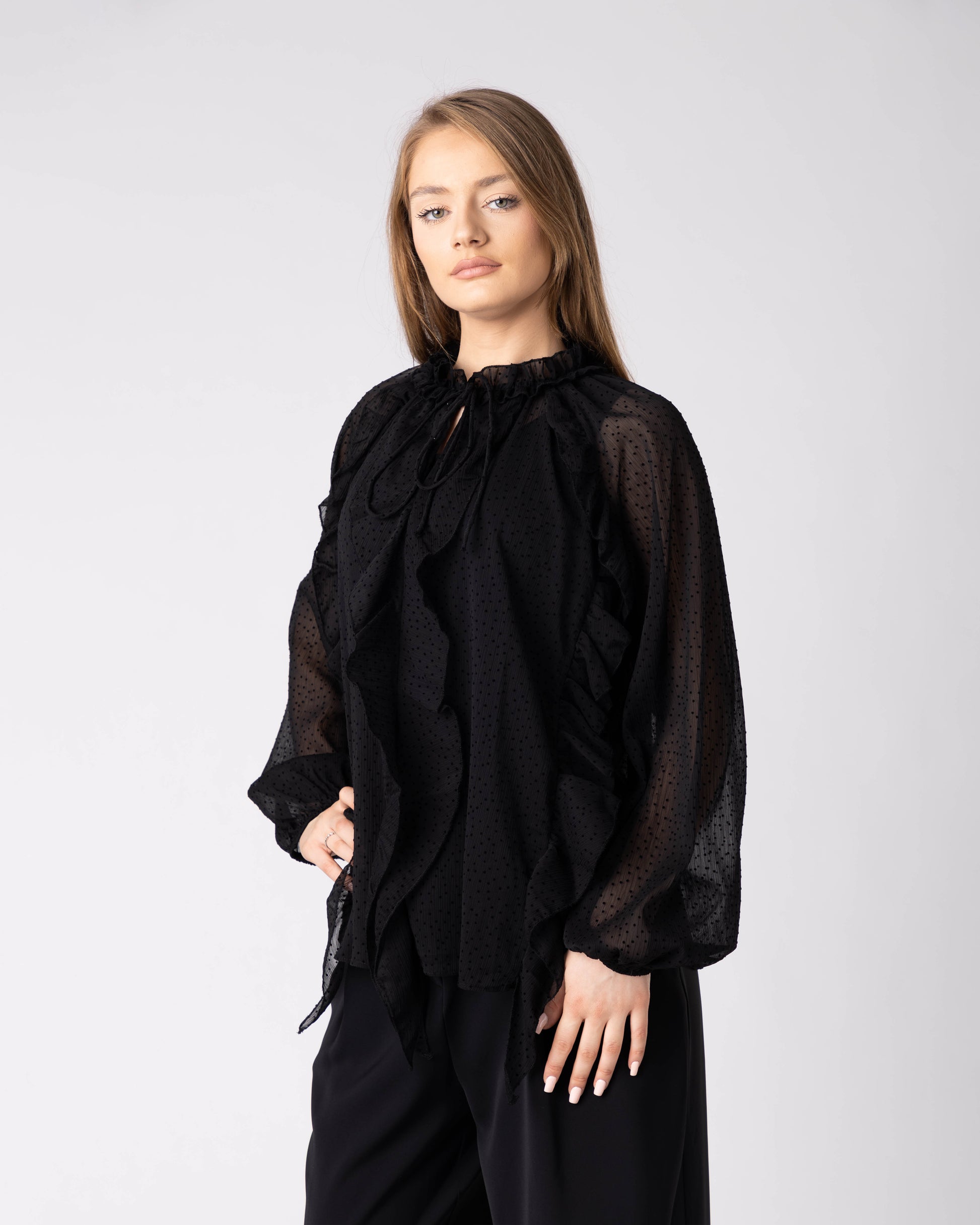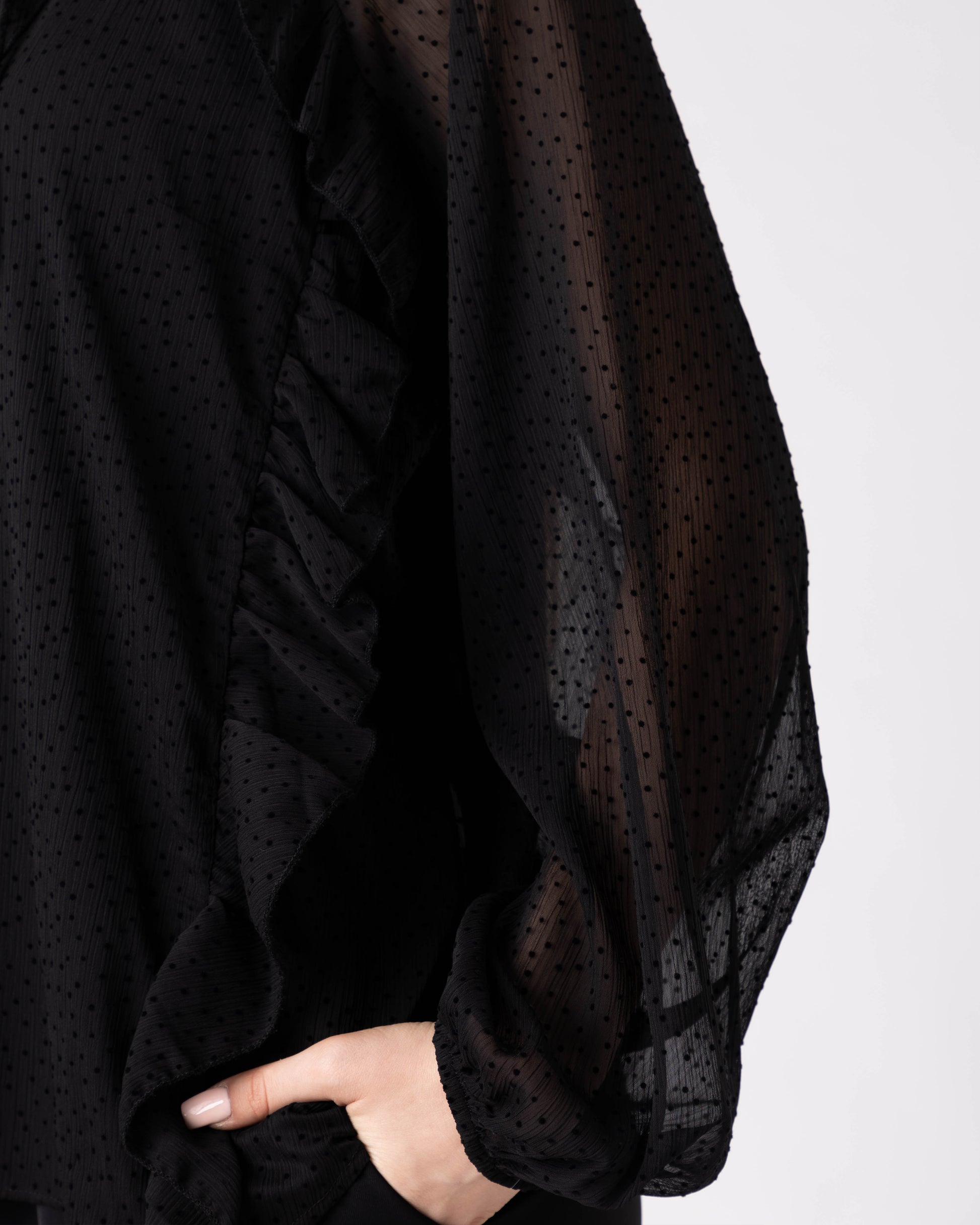 Изработена од лесен, полупроѕирен материјал со дискретна точкаста текстура, таа се одликува со меки, флуидни карнери кои природно ја следат линијата на телото. Набраниот изрез со врзување додава женствен акцент, додека обемните ракави создаваат лесна и елегантна силуета.