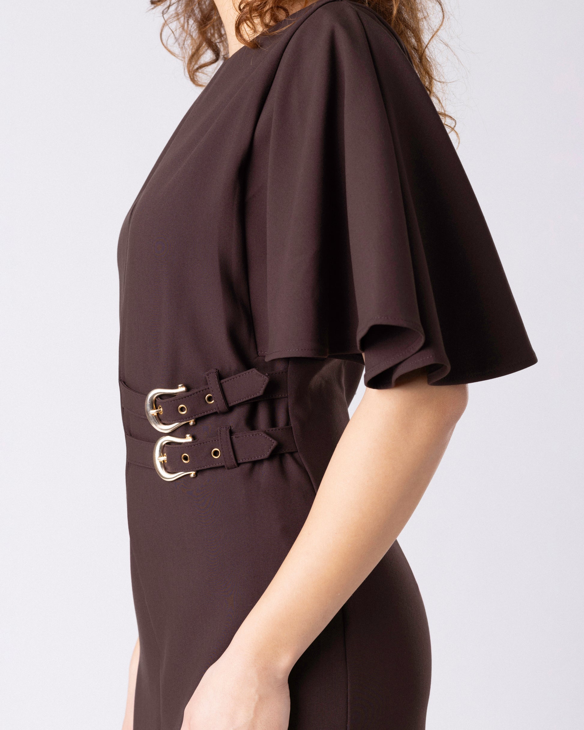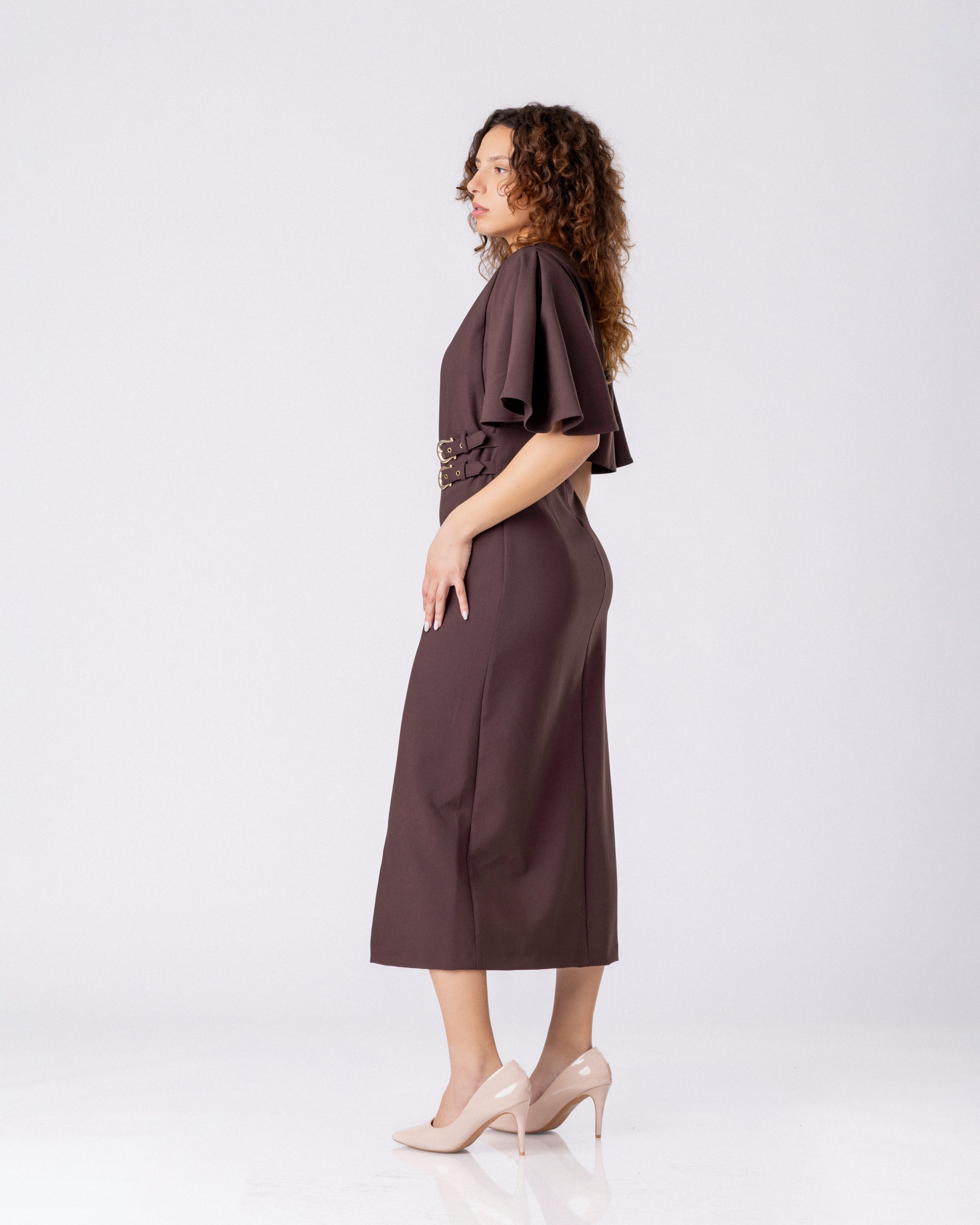 • Скулптурирана миди силуета во длабока чоколадно-кафеава нијанса