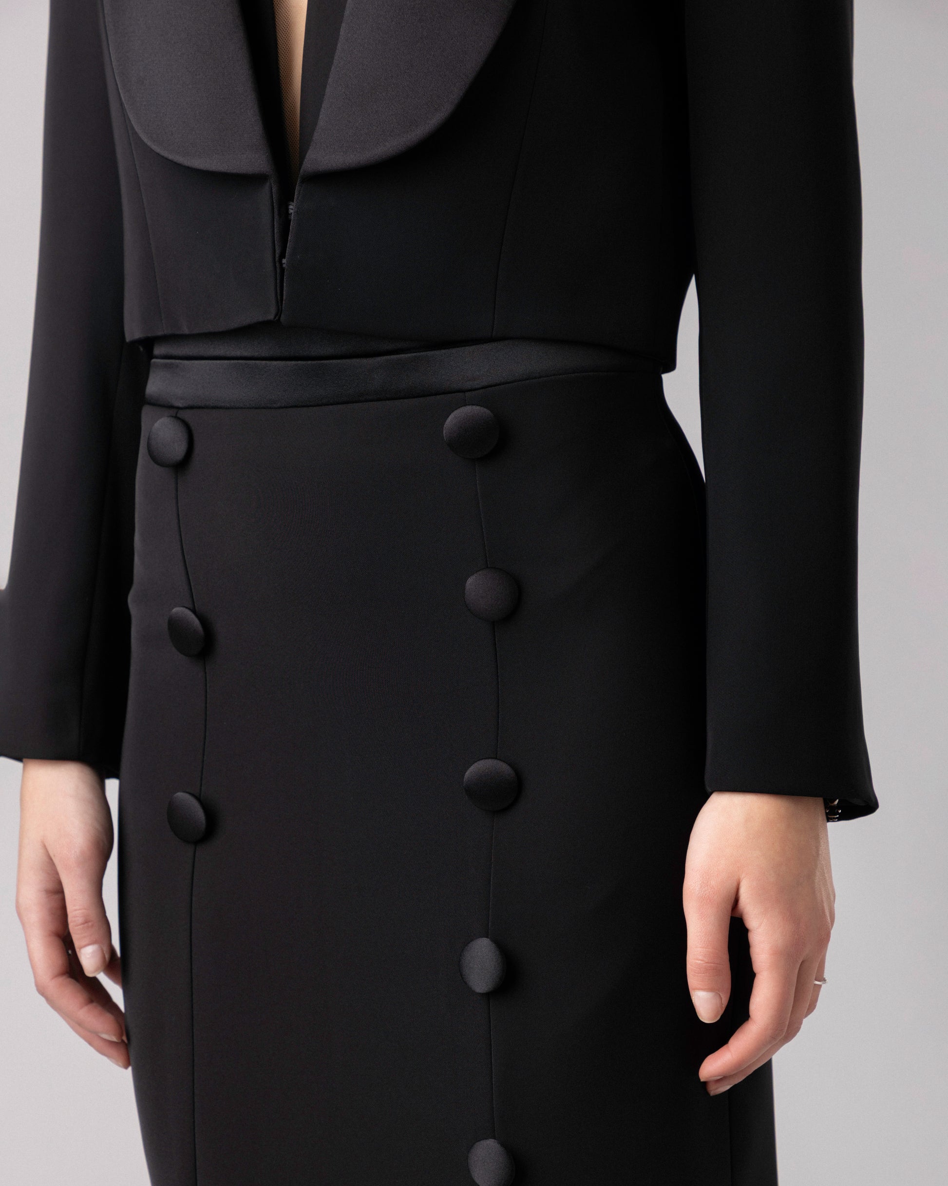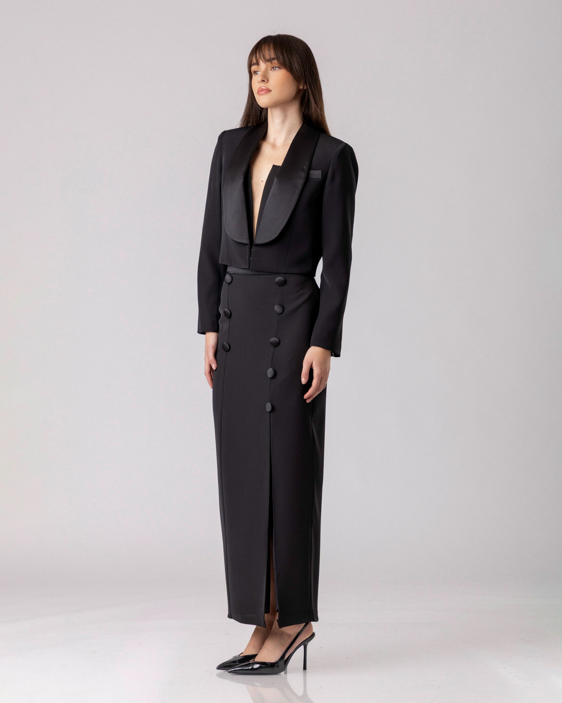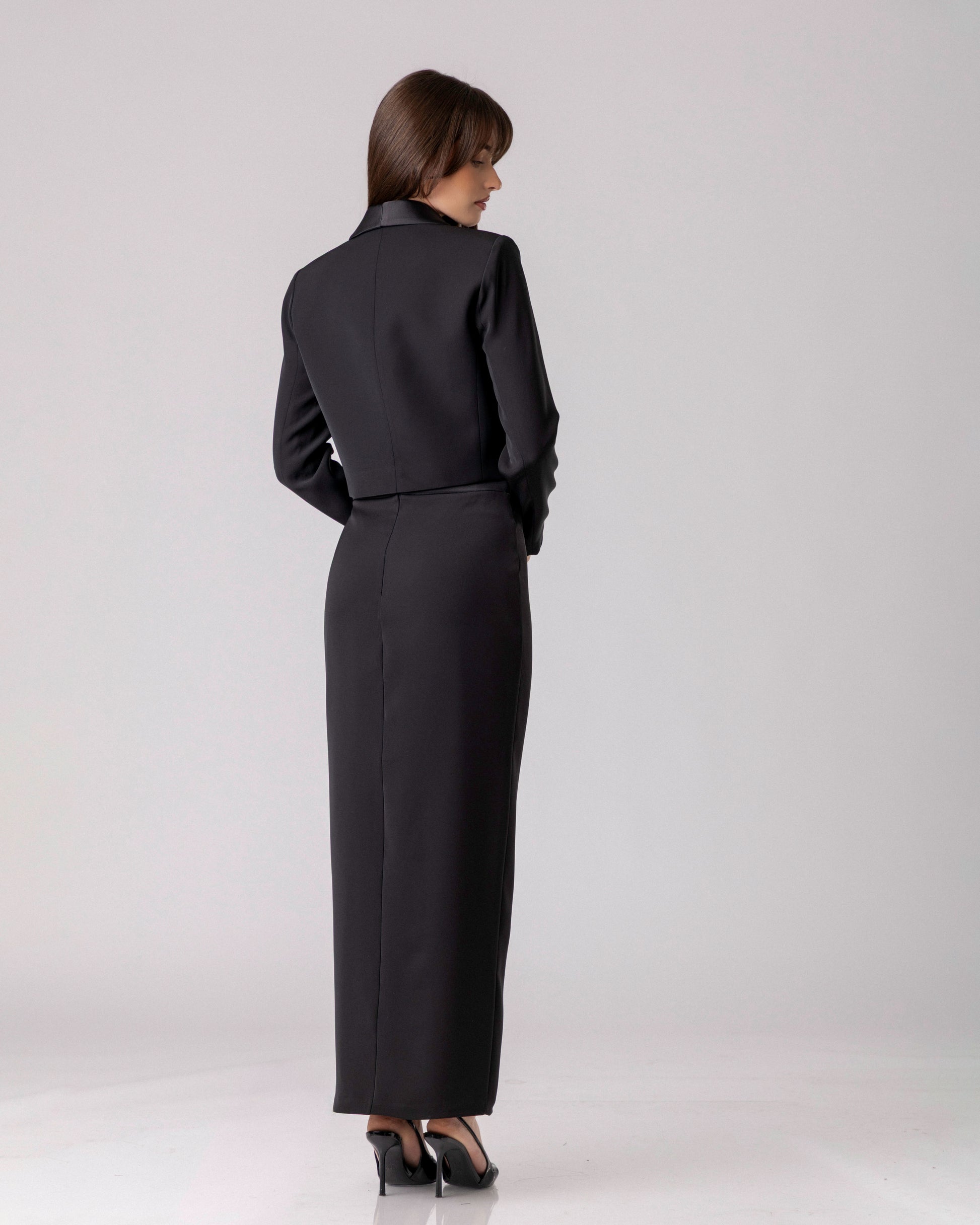 Блејзерот со изразени сатенски реверји внесува софистициран контраст, додека долгото здолниште со чиста линија и дискретни копчиња ја издолжува силуетата и создава чувство на рамнотежа и моќ.