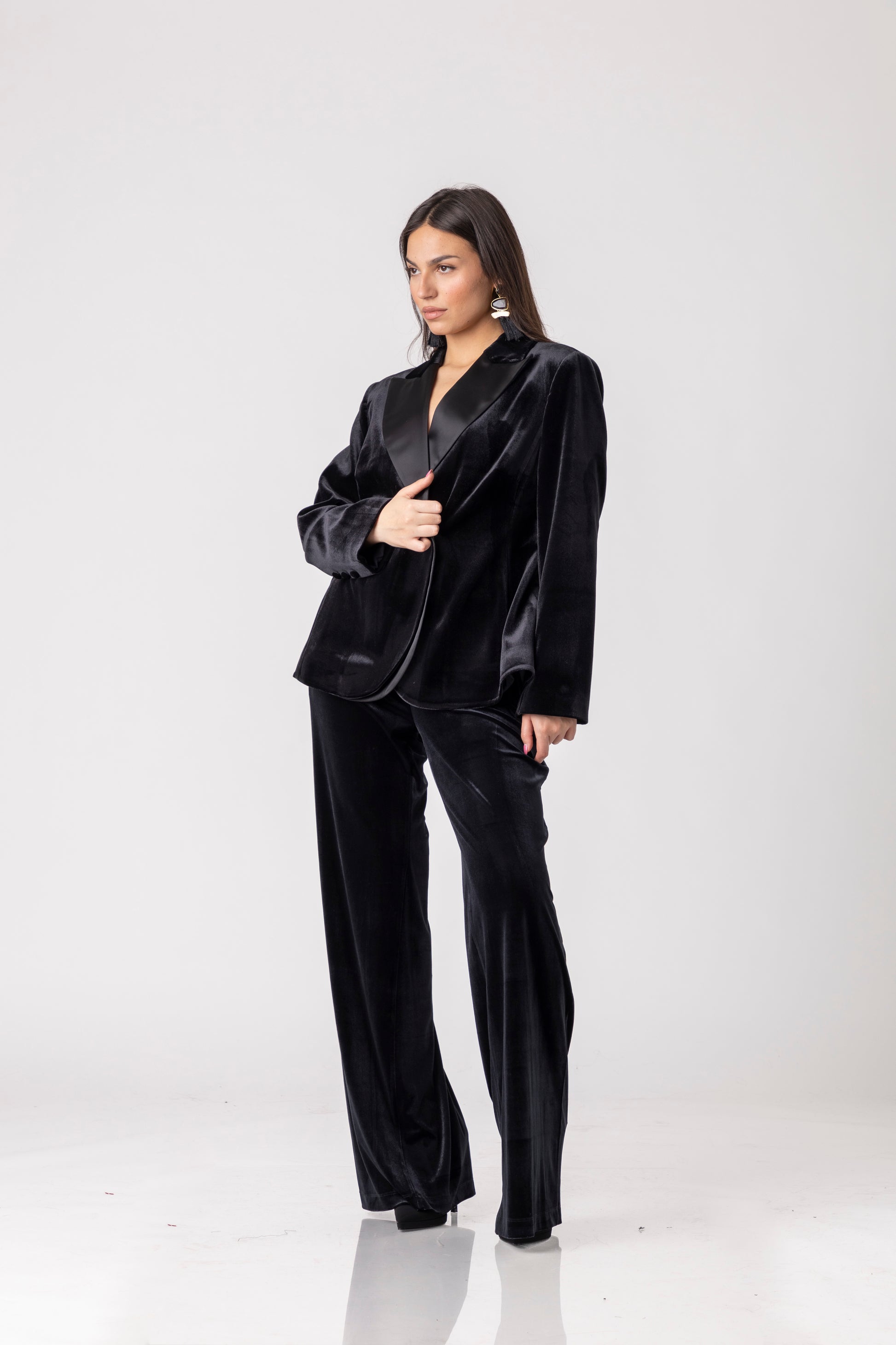 Панталоните Velour Flow се изработени од мек, кадифен материјал со дискретен сјај што создава флуидна и софистицирана силуета.