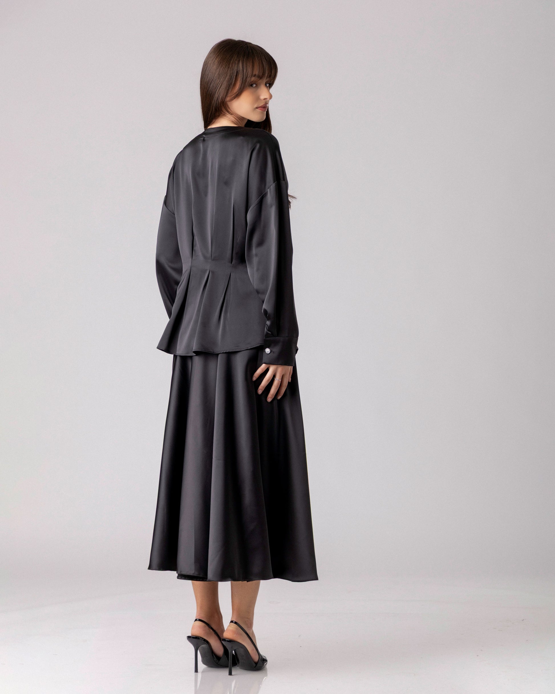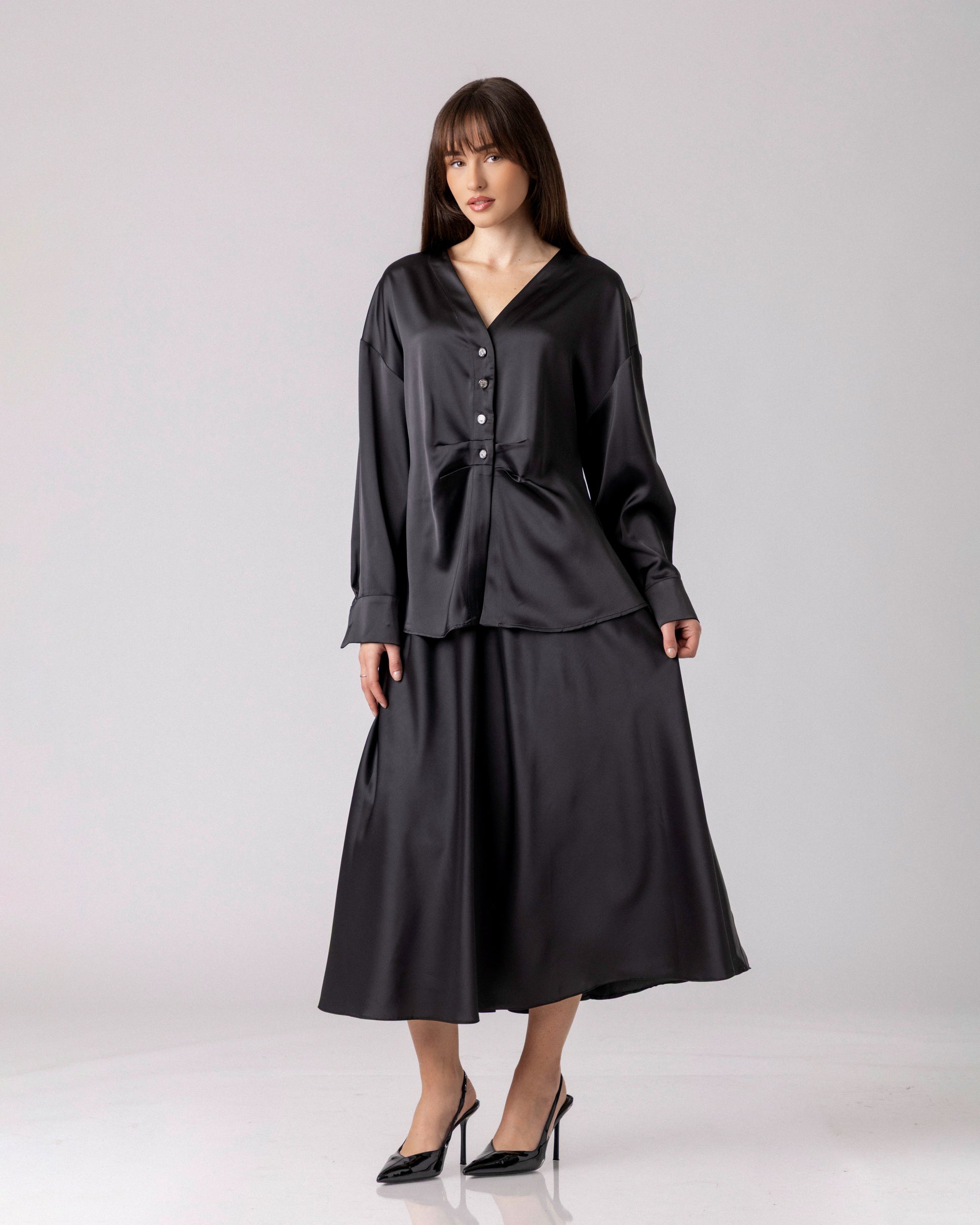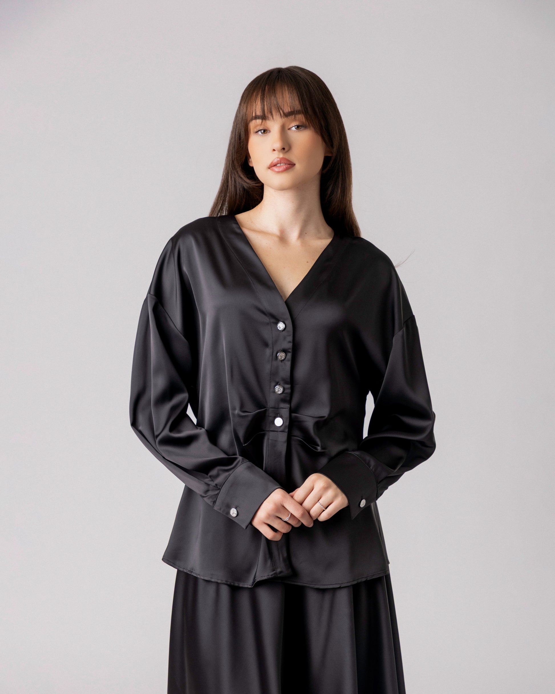 VELYN e eлегантна црна кошула со V-изрез и суптилно струкиран крој што нежно ја следи линијата на телото.