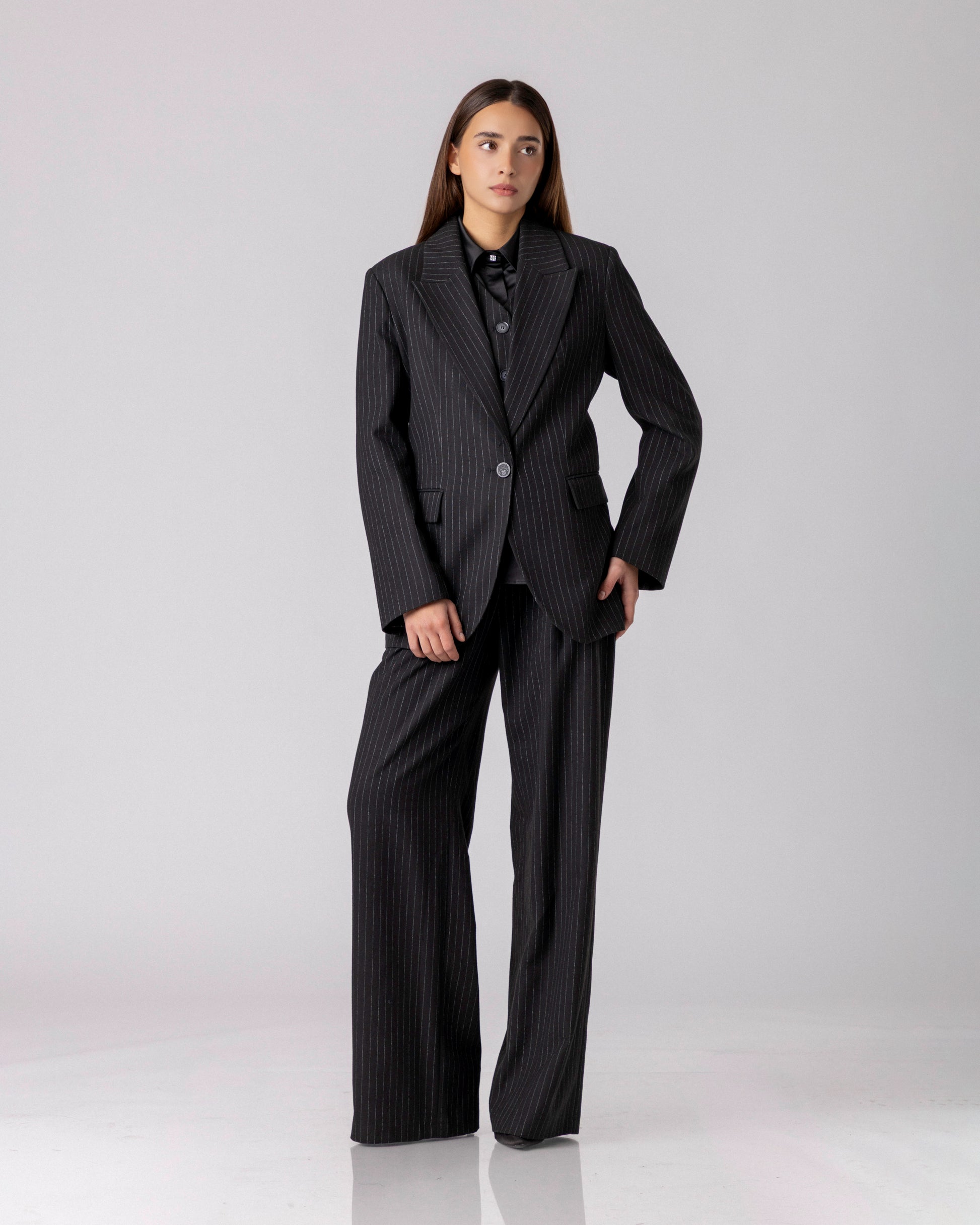 Класичните реверси и внимателно моделираната линија ја градат силуетата, додека суптилните пруги внесуваат длабочина и визуелна издолженост.